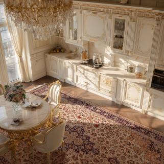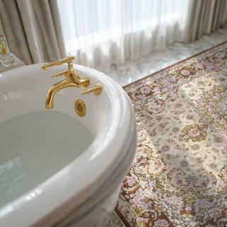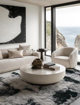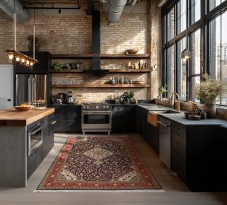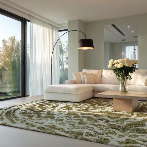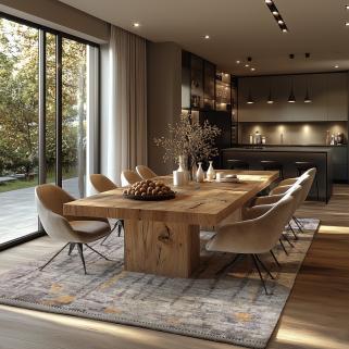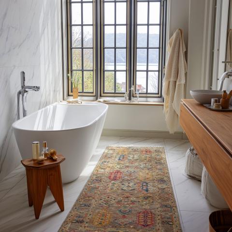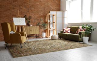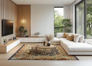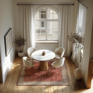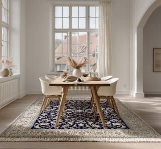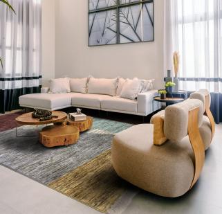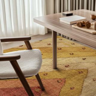 手織りラグは、クラシックな空間にも現代的な空間にも調和します。モダンなインテリアでは、シンプルな建築ラインと装飾的なラグとのコントラストが、空間に深みをもたらします。