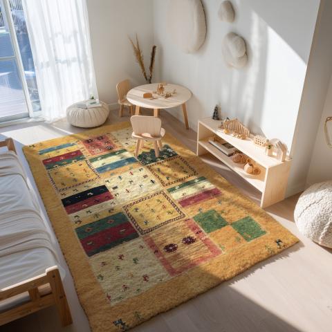 ギャッベ:比較的新しく、個性的なスタイルを持つペルシャラグの一種です。主に遊牧民によって手織りされ、やや粗めで柔らかなパイル、大きな色面、ミニマルなモチーフが特徴です。伝統的な手仕事と現代的なシンプルさ、そして遊牧文化を融合させています。