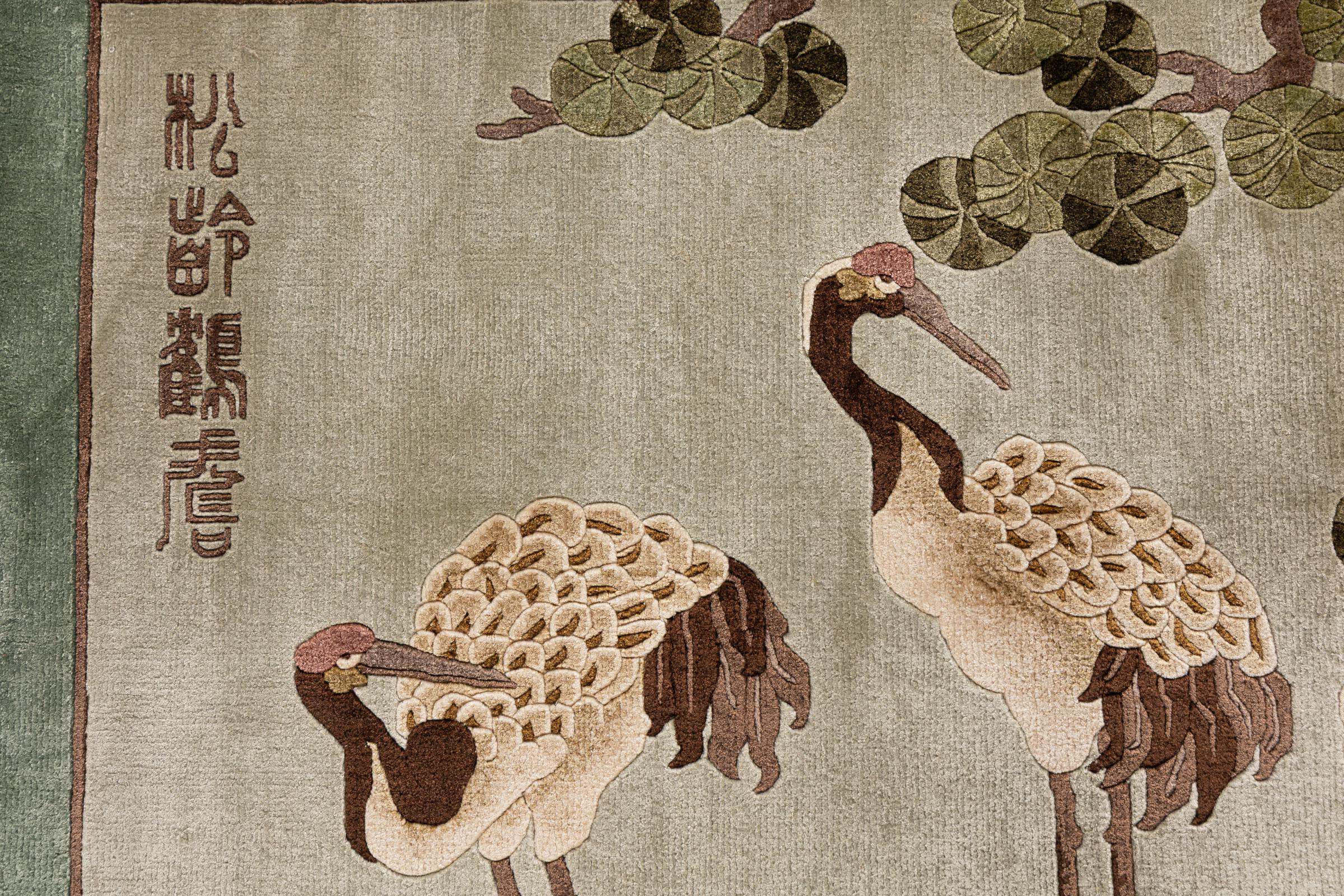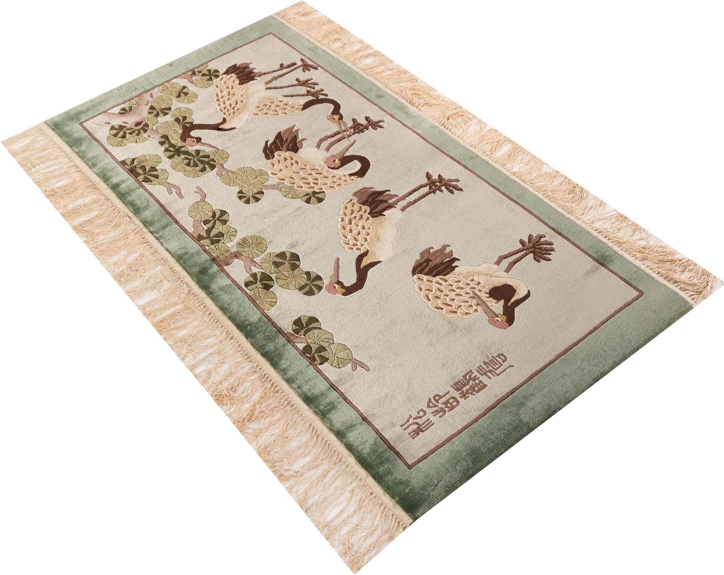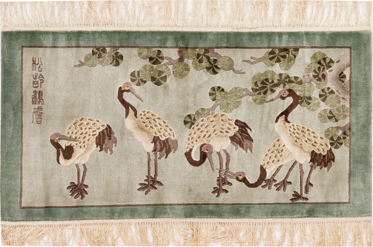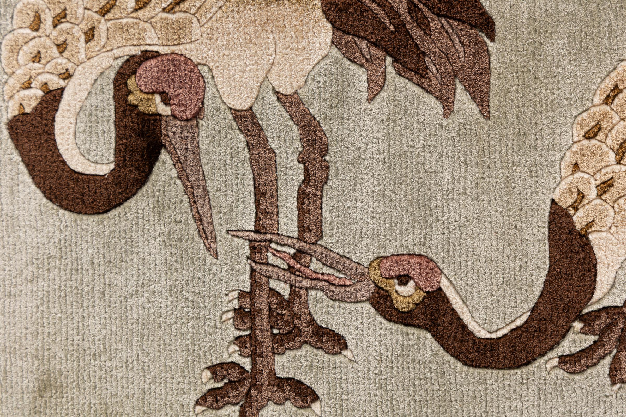 この中国製のカーペットはピュアシルクから手織りされており、その美しい輝きが印象的です。極東のデザインは中国のファンを喜ばせるだけではありません。このようなカーペットは、何世紀にもわたるカーペット文化から生まれた真の贅沢を表しています。