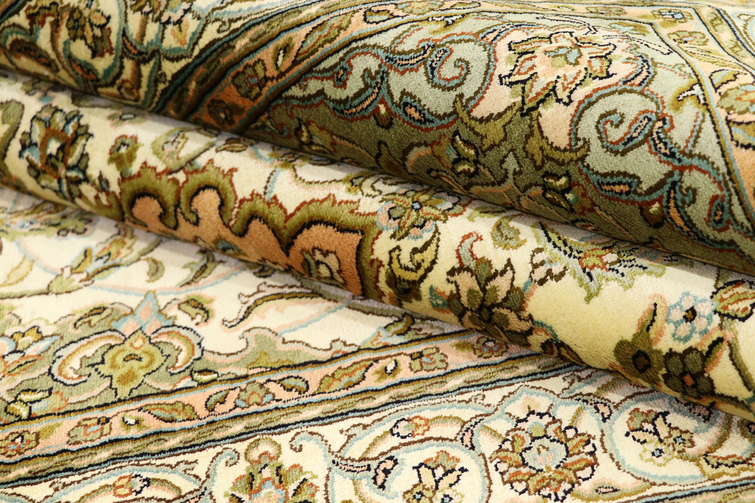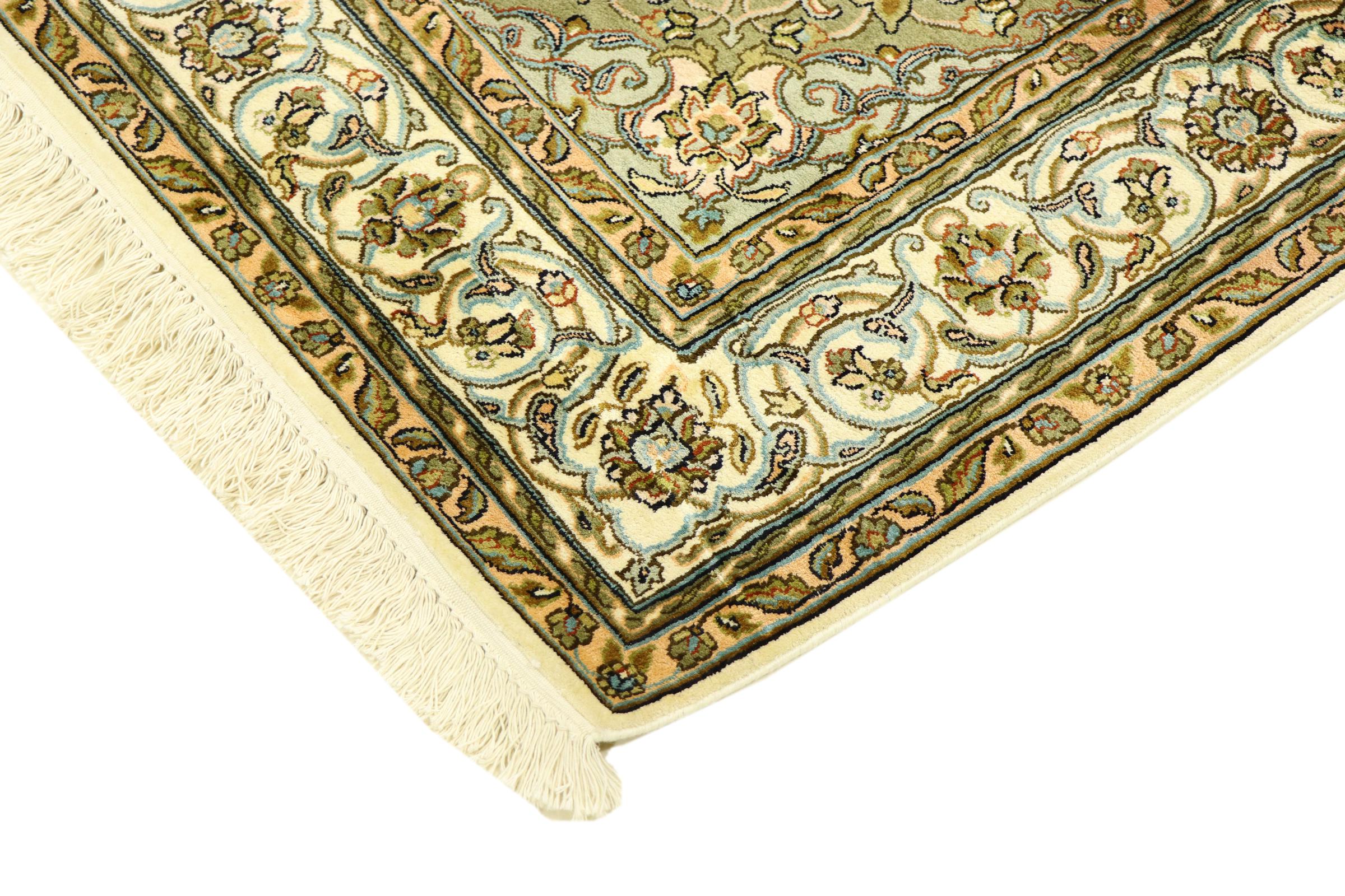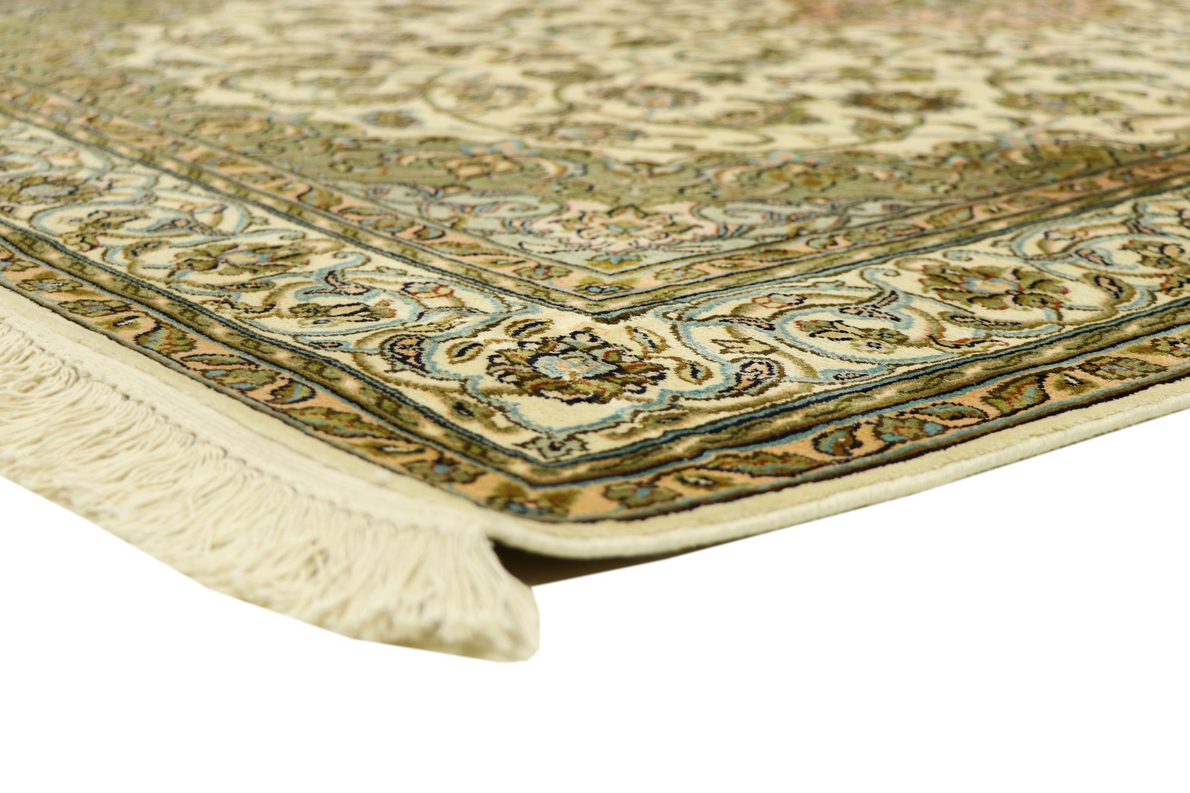 このカシミール産の手織りシルク カーペットは、インドの絨毯織り職人の技術を反映しています。純粋な絹であるだけでなく、結び目の密度が非常に細かいため、このような作品を作成できるのは経験豊富な織り手だけです。上質な天然シルクが魅力です。特に柔らかな感触を与えるだけでなく、その色はさまざまな面で輝きます。光の入射に応じて、まったく新しいディテールと色が現れ、今後何年も印象に残り続けるでしょう。このようなカーペットを何時間も眺めていると、時間を忘れてしまいます。写真では表現できない体験です。