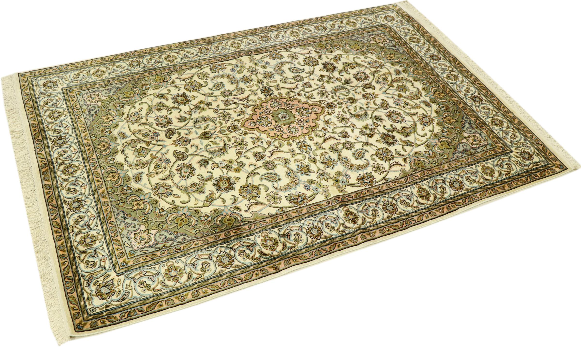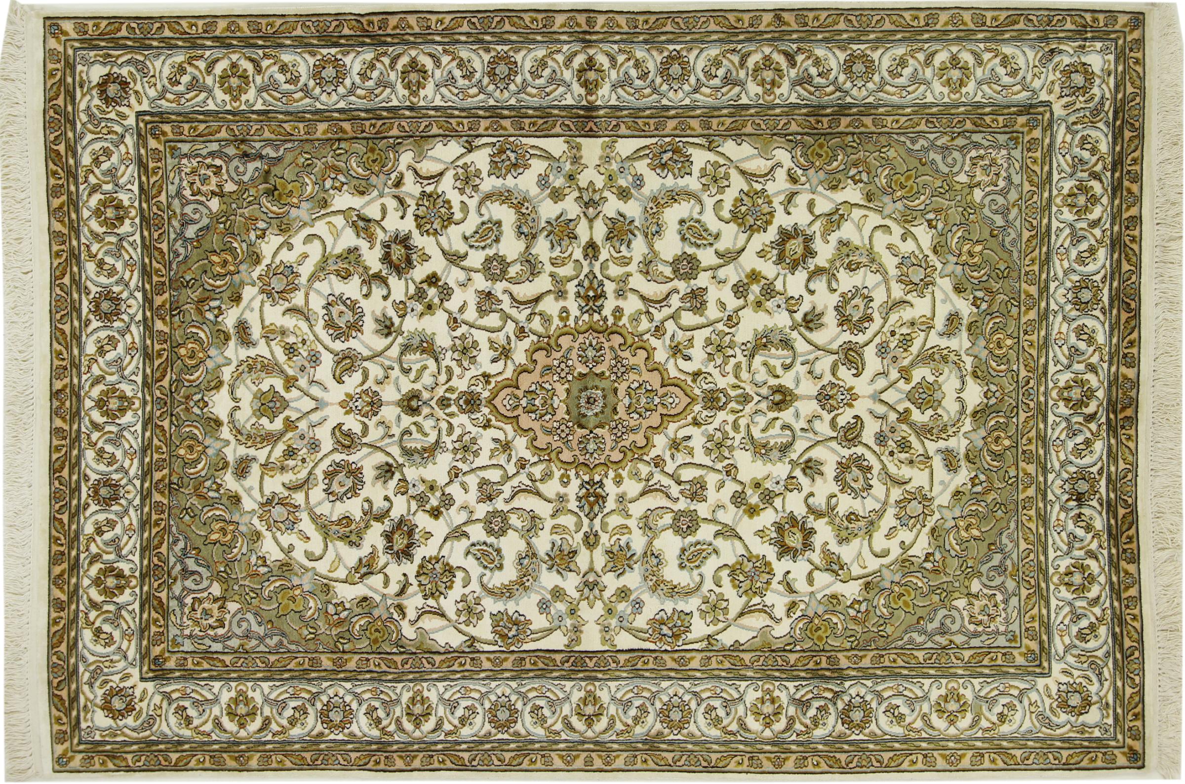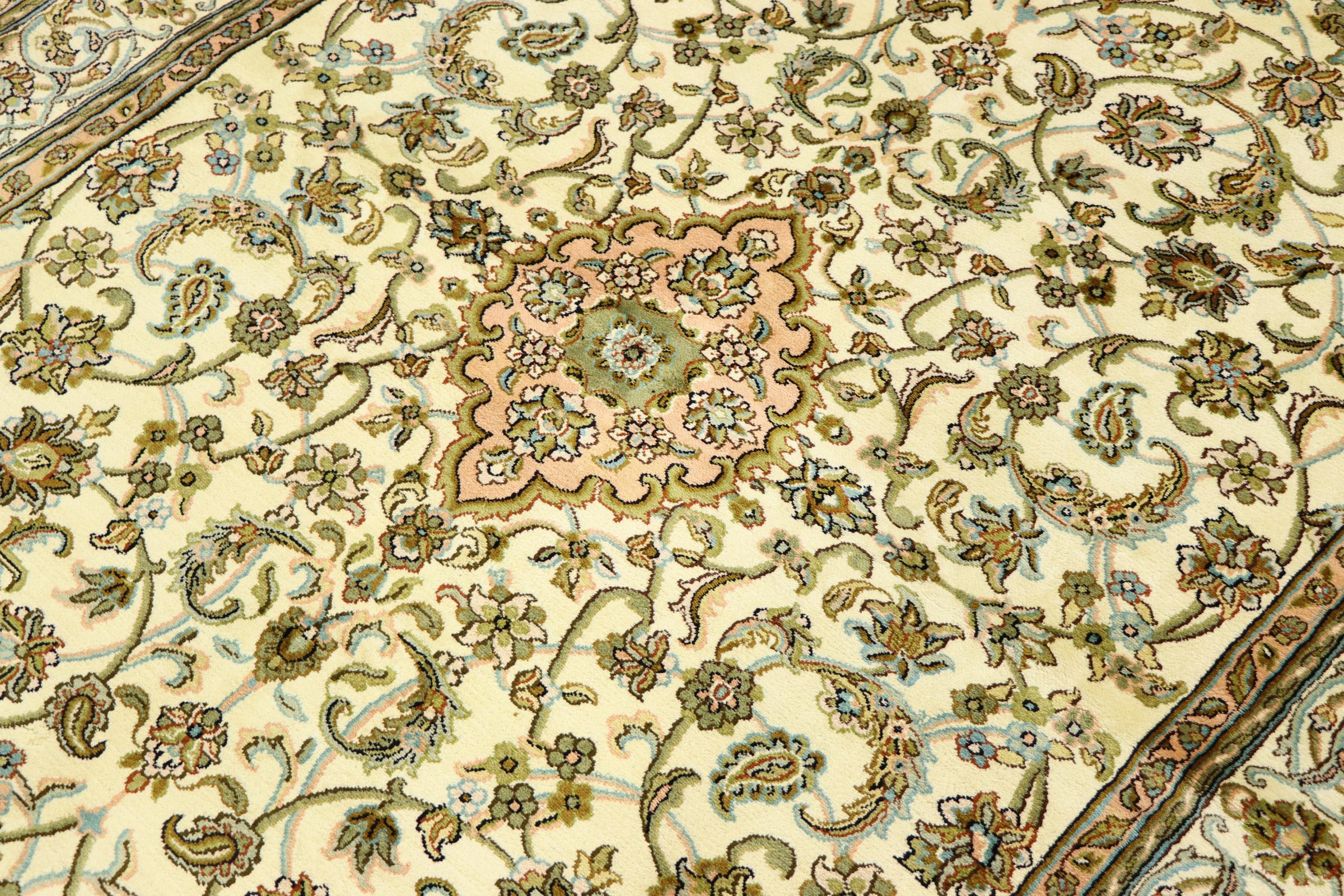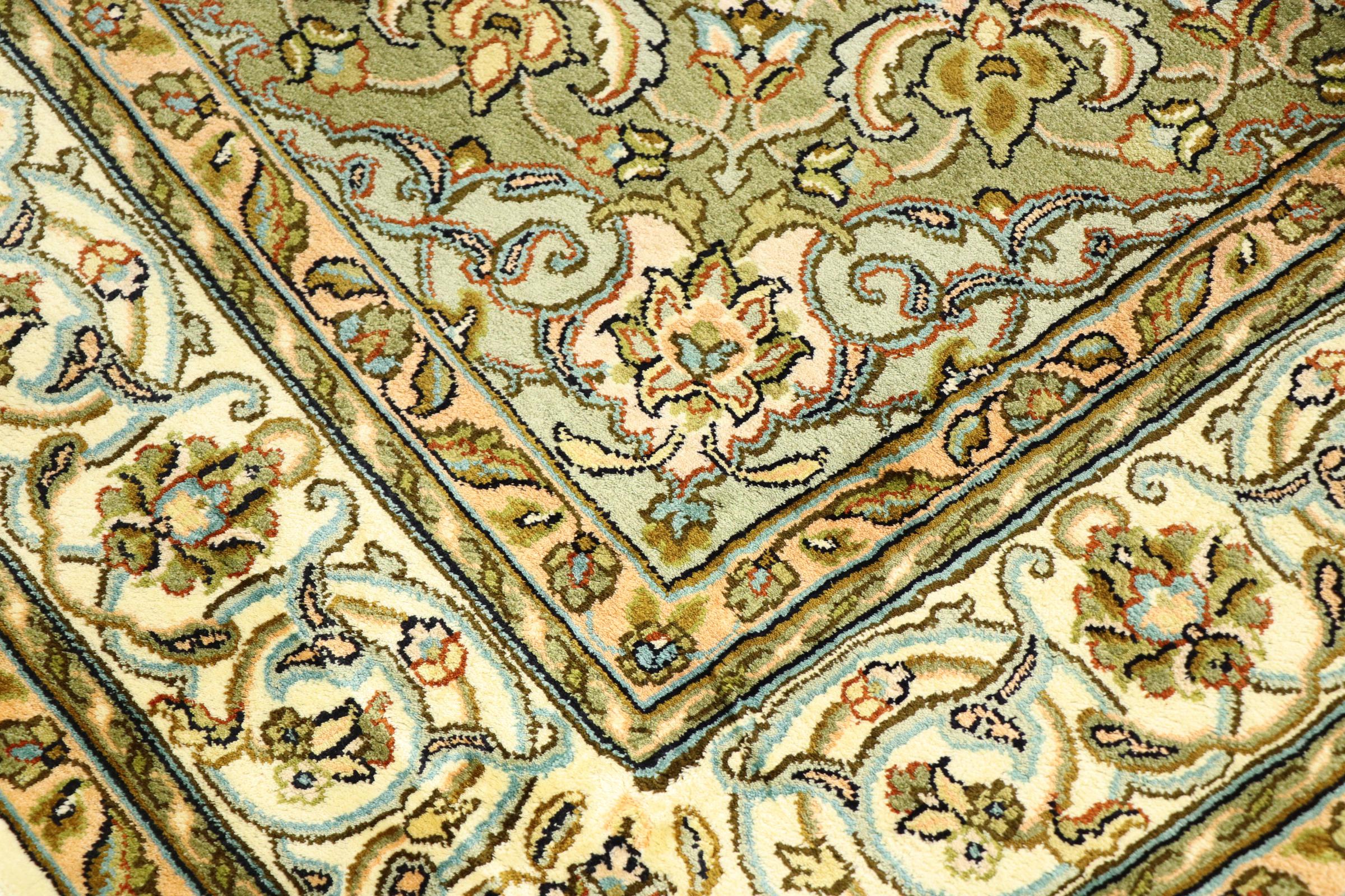 このカシミール産の手織りシルク カーペットは、インドの絨毯織り職人の技術を反映しています。純粋な絹であるだけでなく、結び目の密度が非常に細かいため、このような作品を作成できるのは経験豊富な織り手だけです。上質な天然シルクが魅力です。特に柔らかな感触を与えるだけでなく、その色はさまざまな面で輝きます。光の入射に応じて、まったく新しいディテールと色が現れ、今後何年も印象に残り続けるでしょう。このようなカーペットを何時間も眺めていると、時間を忘れてしまいます。写真では表現できない体験です。
