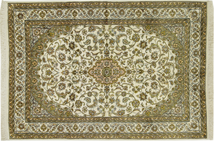 カーペットID 314132001101817 サイズ 185x131 cm 厚さ: およそ 7 mm 密度: 640 000 / m²平方メートル 生産: 手織り 織り目: 絹、シルク 整径: コットン 原産地: インド 年代: 新品 重さ: およそ 7 kg 在庫: ユニーク品 - 在庫 1 点のみ