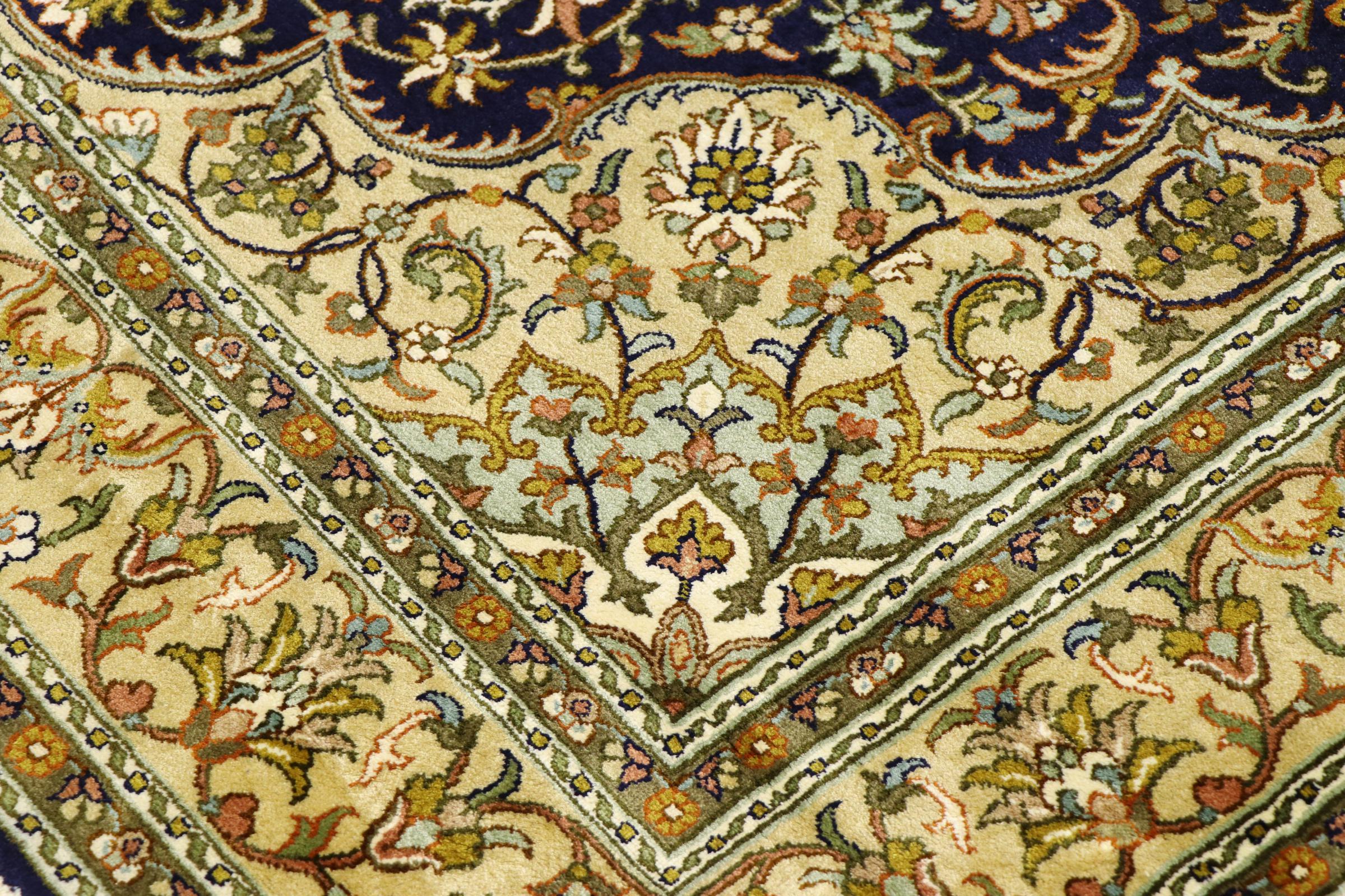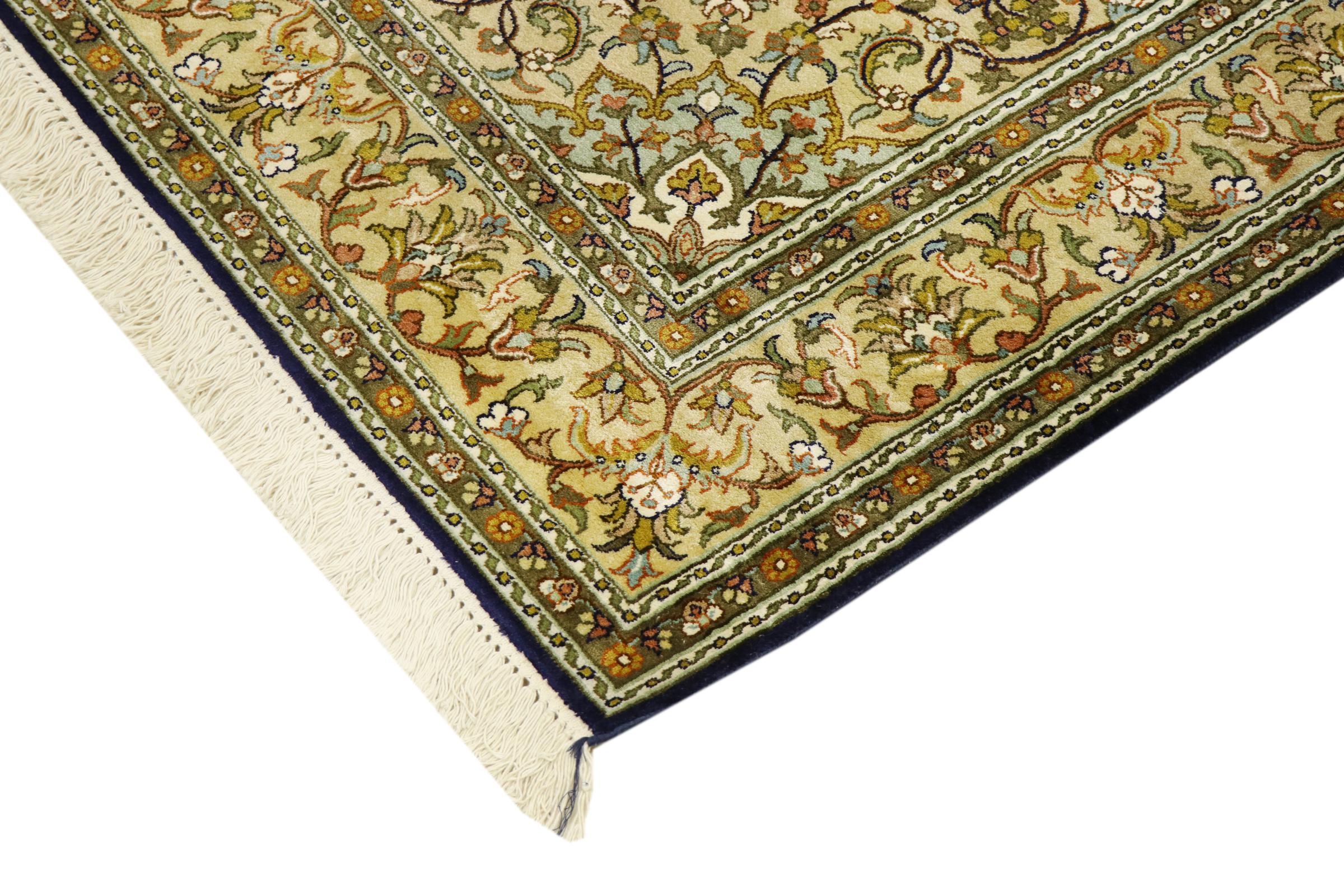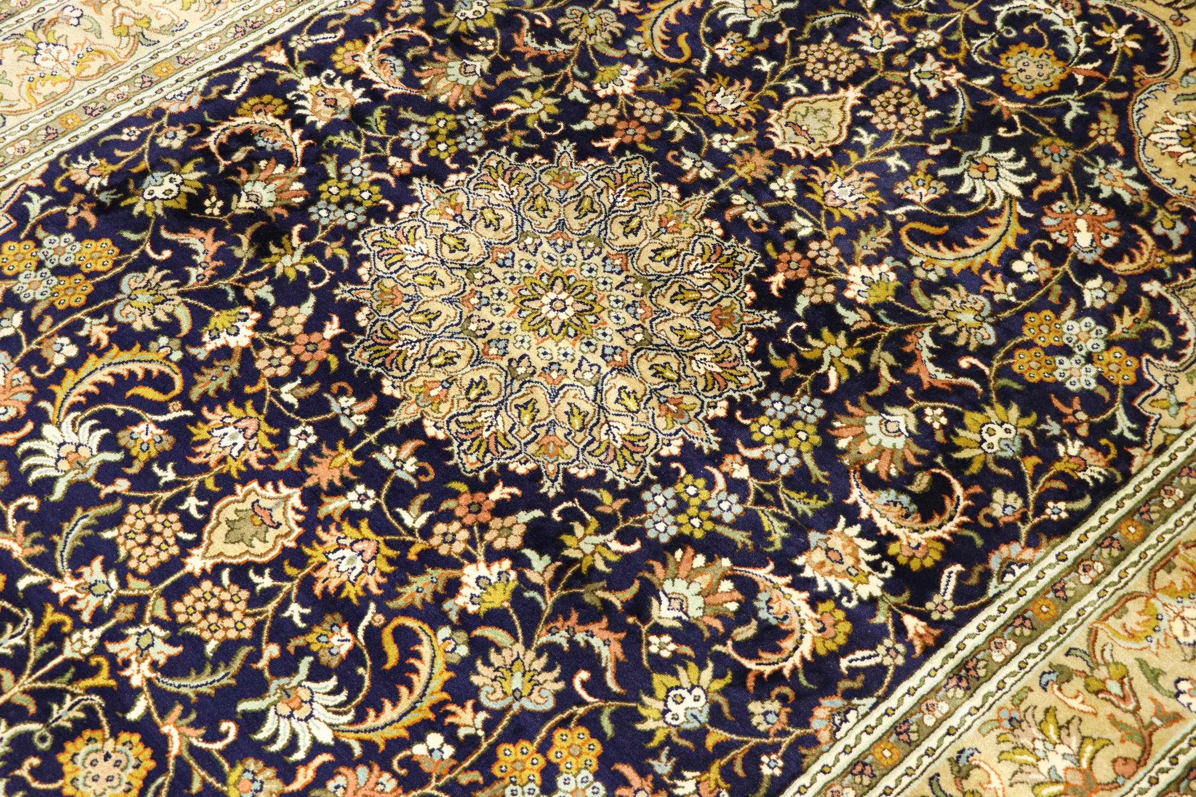 このカシミール産の手織りシルク カーペットは、インドの絨毯織り職人の技術を反映しています。純粋な絹であるだけでなく、結び目の密度が非常に細かいため、このような作品を作成できるのは経験豊富な織り手だけです。上質な天然シルクが魅力です。特に柔らかな感触を与えるだけでなく、その色はさまざまな面で輝きます。光の入射に応じて、まったく新しいディテールと色が現れ、今後何年も印象に残り続けるでしょう。このようなカーペットを何時間も眺めていると、時間を忘れてしまいます。写真では表現できない体験です。