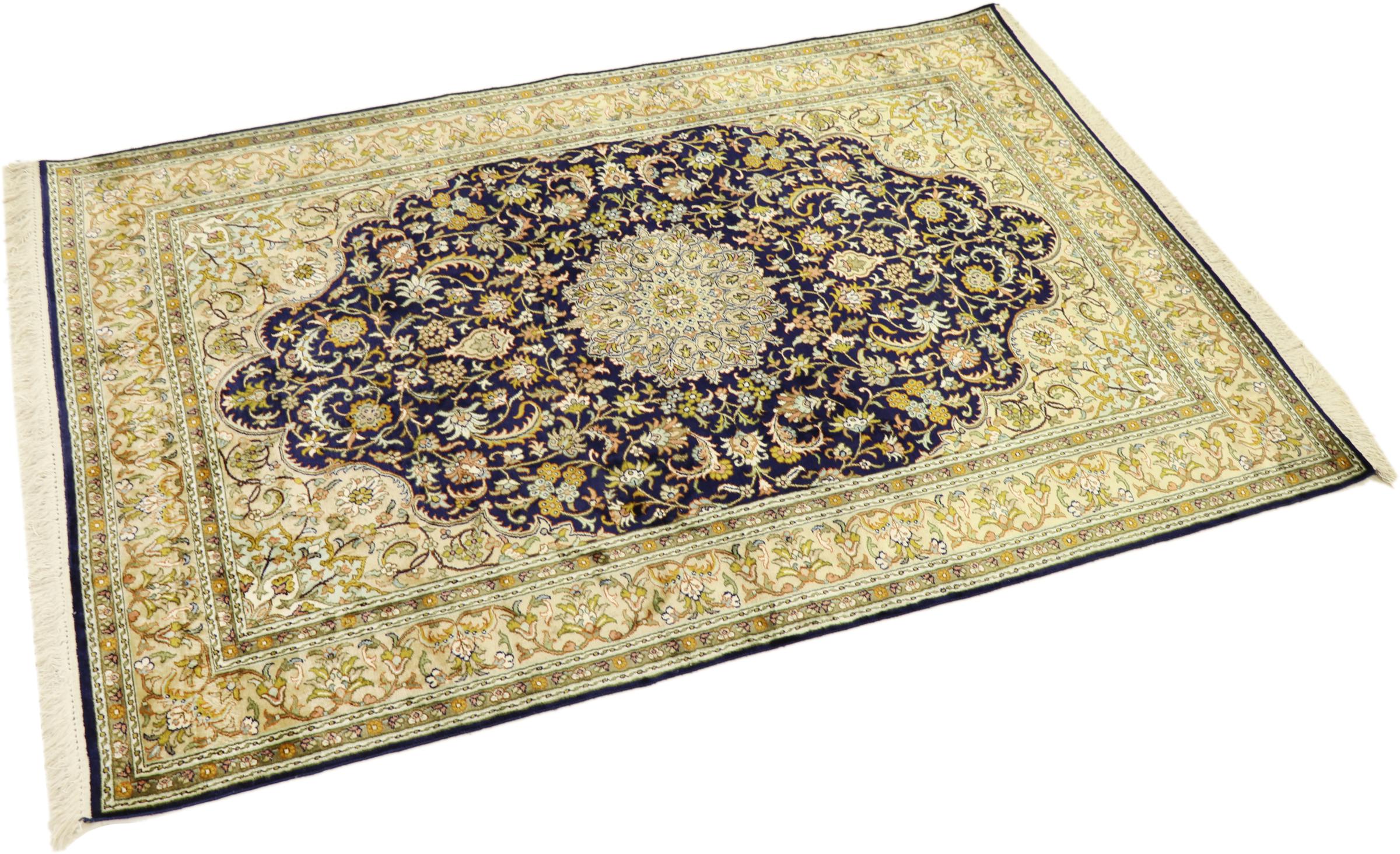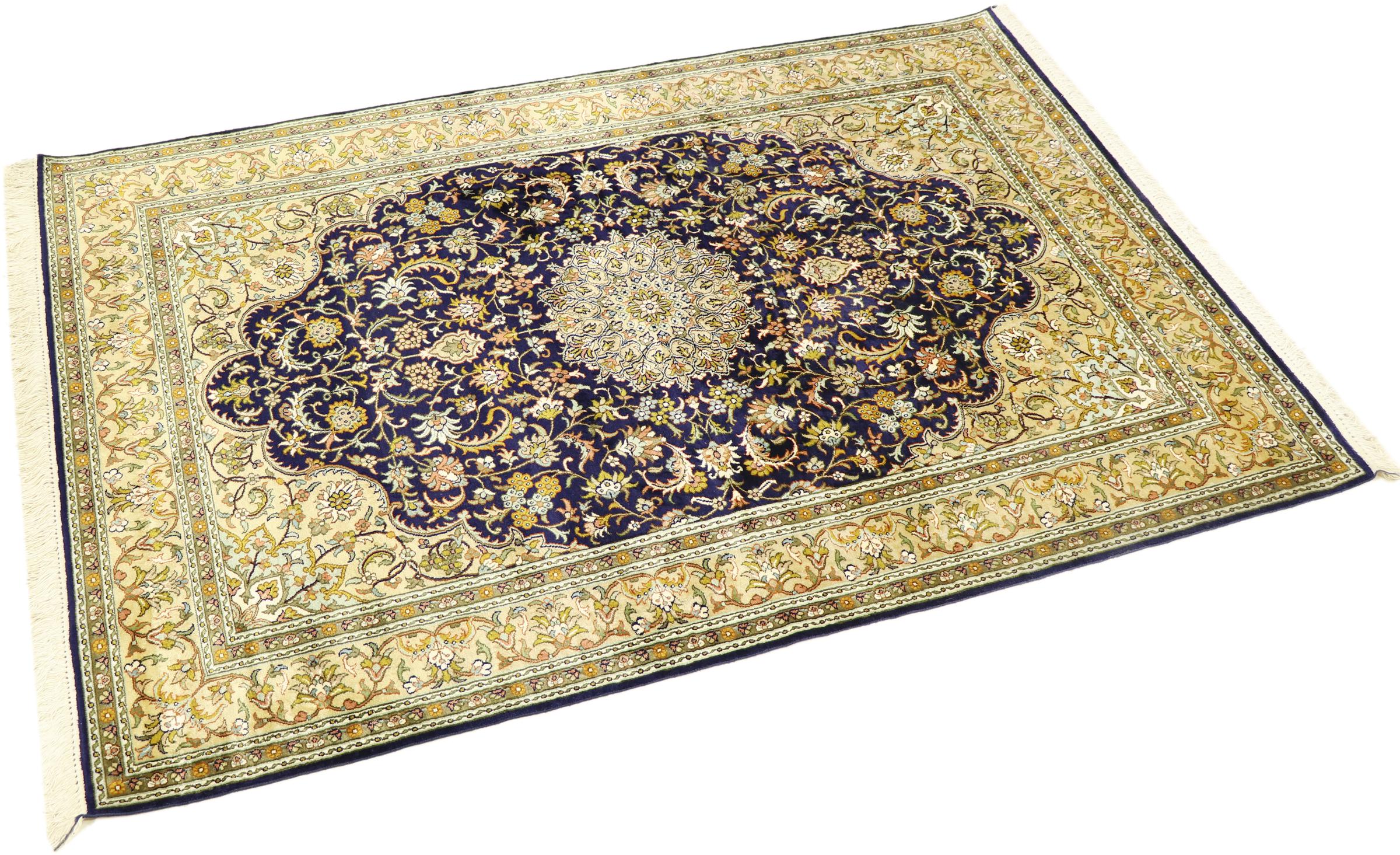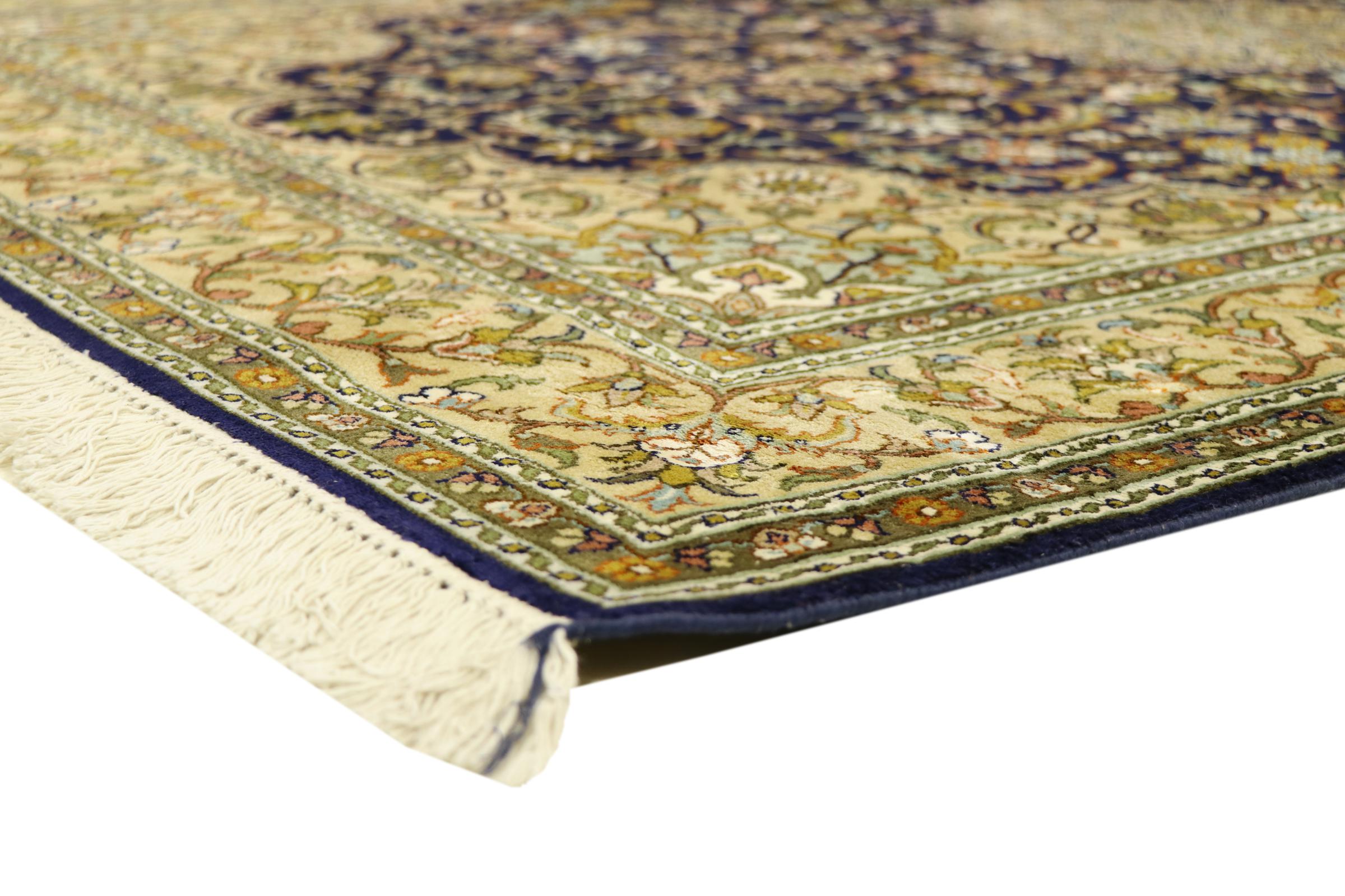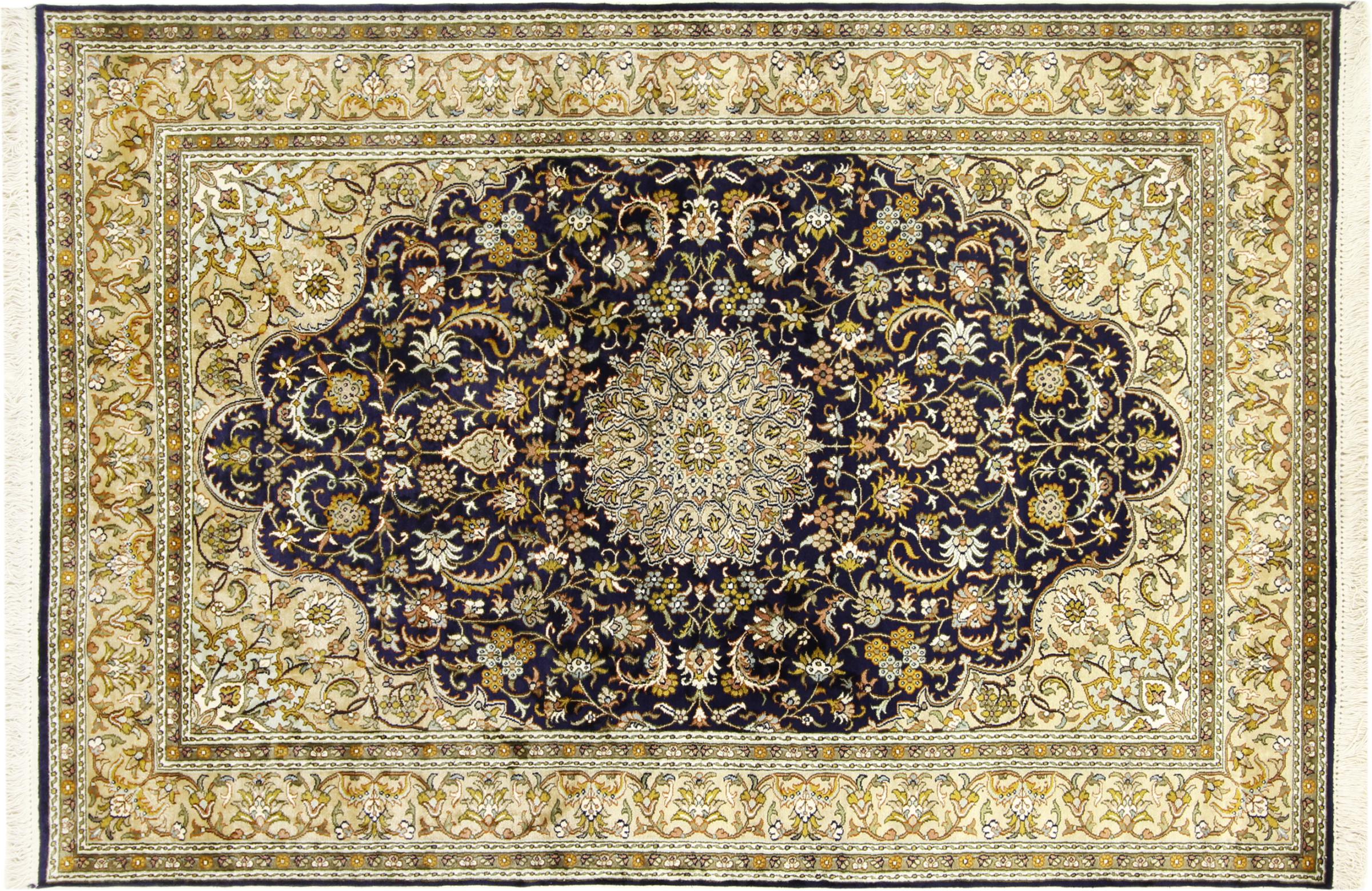 このカシミール産の手織りシルク カーペットは、インドの絨毯織り職人の技術を反映しています。純粋な絹であるだけでなく、結び目の密度が非常に細かいため、このような作品を作成できるのは経験豊富な織り手だけです。上質な天然シルクが魅力です。特に柔らかな感触を与えるだけでなく、その色はさまざまな面で輝きます。光の入射に応じて、まったく新しいディテールと色が現れ、今後何年も印象に残り続けるでしょう。このようなカーペットを何時間も眺めていると、時間を忘れてしまいます。写真では表現できない体験です。