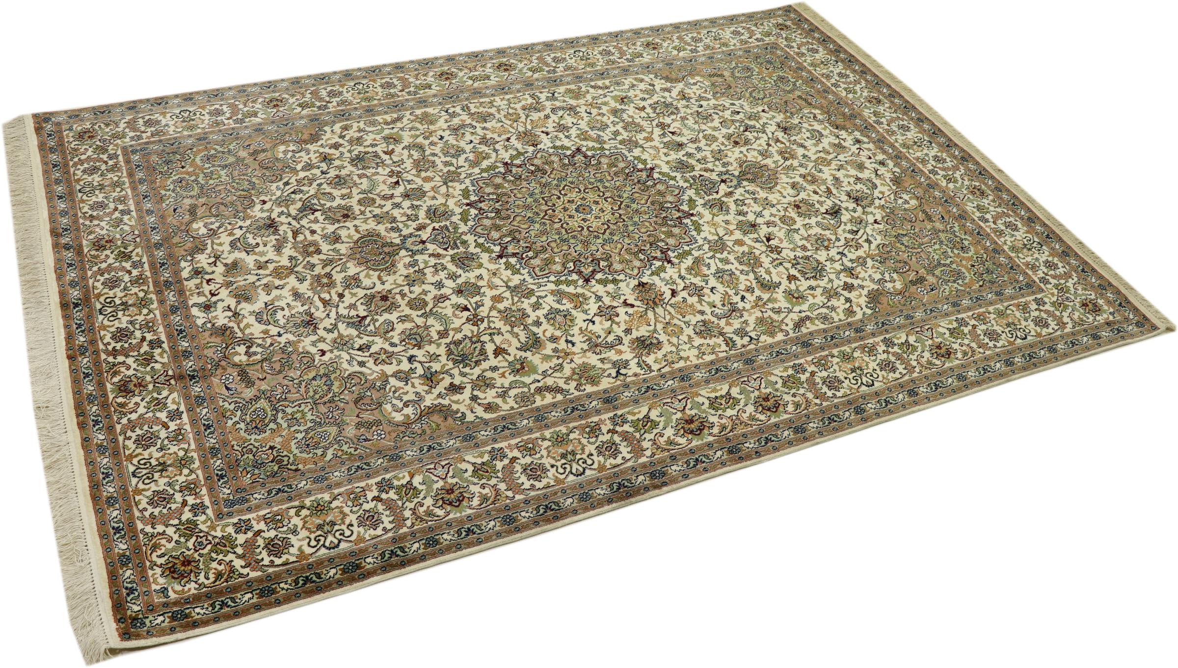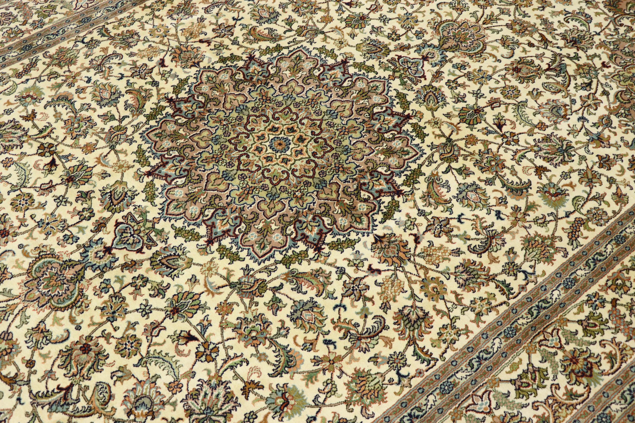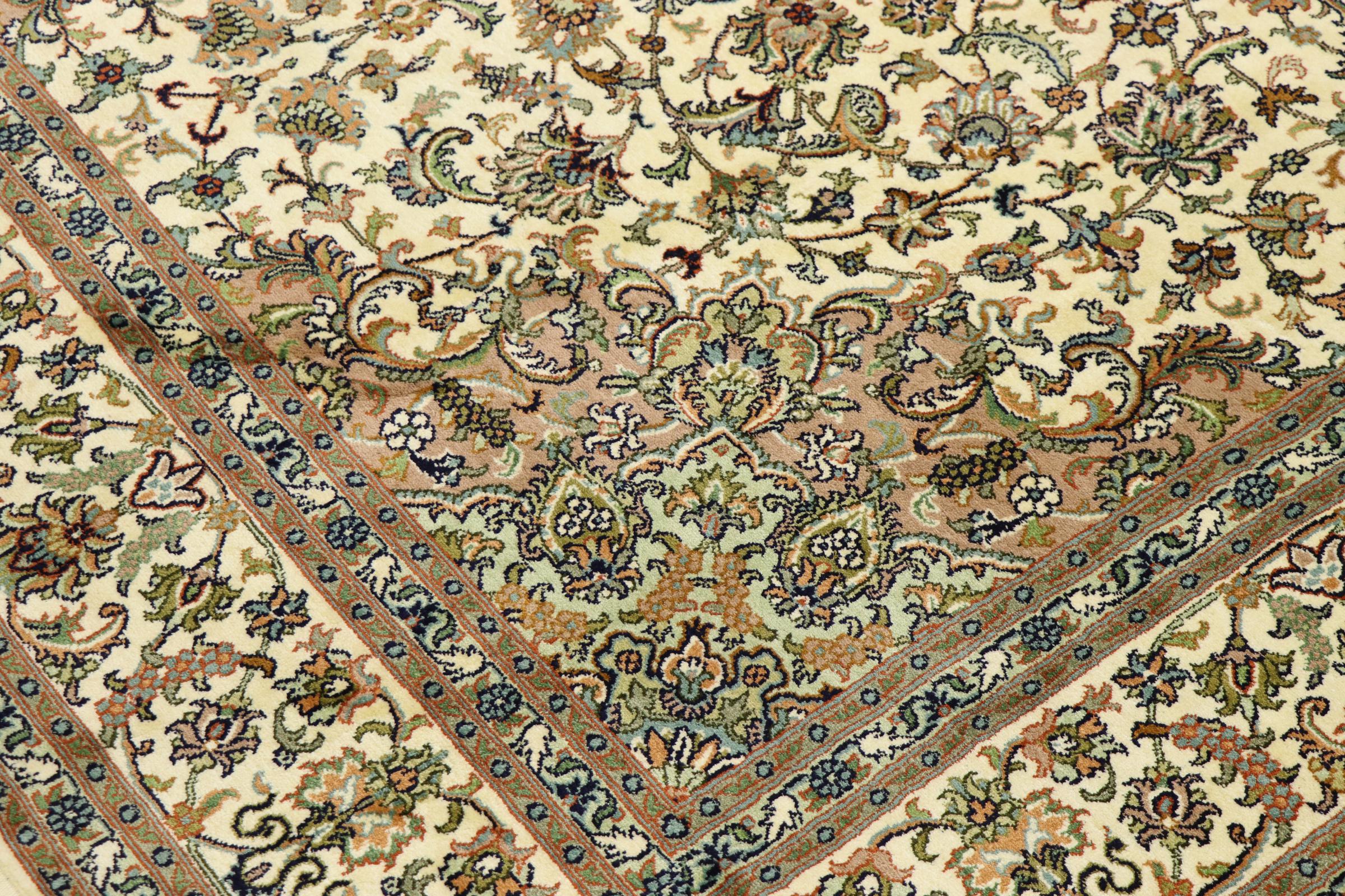 このカシミール産の手織りシルク カーペットは、インドの絨毯織り職人の技術を反映しています。純粋な絹であるだけでなく、結び目の密度が非常に細かいため、このような作品を作成できるのは経験豊富な織り手だけです。上質な天然シルクが魅力です。特に柔らかな感触を与えるだけでなく、その色はさまざまな面で輝きます。光の入射に応じて、まったく新しいディテールと色が現れ、今後何年も印象に残り続けるでしょう。このようなカーペットを何時間も眺めていると、時間を忘れてしまいます。写真では表現できない体験です。