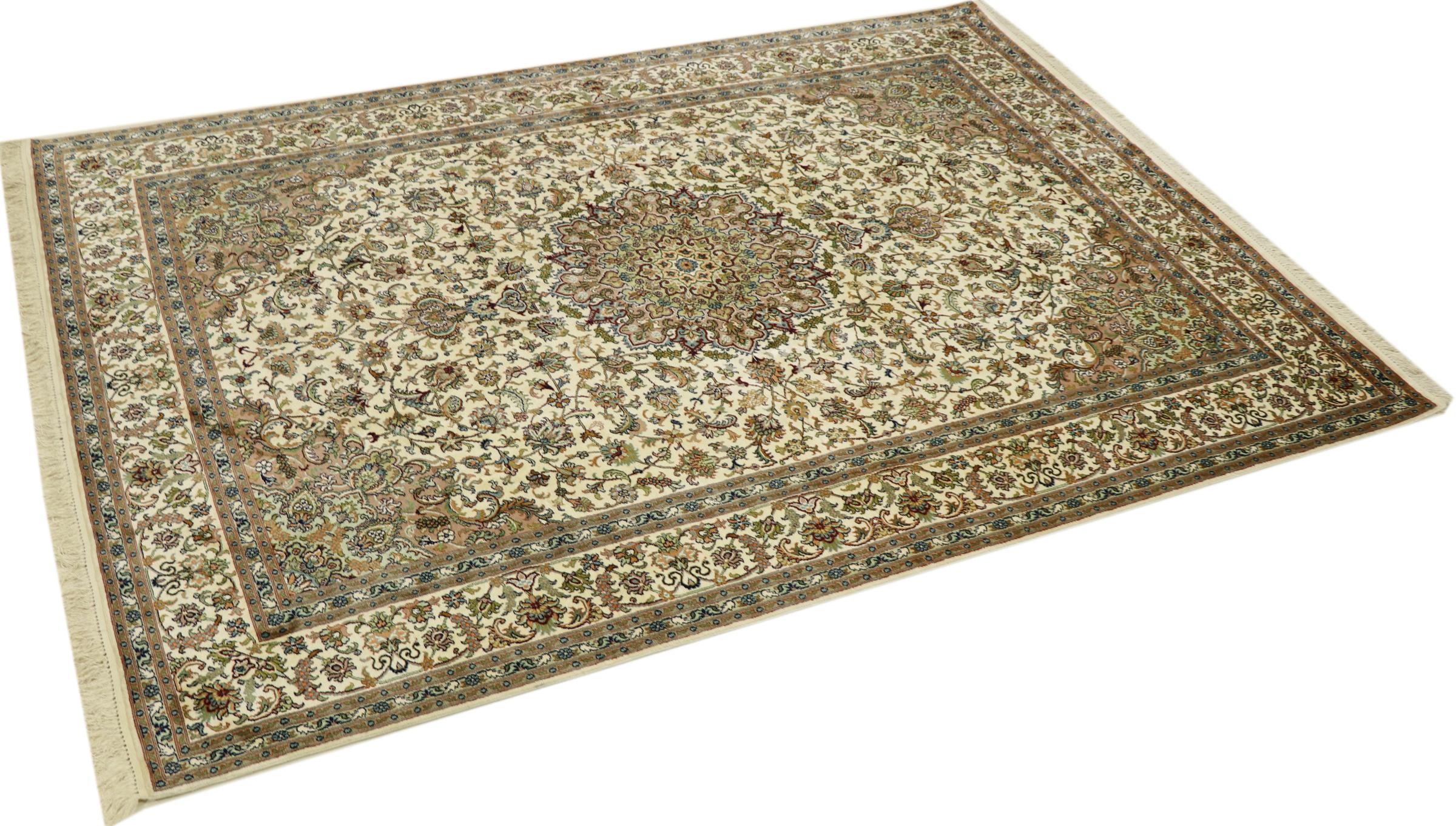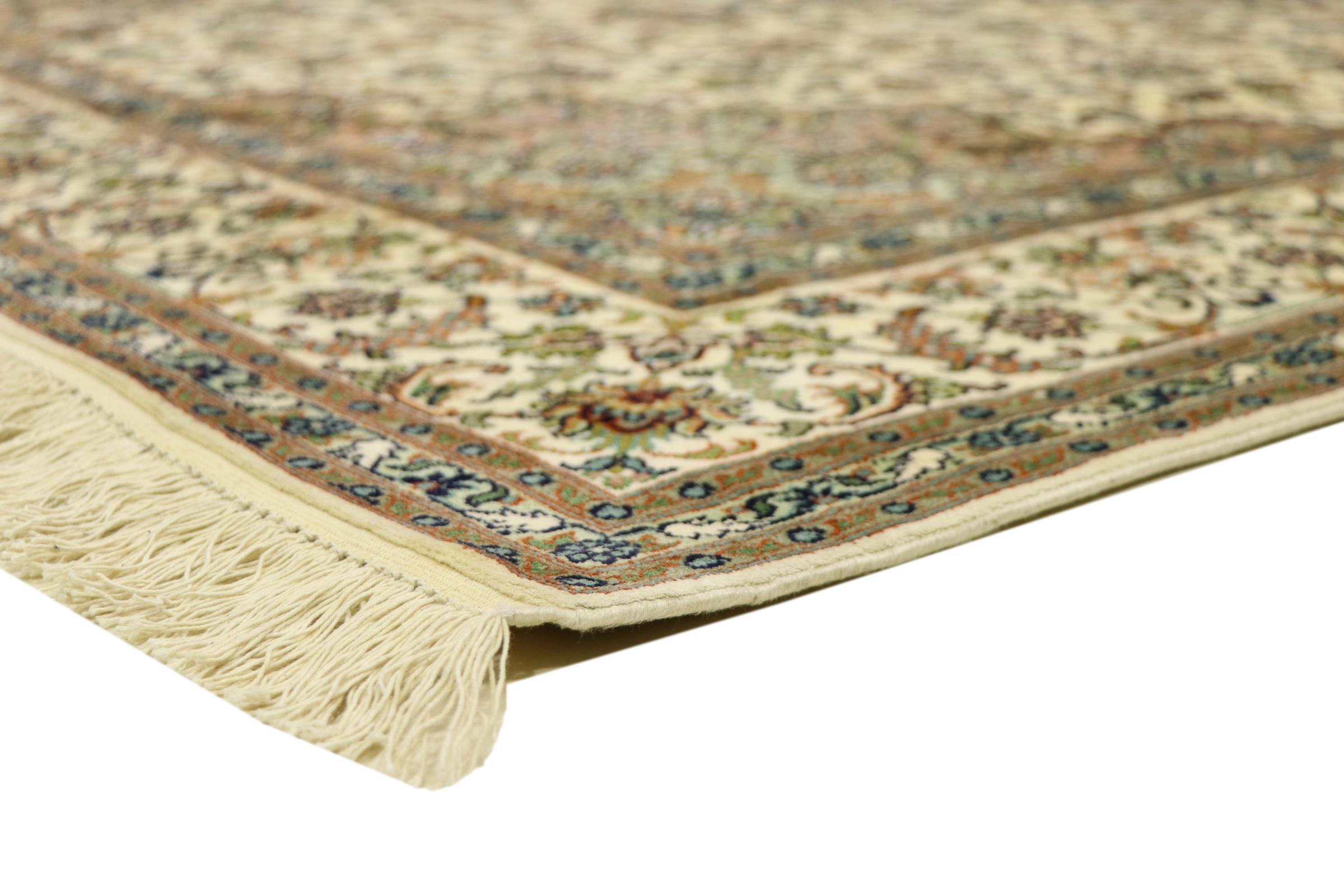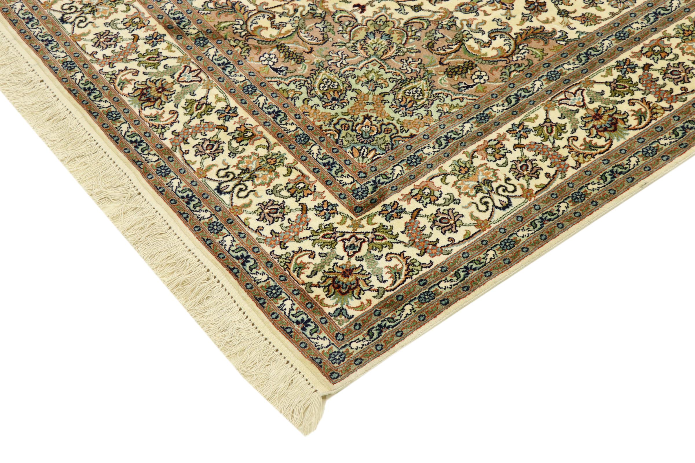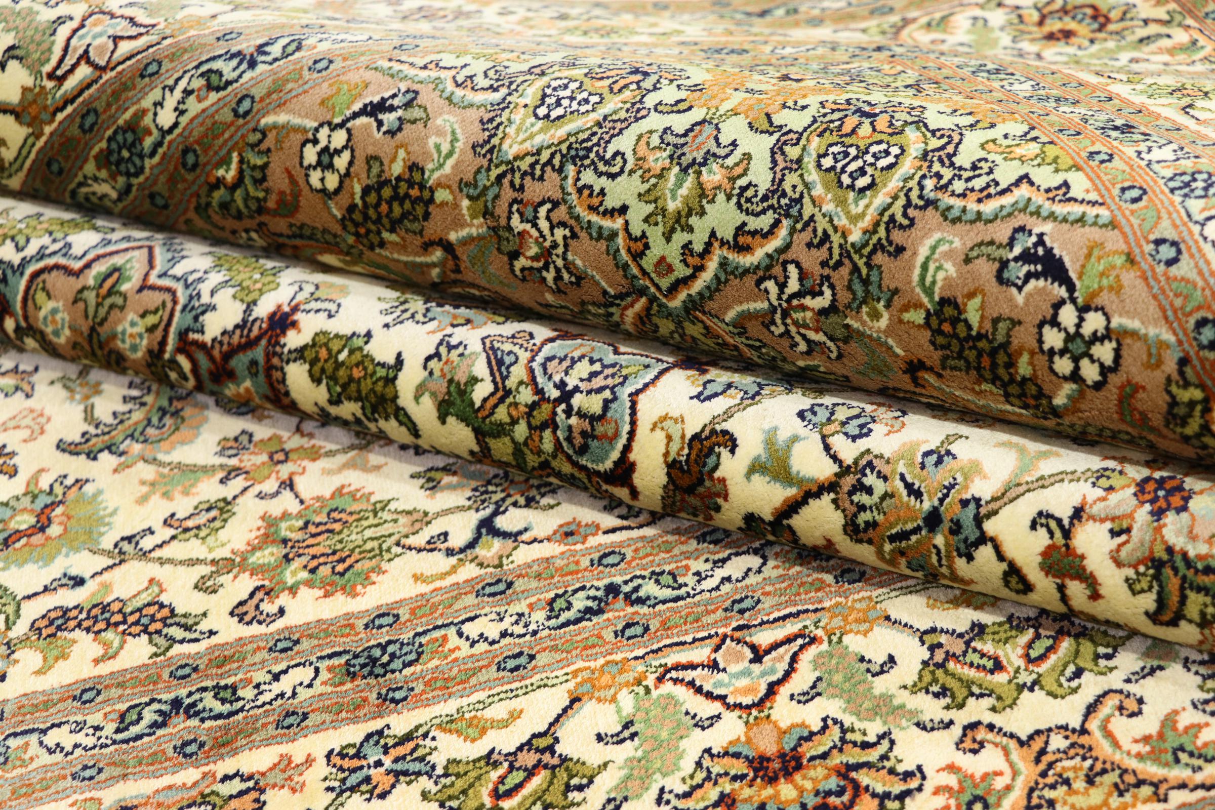このカシミール産の手織りシルク カーペットは、インドの絨毯織り職人の技術を反映しています。純粋な絹であるだけでなく、結び目の密度が非常に細かいため、このような作品を作成できるのは経験豊富な織り手だけです。上質な天然シルクが魅力です。特に柔らかな感触を与えるだけでなく、その色はさまざまな面で輝きます。光の入射に応じて、まったく新しいディテールと色が現れ、今後何年も印象に残り続けるでしょう。このようなカーペットを何時間も眺めていると、時間を忘れてしまいます。写真では表現できない体験です。