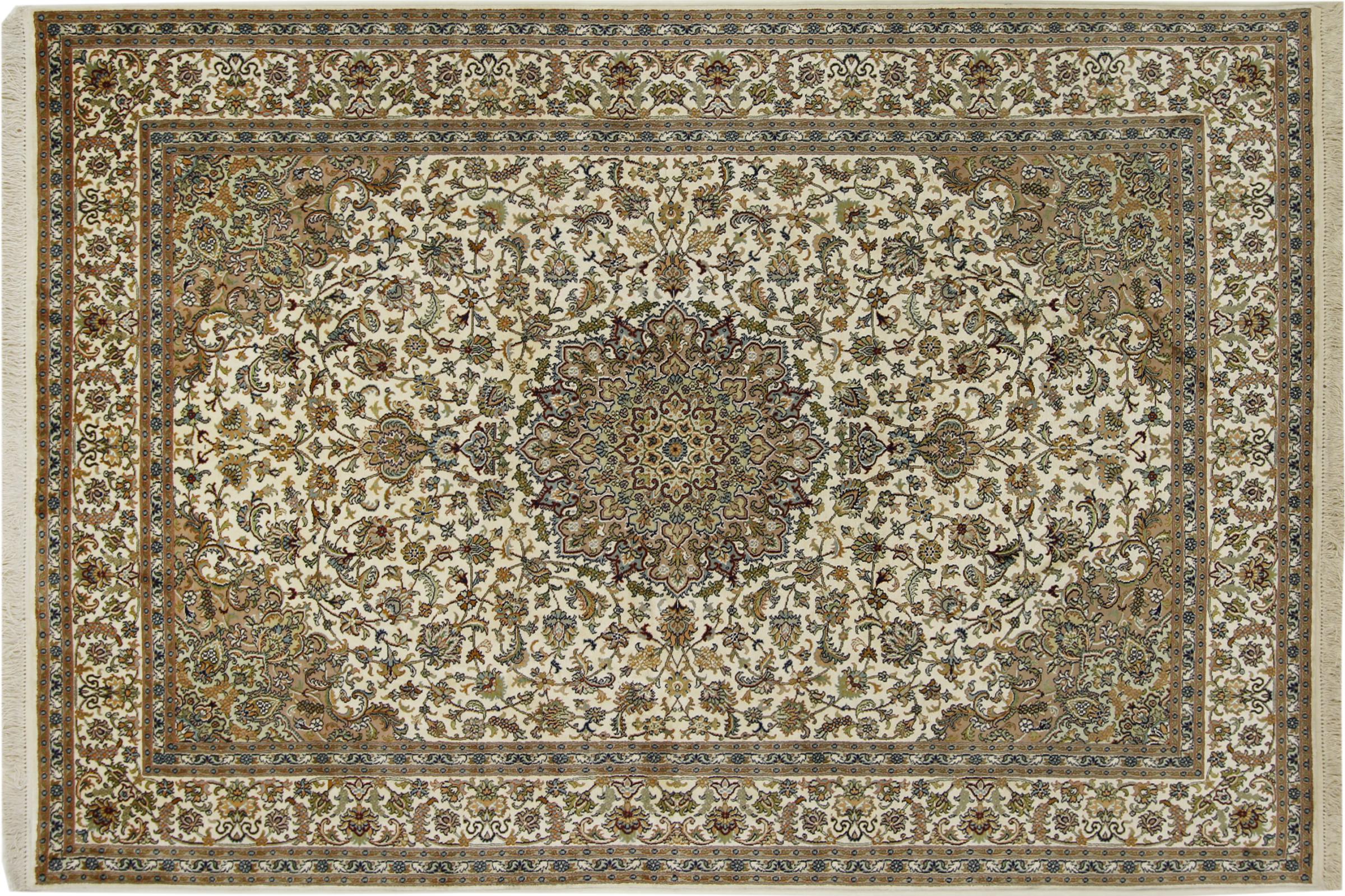 何世紀も前に旧ペルシャからインドにやってきた絨毯織りの職人たちは、その技術を実践するためにやってきました。そのため、今日のインドには、絨毯を織るという幅広い伝統があります。模様や装飾は、ペルシャ絨毯の有名なデザインをベースにしていることが多いです。手織りのオリエンタルカーペットの多くは北国から伝わってきます。 たとえばカシミール地方のシルクカーペットは、パキスタンと直接国境を接するカシミール地方が原産です。