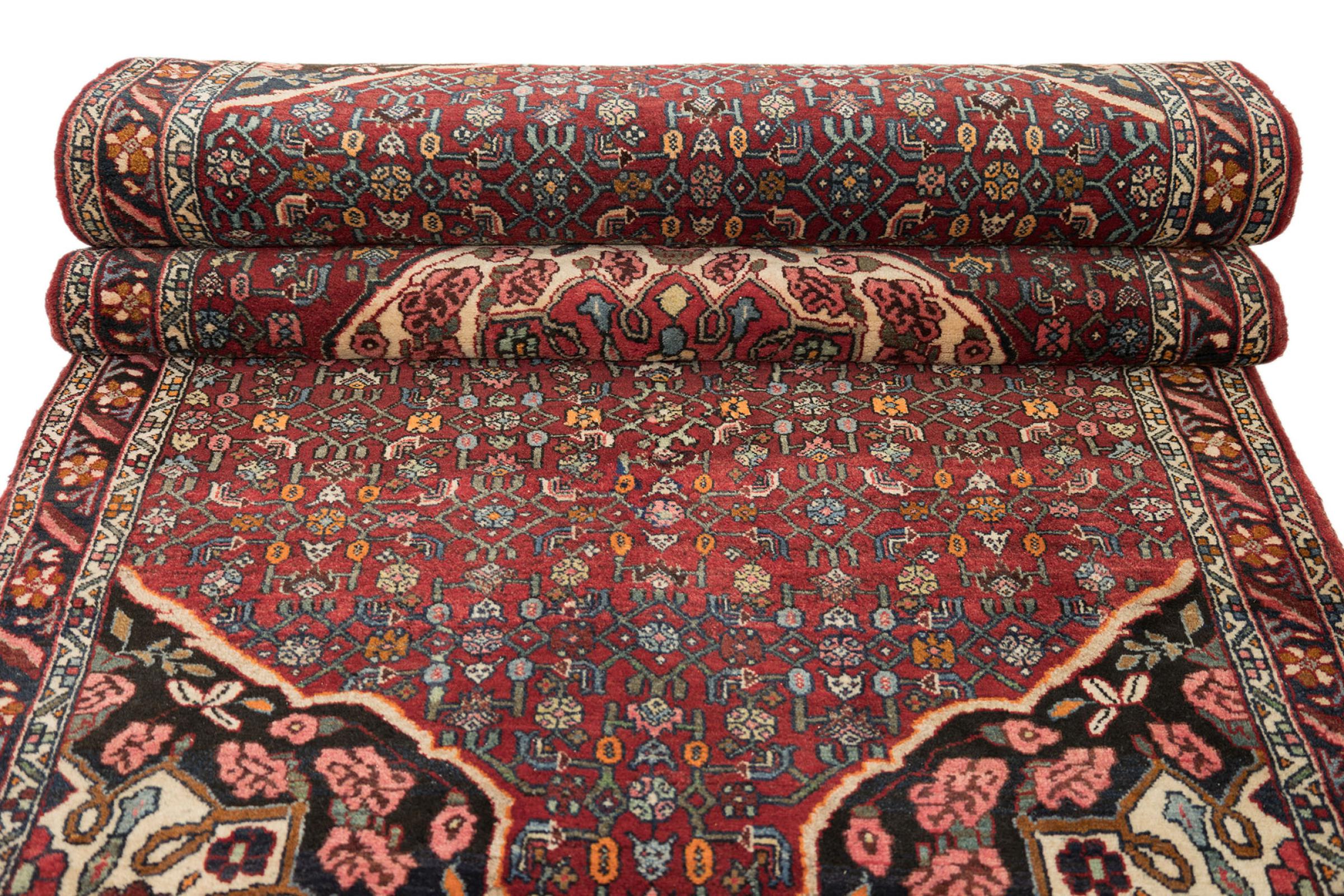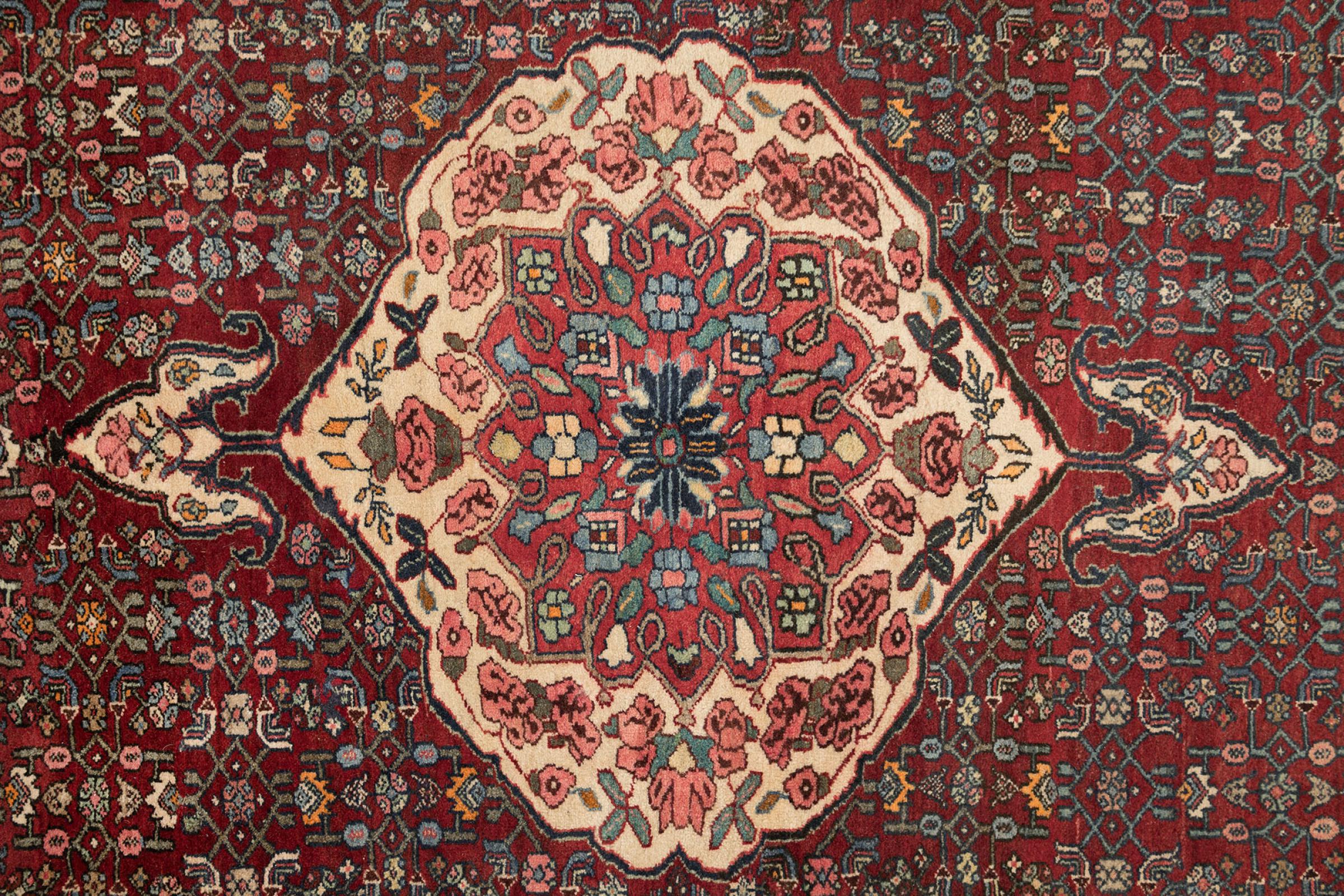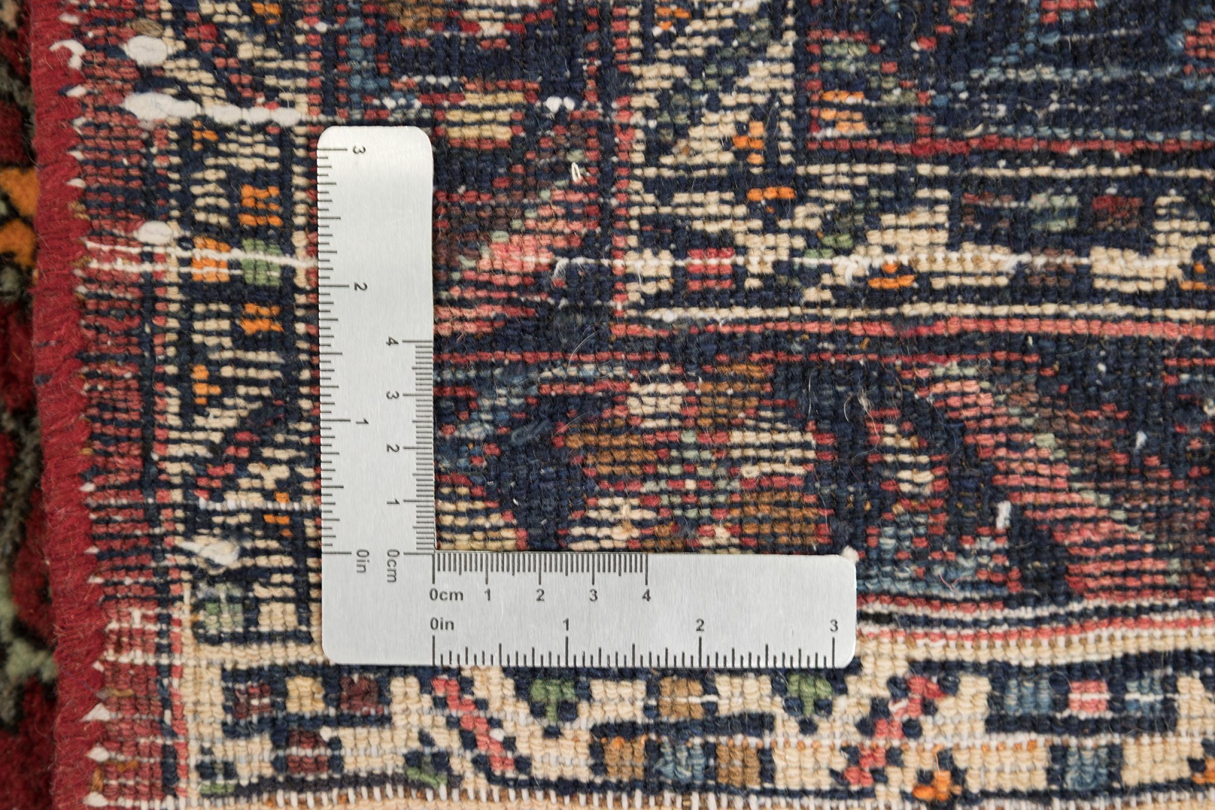 このペルシャ絨毯は、イラン西部のクルド人の小さな町で手織りされたものです。ビジャールカーペットは優れた品質を表しています。しっかりとしたパイルはそのコンパクトさ、したがって耐摩耗性に優れています。ウールは櫛でしっかりと圧縮されているため、パイルはほぼ垂直に上向きに立っています。これは、大きな汚れ粒子が浸透する可能性がほとんどないことを意味します。