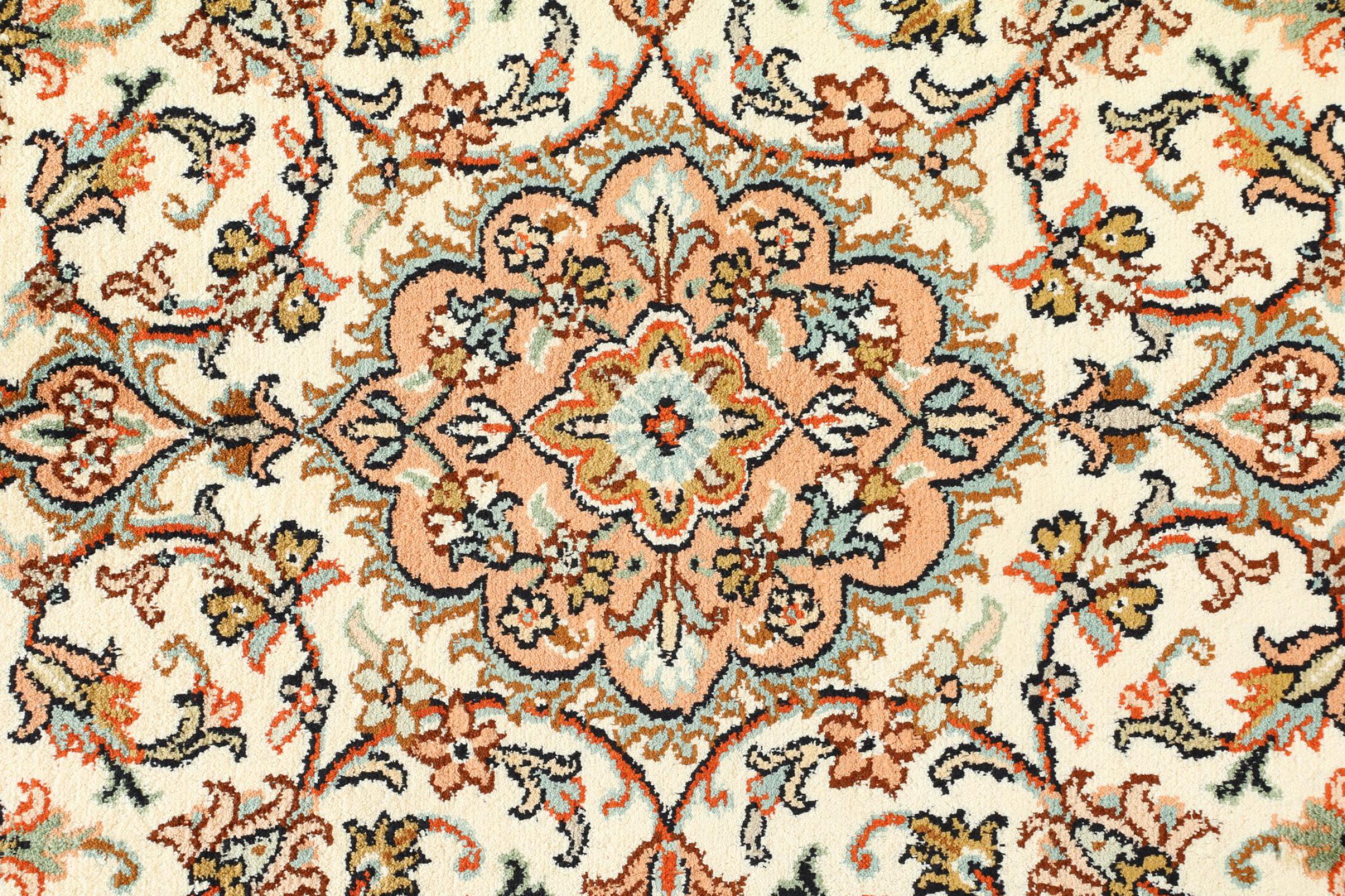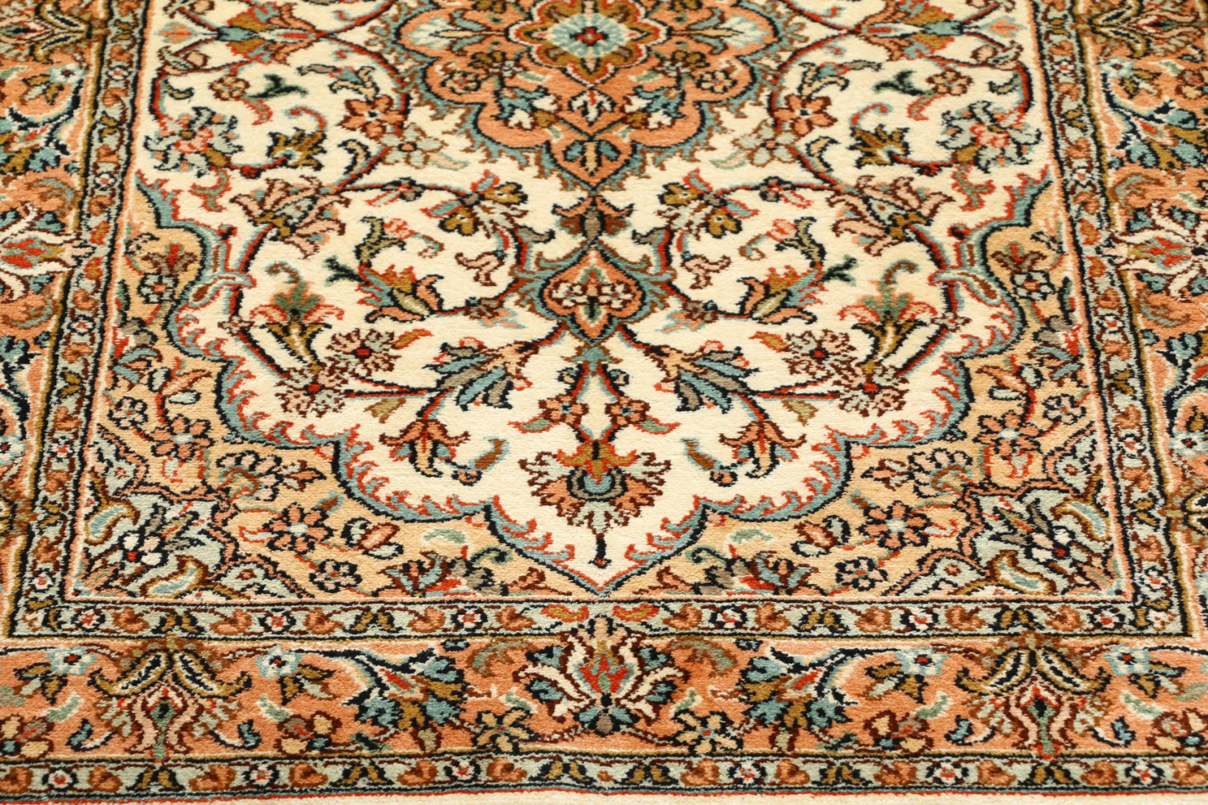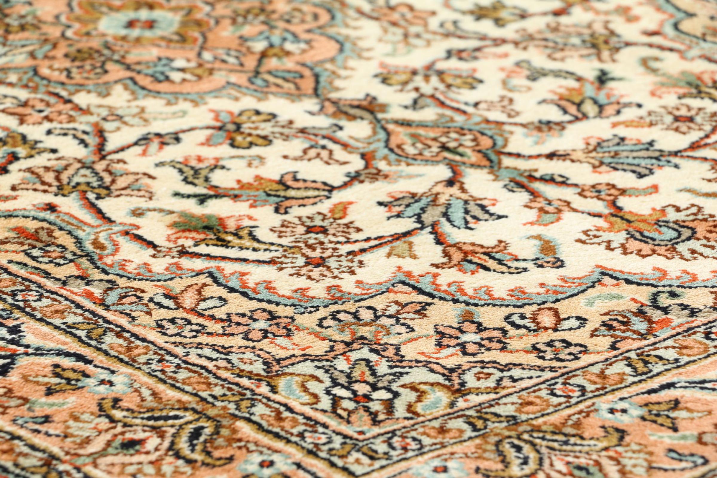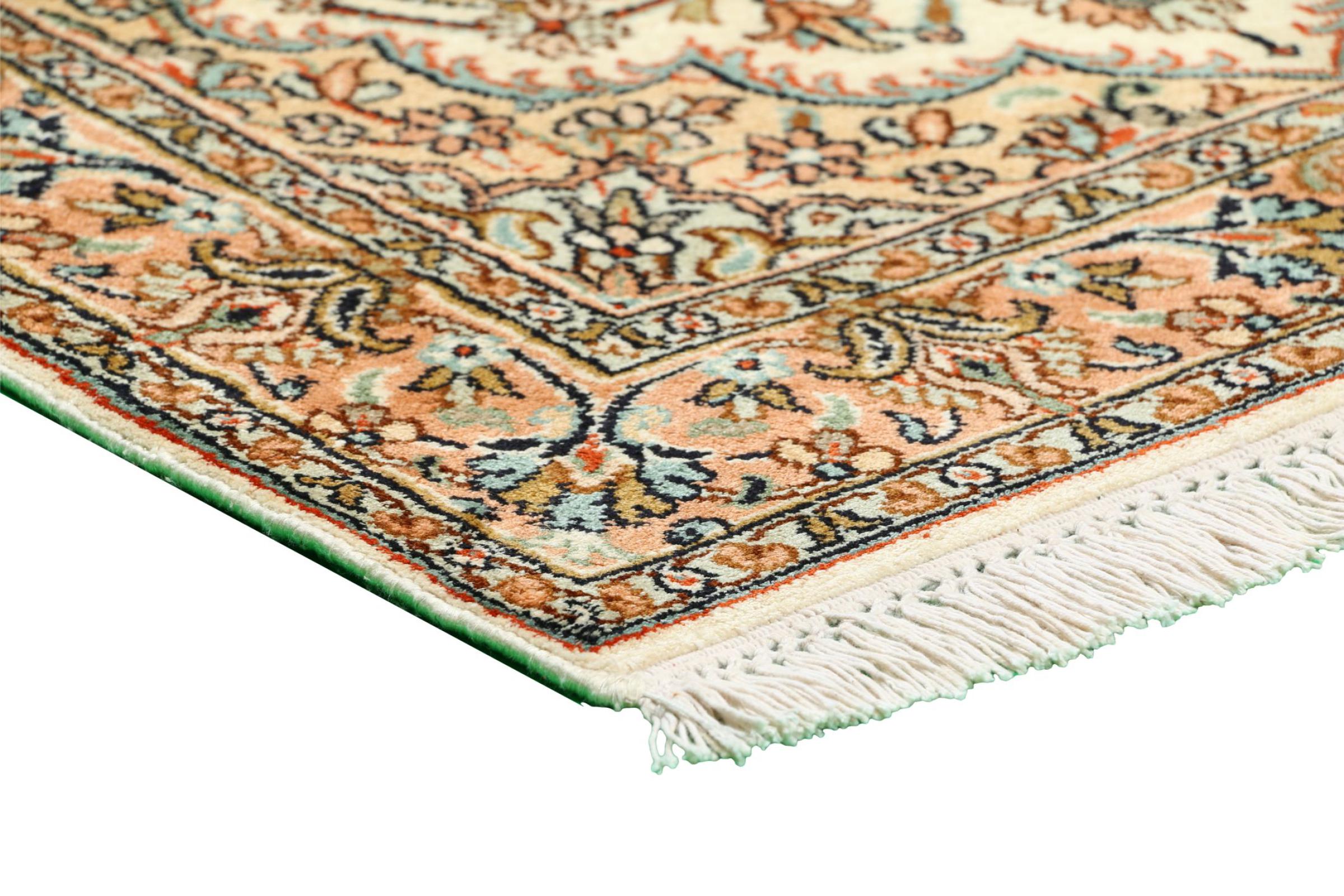 このカシミール産の手織りシルク カーペットは、インドの絨毯織り職人の技術を反映しています。純粋な絹であるだけでなく、結び目の密度が非常に細かいため、このような作品を作成できるのは経験豊富な織り手だけです。上質な天然シルクが魅力です。特に柔らかな感触を与えるだけでなく、その色はさまざまな面で輝きます。光の入射に応じて、まったく新しいディテールと色が現れ、今後何年も印象に残り続けるでしょう。このようなカーペットを何時間も眺めていると、時間を忘れてしまいます。写真では表現できない体験です。