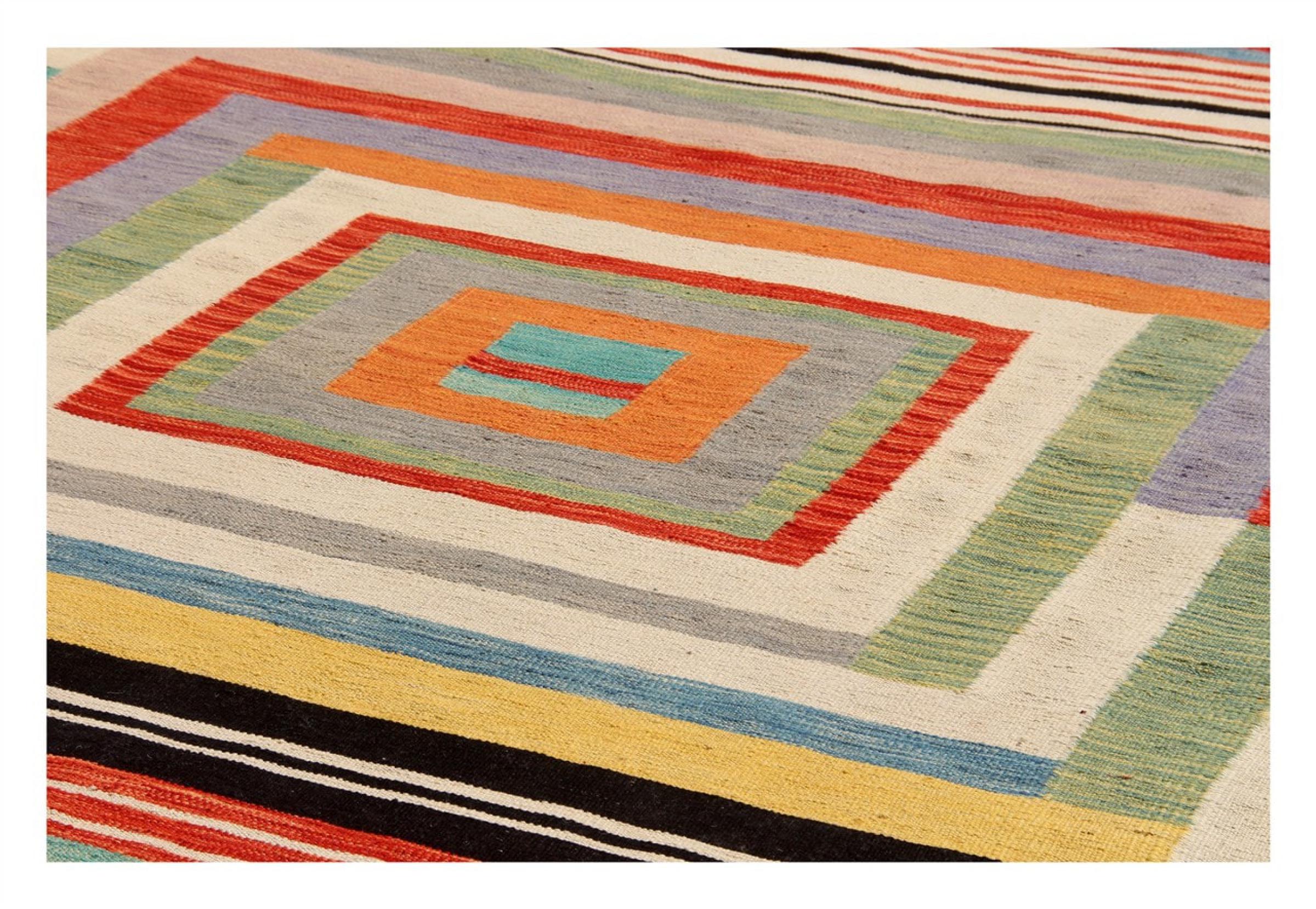 同時に、アフガンエディションケリムには現代的に解釈されたカラーバリエーションも含まれています。これには、ベージュ、グレー、オリーブなどの調和の取れた自然色や、ターコイズ、グリーン、ピンク、または多色構成の生き生きとしたアクセントが含まれています。この多様性により、アフガニスタンのケリムは特に変化に富んでおり、伝統的な目を引く要素としても、現代の住空間におけるスタイリッシュなデザイン要素としても使用できます。