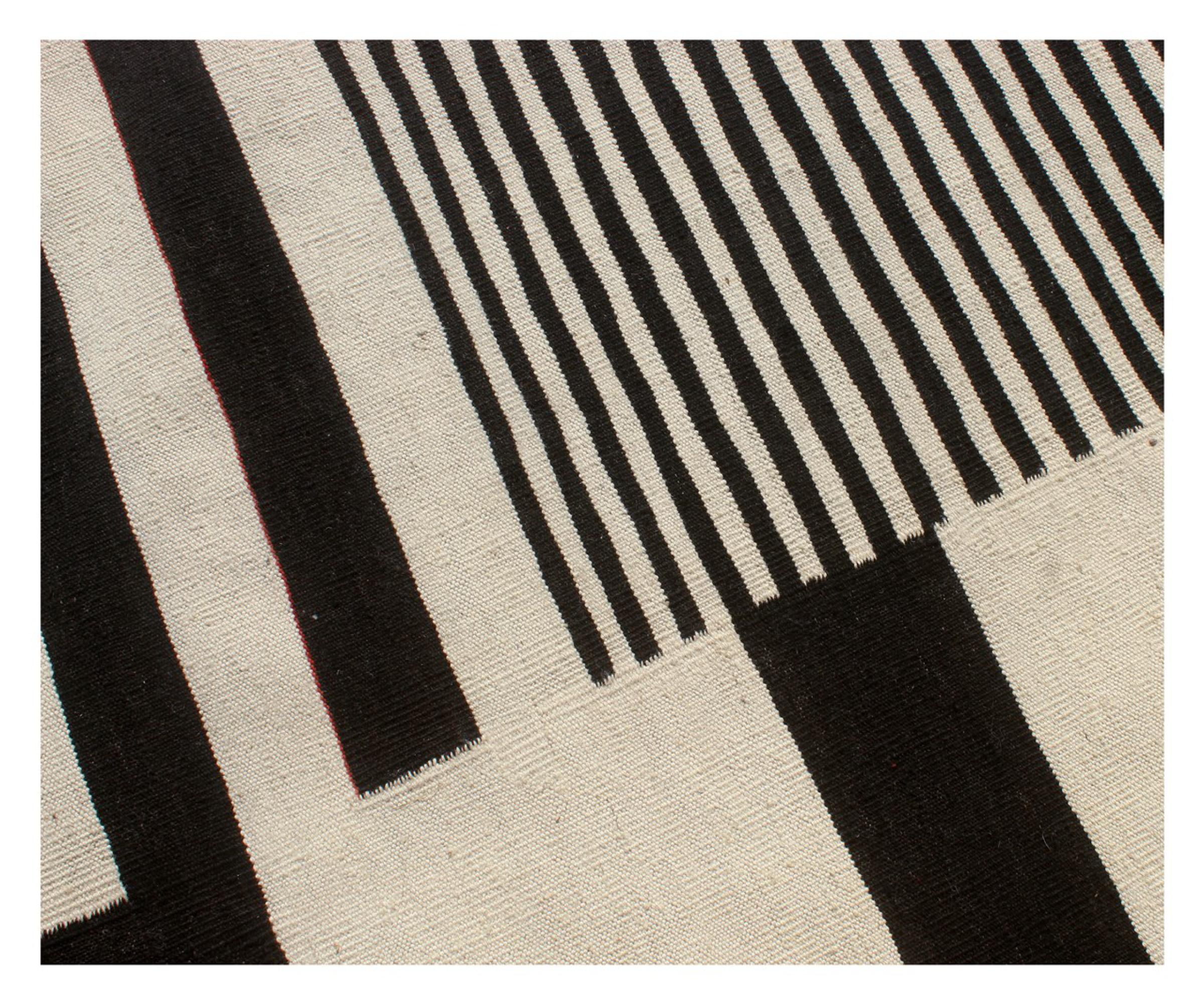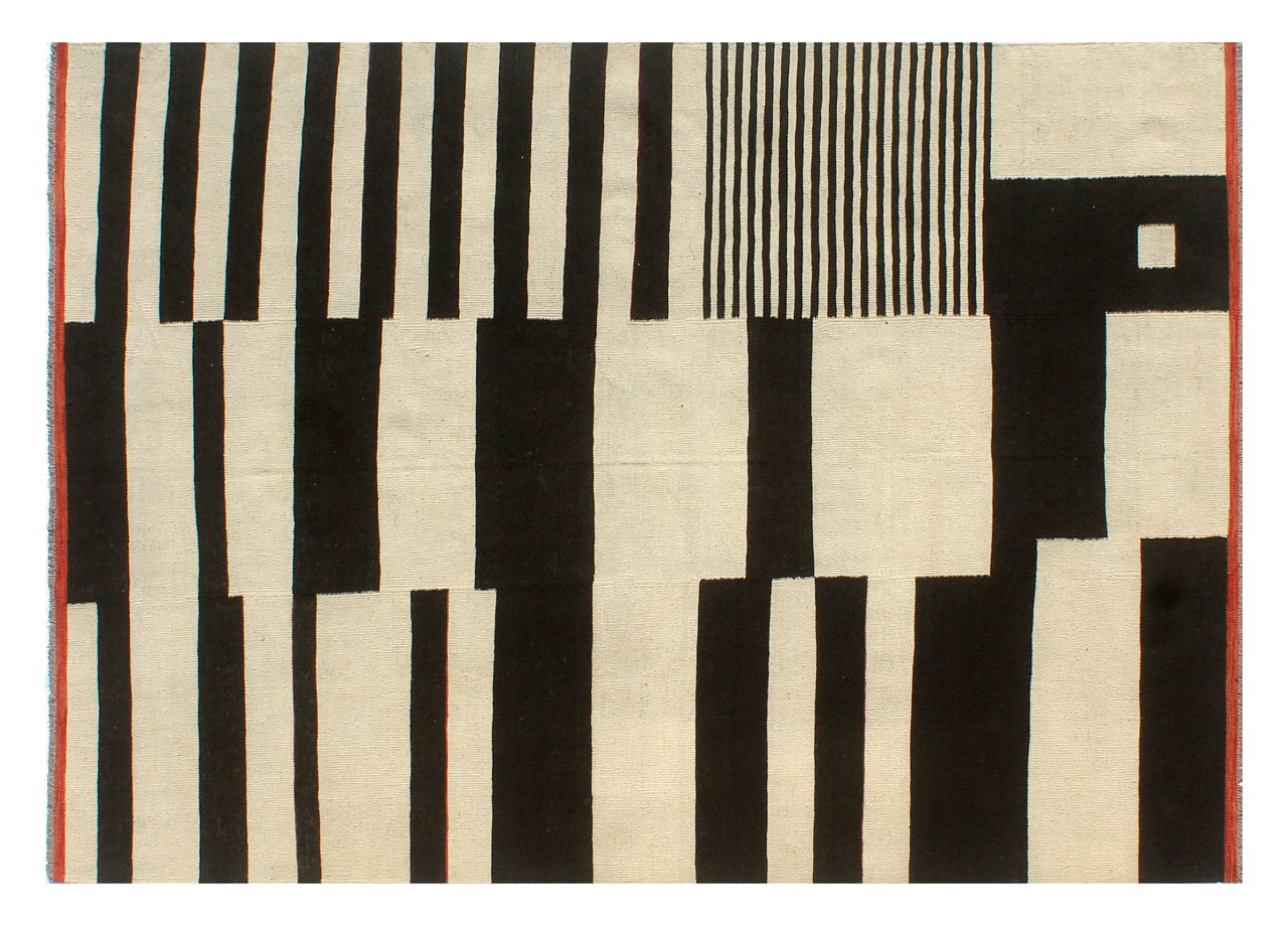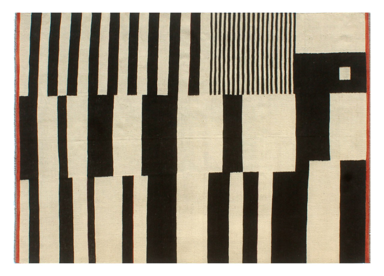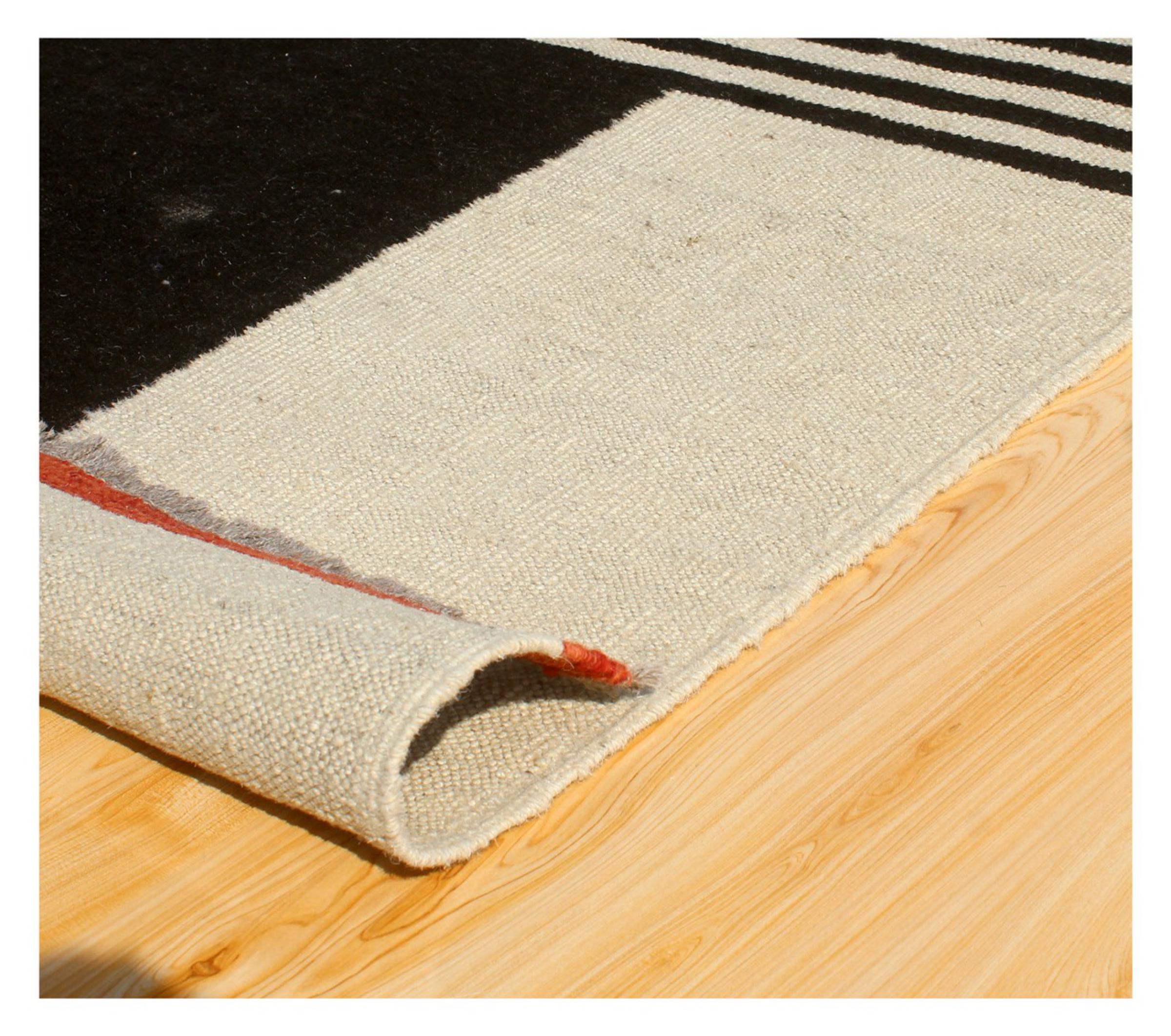 この絨毯は、平織りとして織機で手作業で作られたものです。フラットウィーブとは、パイルのないカーペットを指す言葉です。その名の通り、この絨毯は織られていて、結び目はありません。これにより、表面が構造化されたフラットカーペットが得られる。平織りは、結び目のあるカーペットよりも柔らかくなく、通常は薄くなります。同時に、彼らは製造するためにはるかに複雑ではなく、通常は両側(表と裏)からレイアウトすることができます。彼らのパターンは通常、生地によって決定される幾何学的なものです。