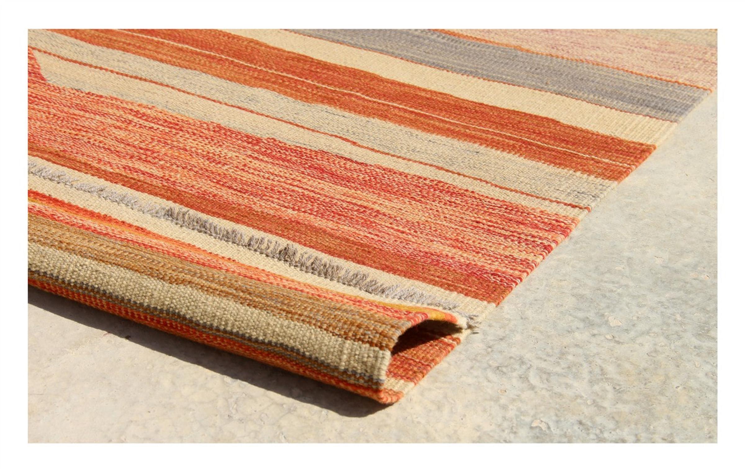 この絨毯は、平織りとして織機で手作業で作られたものです。フラットウィーブとは、パイルのないカーペットを指す言葉です。その名の通り、この絨毯は織られていて、結び目はありません。これにより、表面が構造化されたフラットカーペットが得られる。平織りは、結び目のあるカーペットよりも柔らかくなく、通常は薄くなります。同時に、彼らは製造するためにはるかに複雑ではなく、通常は両側(表と裏)からレイアウトすることができます。彼らのパターンは通常、生地によって決定される幾何学的なものです。