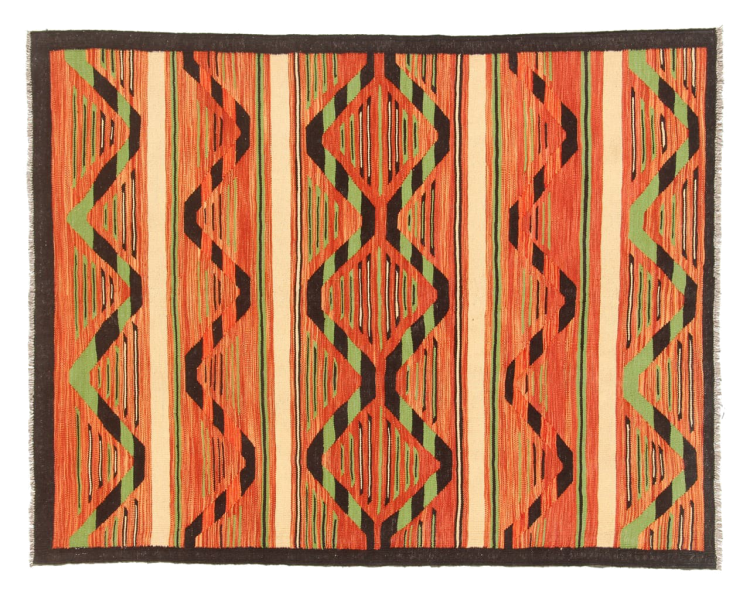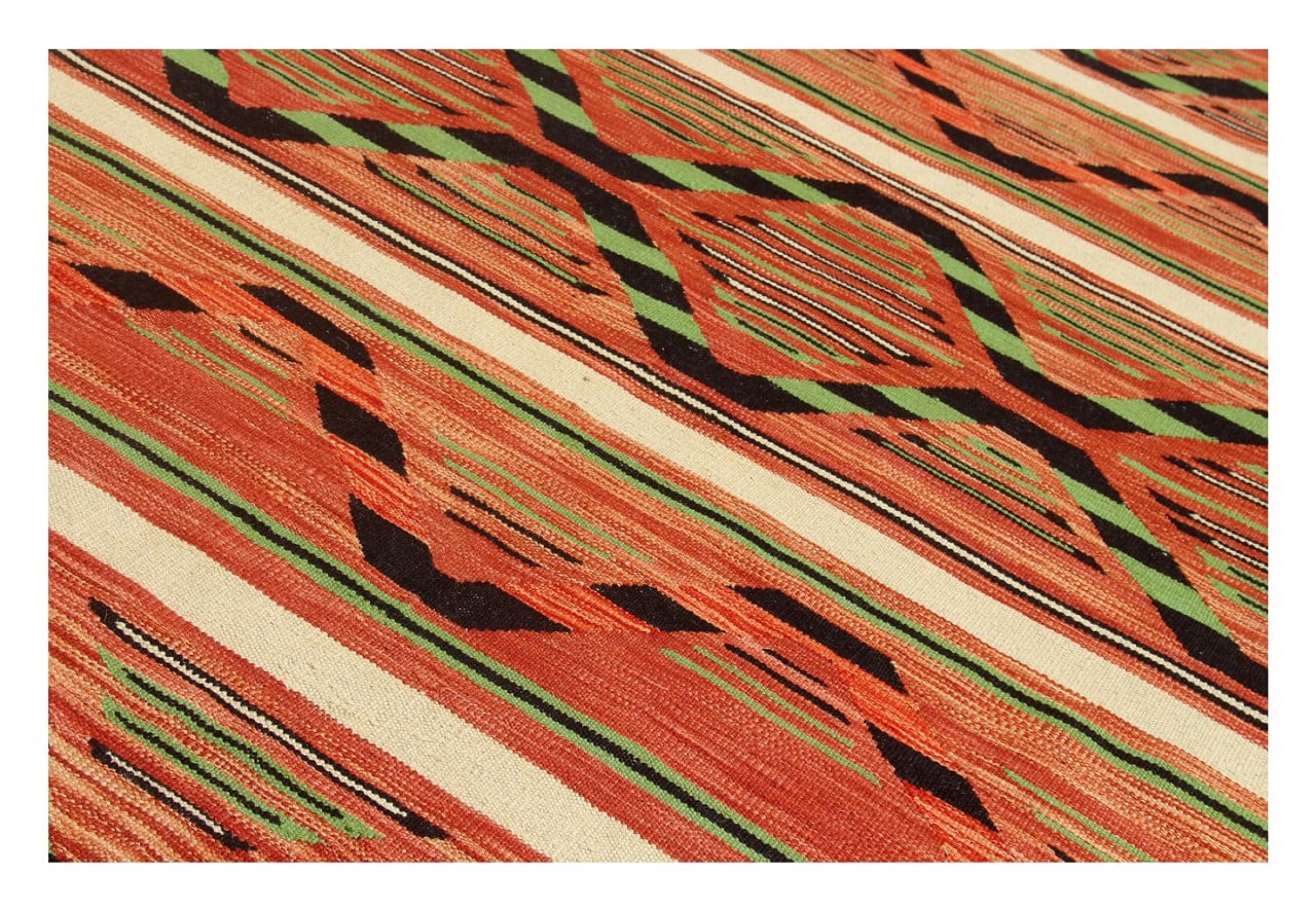 この絨毯は、平織りとして織機で手作業で作られたものです。フラットウィーブとは、パイルのないカーペットを指す言葉です。その名の通り、この絨毯は織られていて、結び目はありません。これにより、表面が構造化されたフラットカーペットが得られる。平織りは、結び目のあるカーペットよりも柔らかくなく、通常は薄くなります。同時に、彼らは製造するためにはるかに複雑ではなく、通常は両側(表と裏)からレイアウトすることができます。彼らのパターンは通常、生地によって決定される幾何学的なものです。