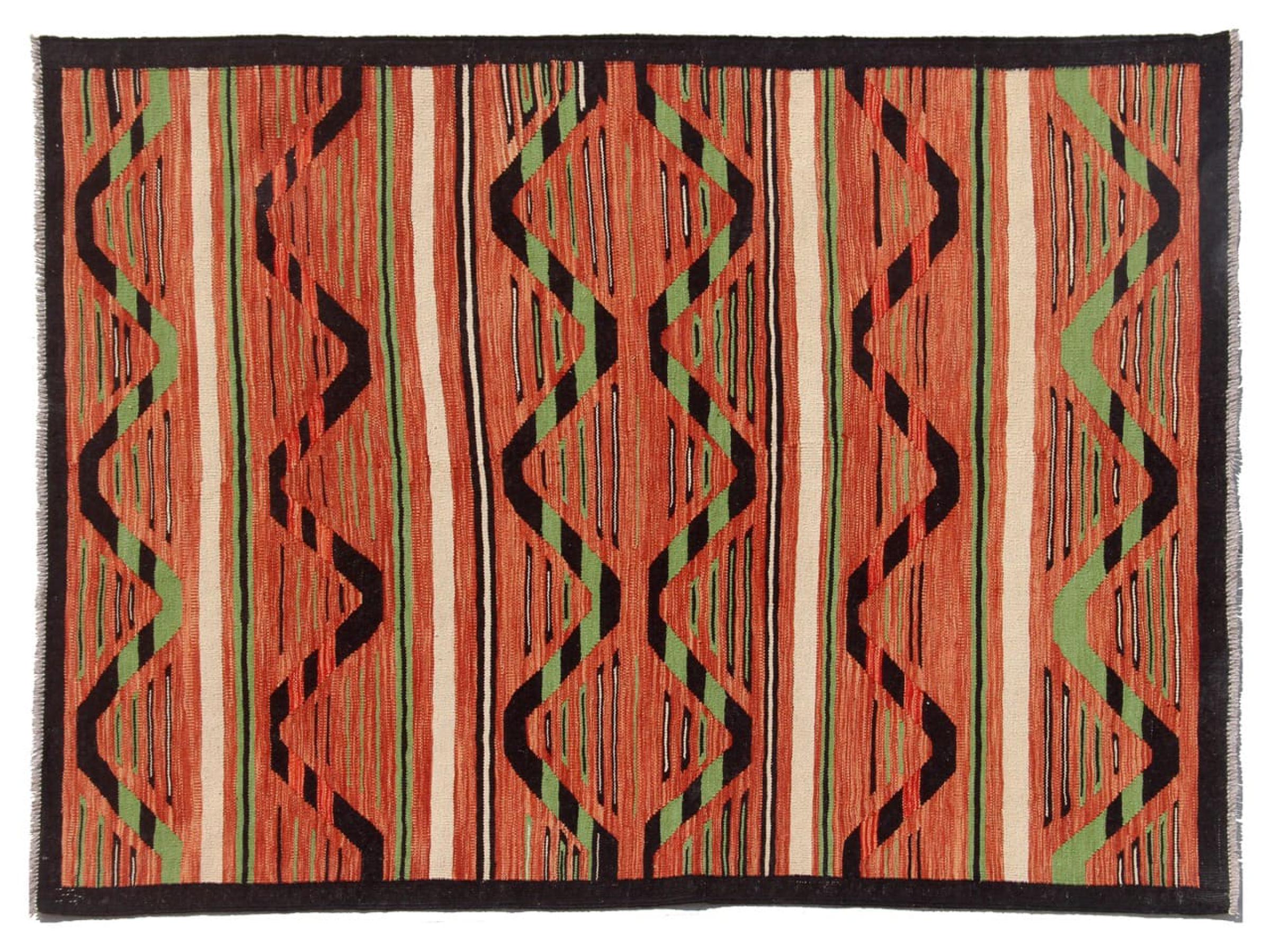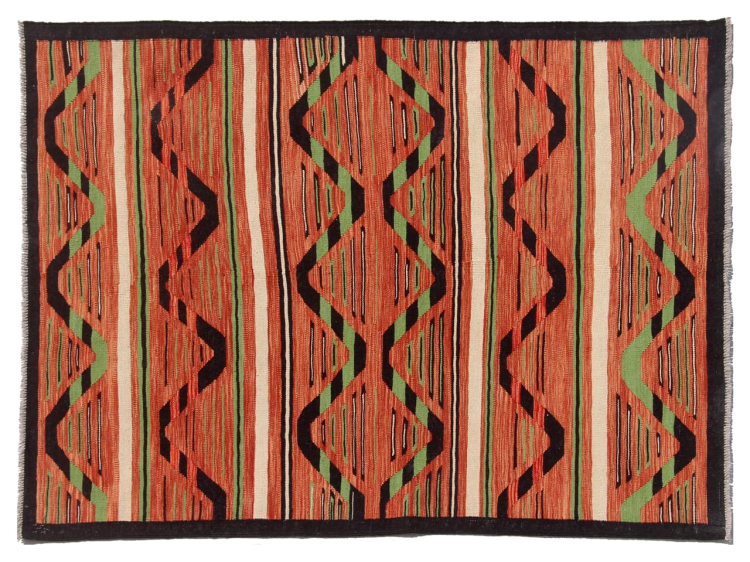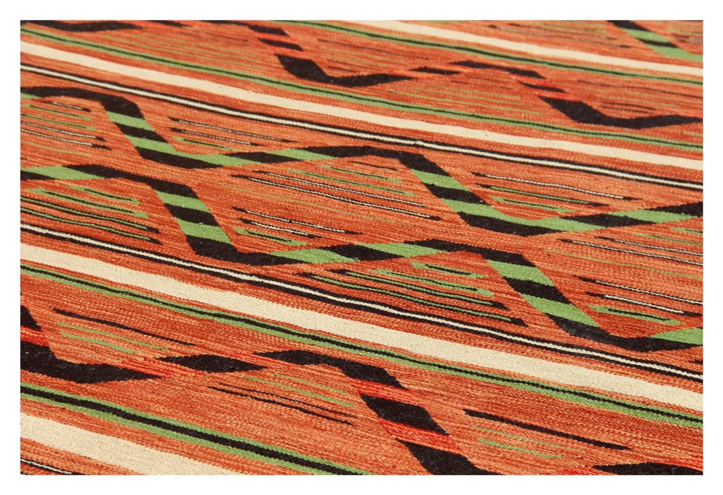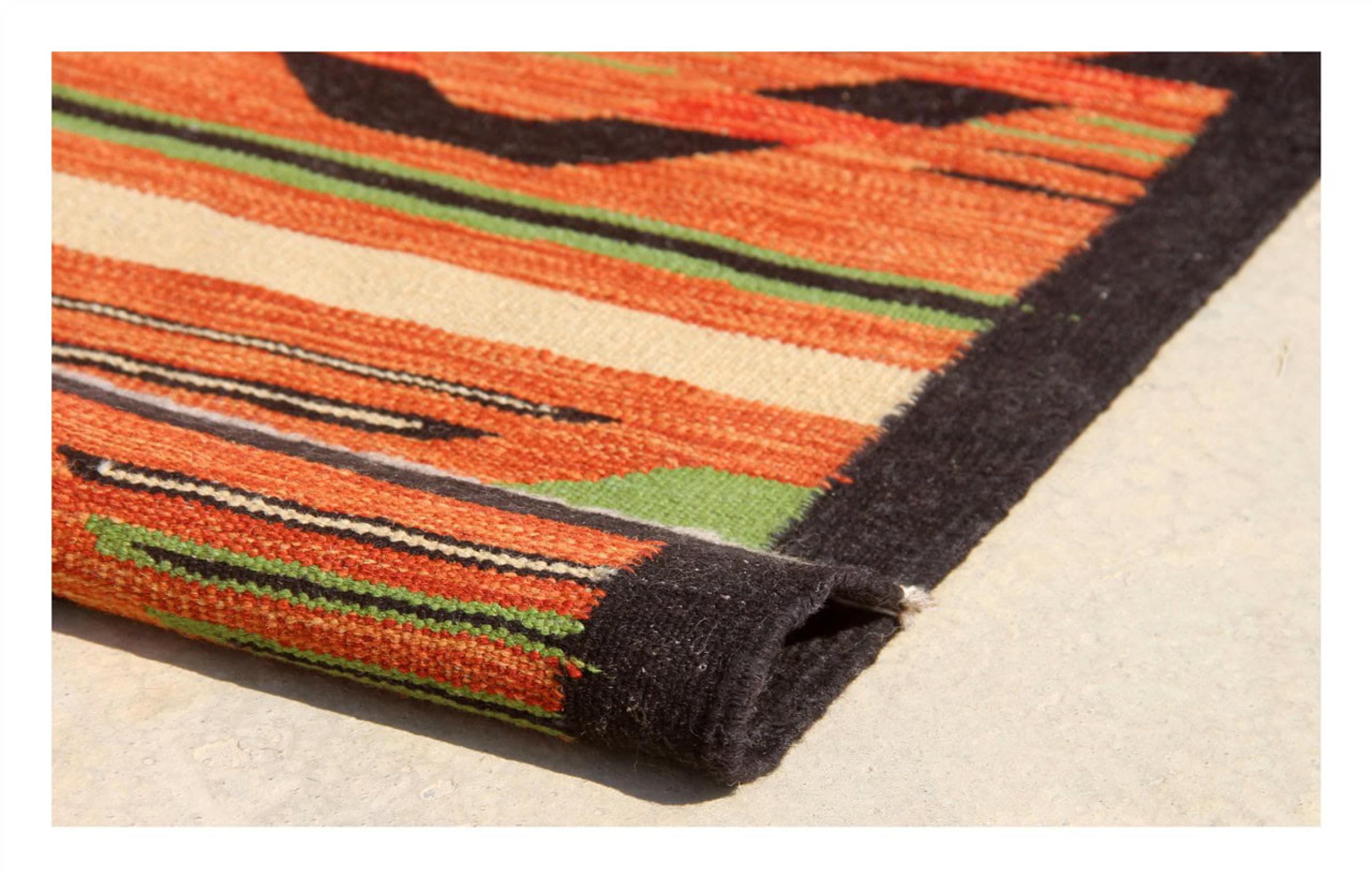 この絨毯は、平織りとして織機で手作業で作られたものです。フラットウィーブとは、パイルのないカーペットを指す言葉です。その名の通り、この絨毯は織られていて、結び目はありません。これにより、表面が構造化されたフラットカーペットが得られる。平織りは、結び目のあるカーペットよりも柔らかくなく、通常は薄くなります。同時に、彼らは製造するためにはるかに複雑ではなく、通常は両側(表と裏)からレイアウトすることができます。彼らのパターンは通常、生地によって決定される幾何学的なものです。