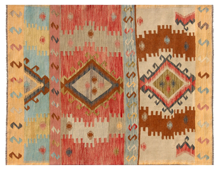 この絨毯は、平織りとして織機で手作業で作られたものです。フラットウィーブとは、パイルのないカーペットを指す言葉です。その名の通り、この絨毯は織られていて、結び目はありません。これにより、表面が構造化されたフラットカーペットが得られる。平織りは、結び目のあるカーペットよりも柔らかくなく、通常は薄くなります。同時に、彼らは製造するためにはるかに複雑ではなく、通常は両側(表と裏)からレイアウトすることができます。彼らのパターンは通常、生地によって決定される幾何学的なものです。