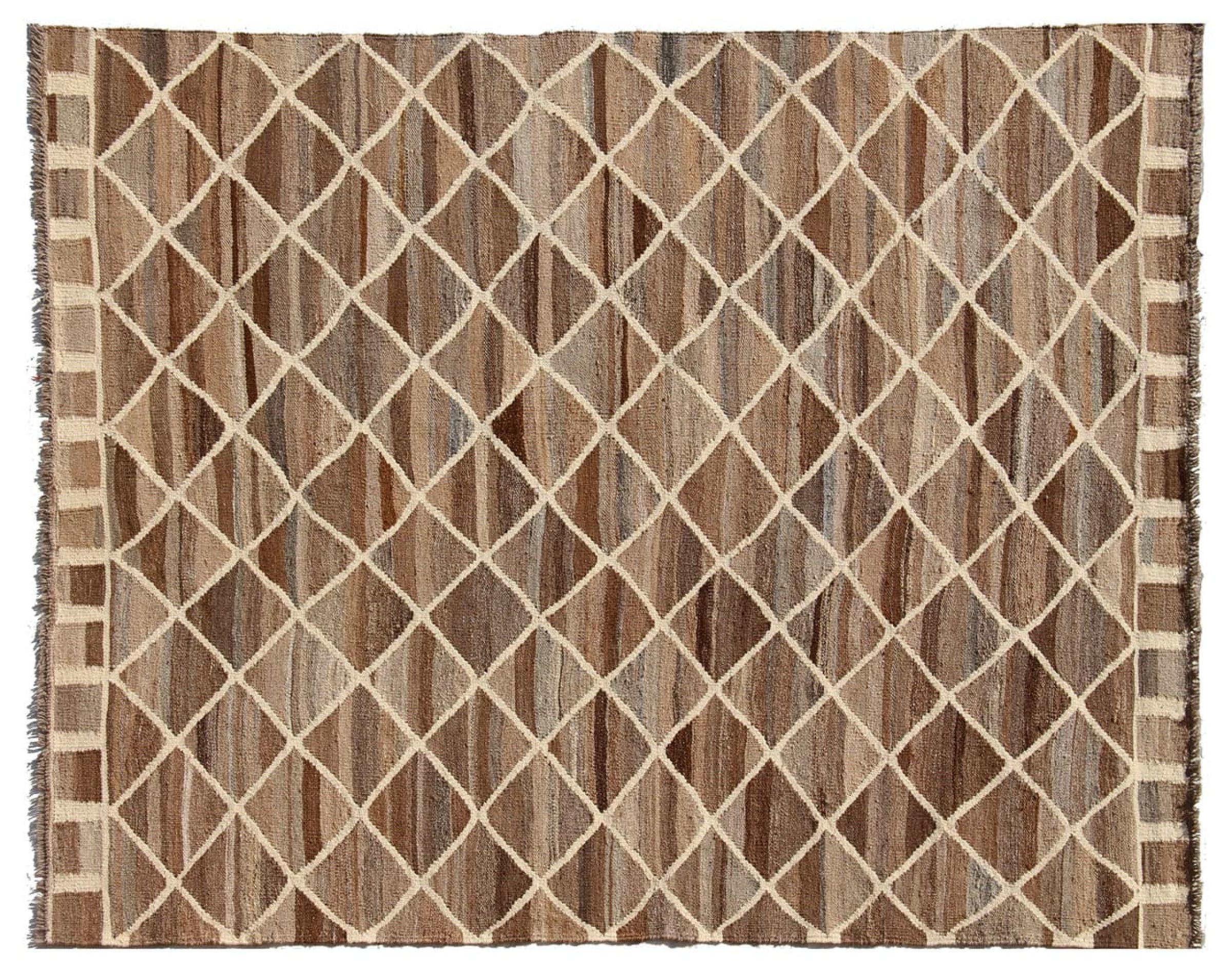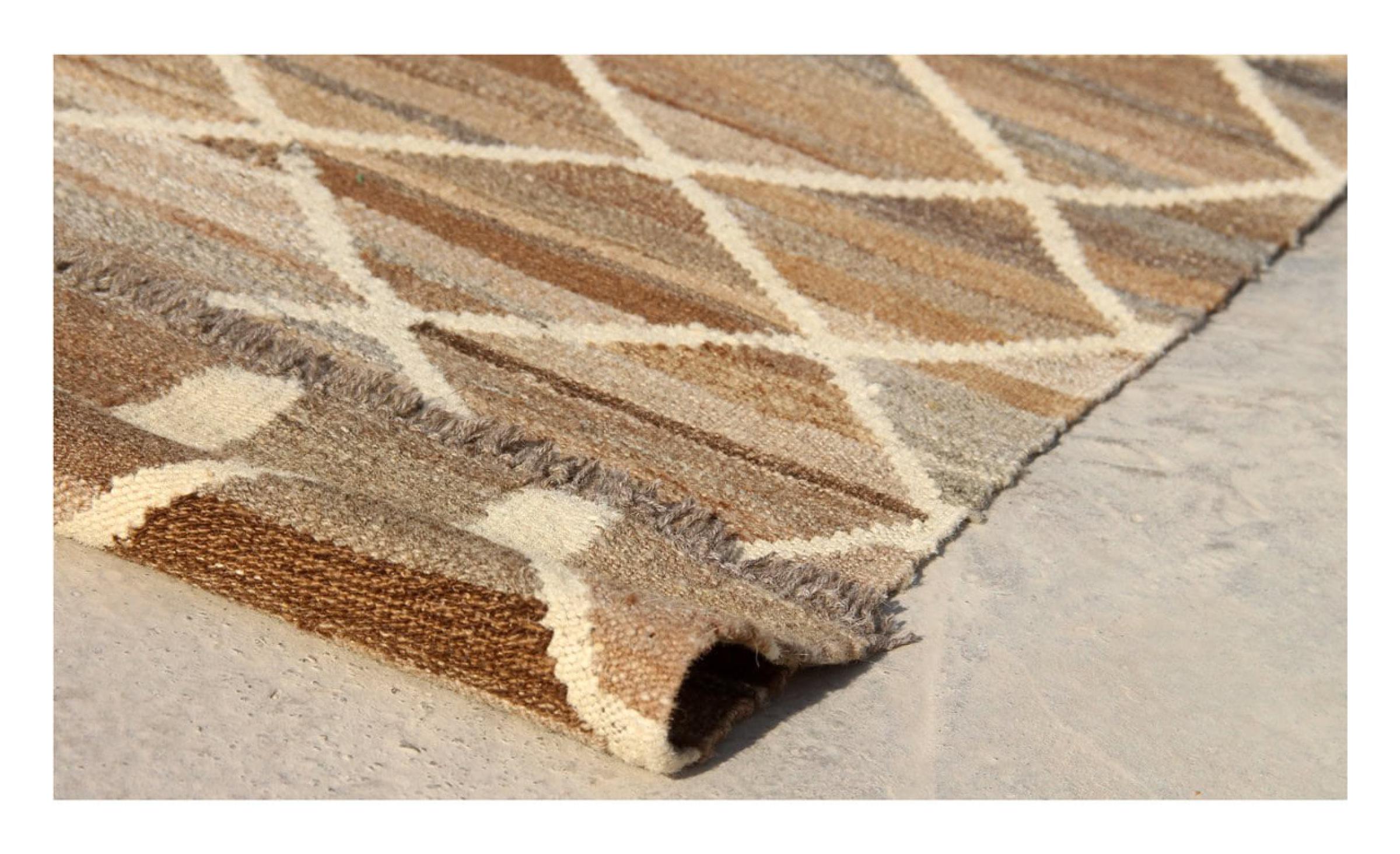 この絨毯は、平織りとして織機で手作業で作られたものです。フラットウィーブとは、パイルのないカーペットを指す言葉です。その名の通り、この絨毯は織られていて、結び目はありません。これにより、表面が構造化されたフラットカーペットが得られる。平織りは、結び目のあるカーペットよりも柔らかくなく、通常は薄くなります。同時に、彼らは製造するためにはるかに複雑ではなく、通常は両側(表と裏)からレイアウトすることができます。彼らのパターンは通常、生地によって決定される幾何学的なものです。