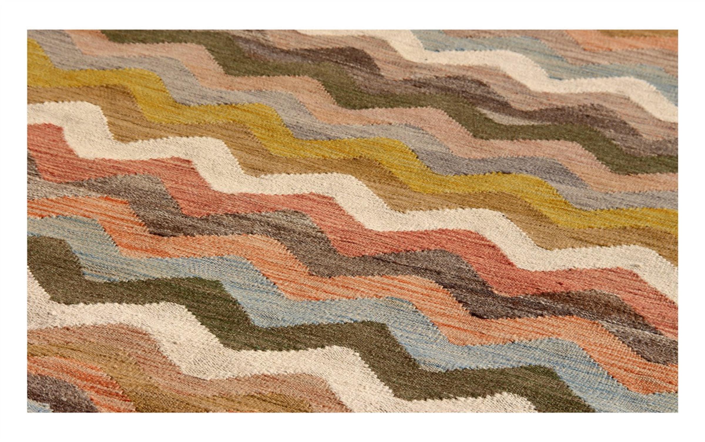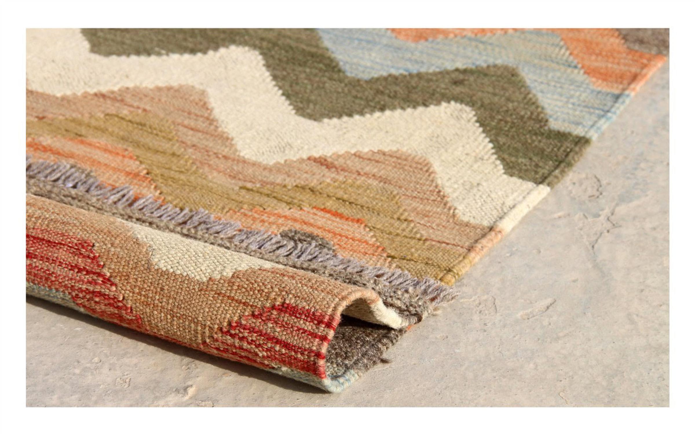 この絨毯は、平織りとして織機で手作業で作られたものです。フラットウィーブとは、パイルのないカーペットを指す言葉です。その名の通り、この絨毯は織られていて、結び目はありません。これにより、表面が構造化されたフラットカーペットが得られる。平織りは、結び目のあるカーペットよりも柔らかくなく、通常は薄くなります。同時に、彼らは製造するためにはるかに複雑ではなく、通常は両側(表と裏)からレイアウトすることができます。彼らのパターンは通常、生地によって決定される幾何学的なものです。
