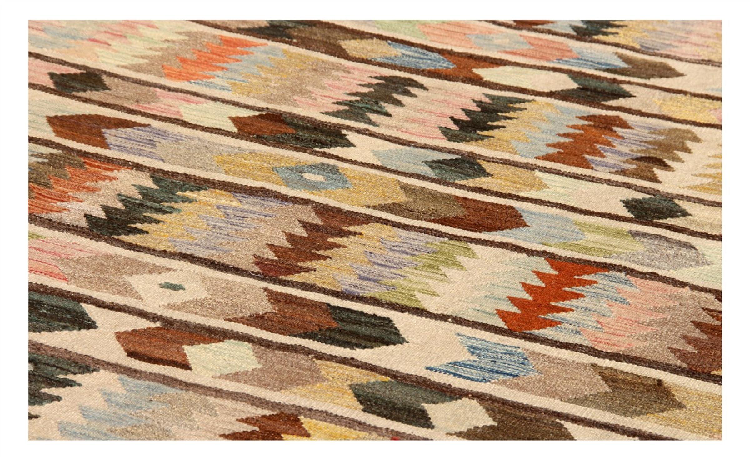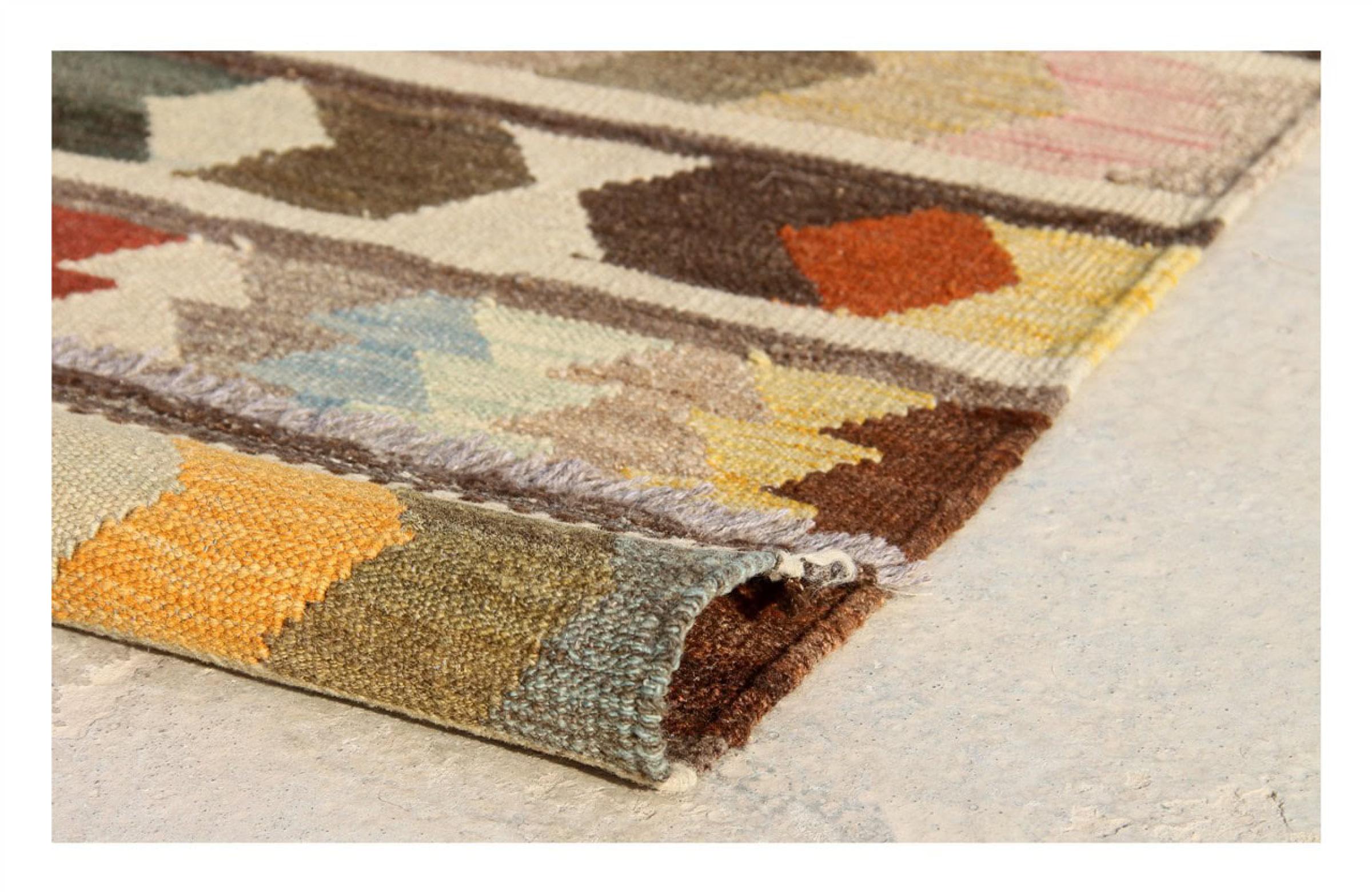 この絨毯は、平織りとして織機で手作業で作られたものです。フラットウィーブとは、パイルのないカーペットを指す言葉です。その名の通り、この絨毯は織られていて、結び目はありません。これにより、表面が構造化されたフラットカーペットが得られる。平織りは、結び目のあるカーペットよりも柔らかくなく、通常は薄くなります。同時に、彼らは製造するためにはるかに複雑ではなく、通常は両側(表と裏)からレイアウトすることができます。彼らのパターンは通常、生地によって決定される幾何学的なものです。