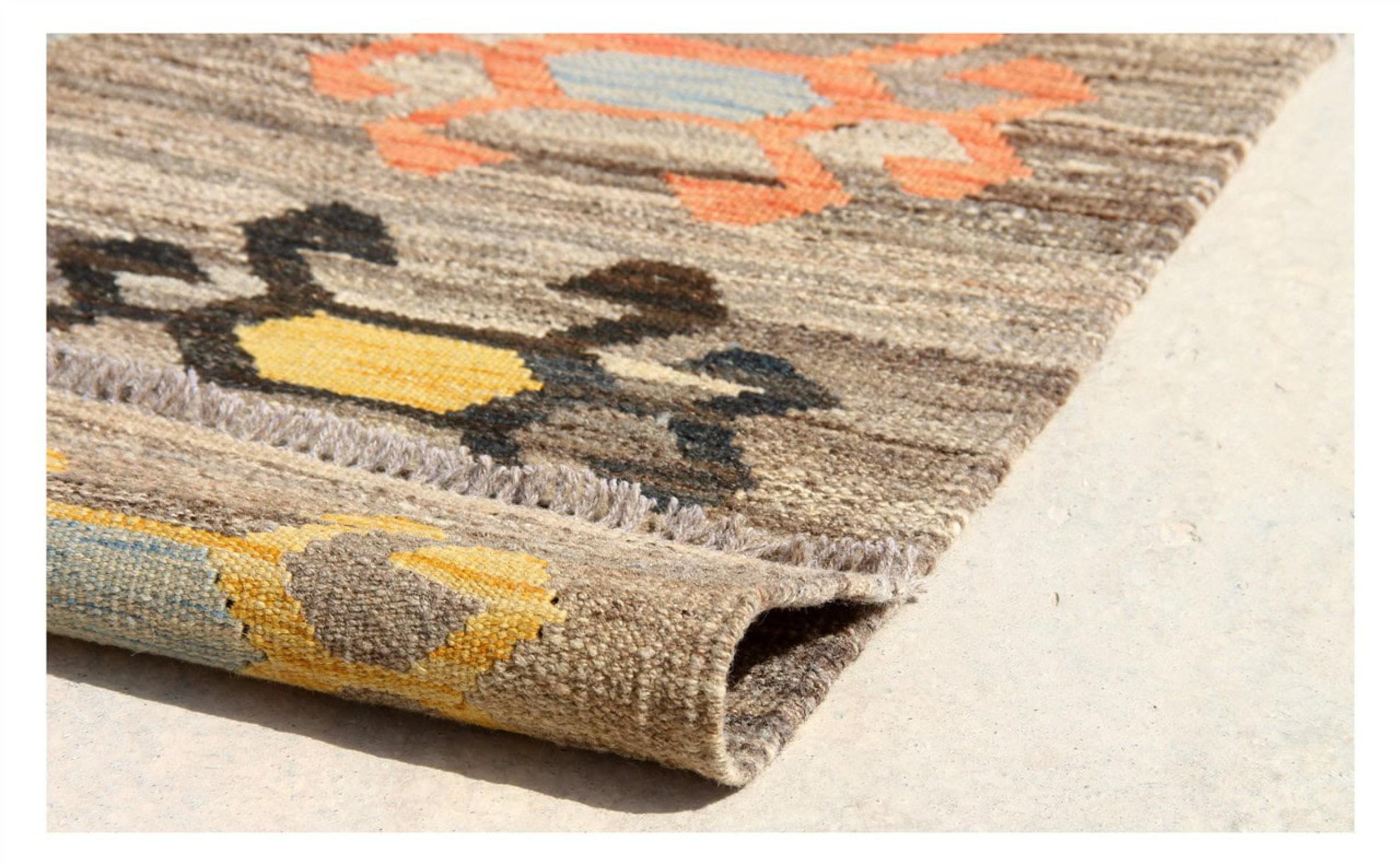 この絨毯は、平織りとして織機で手作業で作られたものです。フラットウィーブとは、パイルのないカーペットを指す言葉です。その名の通り、この絨毯は織られていて、結び目はありません。これにより、表面が構造化されたフラットカーペットが得られる。平織りは、結び目のあるカーペットよりも柔らかくなく、通常は薄くなります。同時に、彼らは製造するためにはるかに複雑ではなく、通常は両側(表と裏)からレイアウトすることができます。彼らのパターンは通常、生地によって決定される幾何学的なものです。