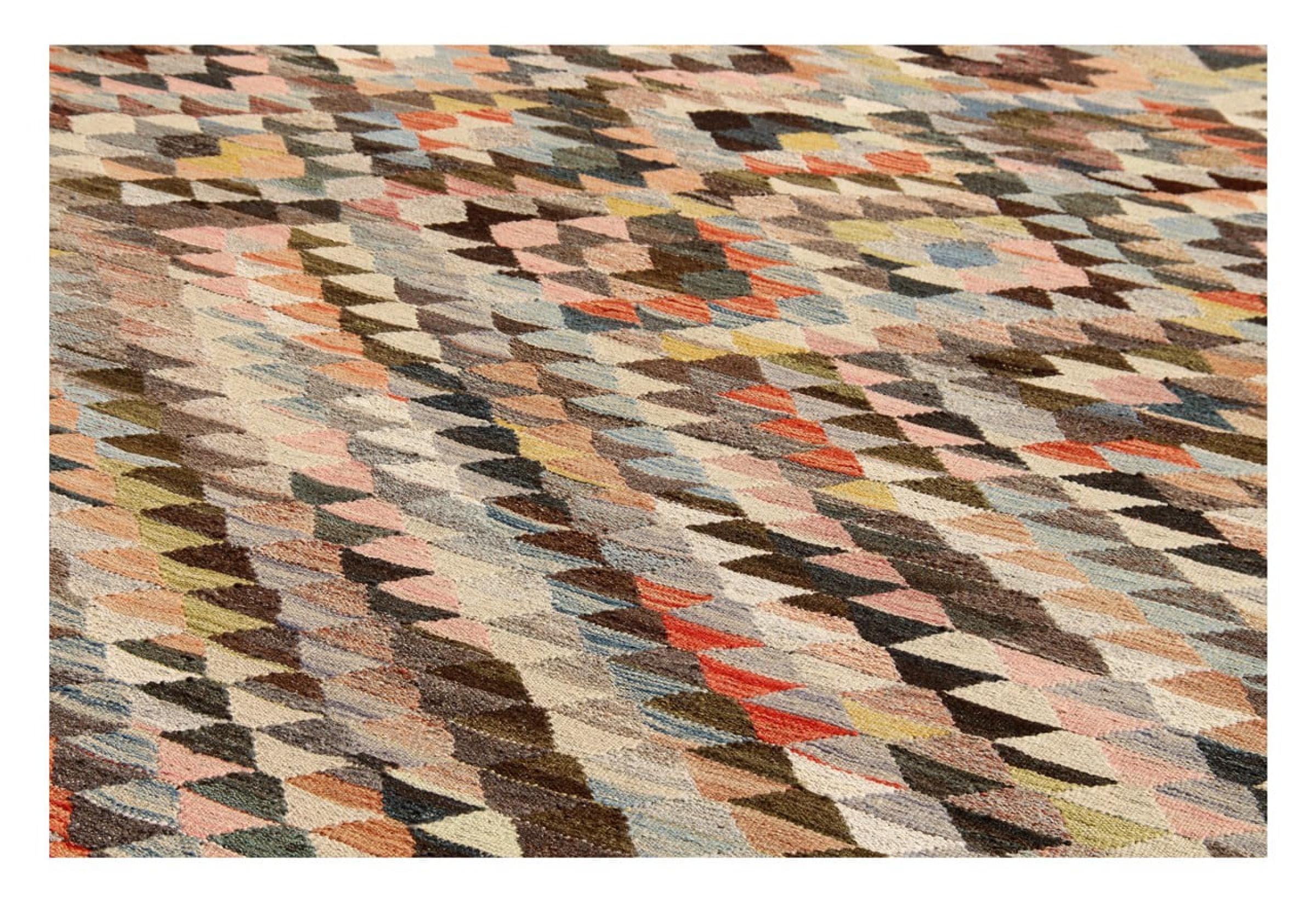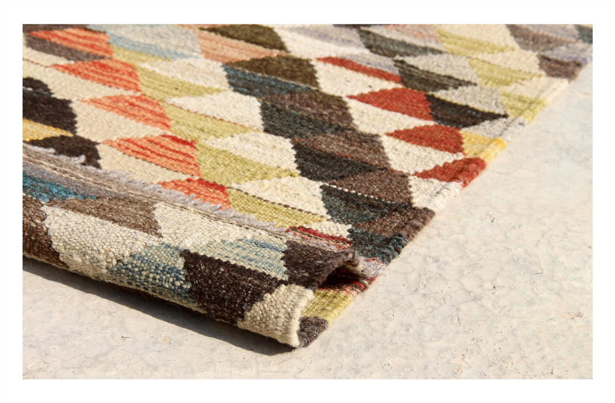 この絨毯は、平織りとして織機で手作業で作られたものです。フラットウィーブとは、パイルのないカーペットを指す言葉です。その名の通り、この絨毯は織られていて、結び目はありません。これにより、表面が構造化されたフラットカーペットが得られる。平織りは、結び目のあるカーペットよりも柔らかくなく、通常は薄くなります。同時に、彼らは製造するためにはるかに複雑ではなく、通常は両側(表と裏)からレイアウトすることができます。彼らのパターンは通常、生地によって決定される幾何学的なものです。