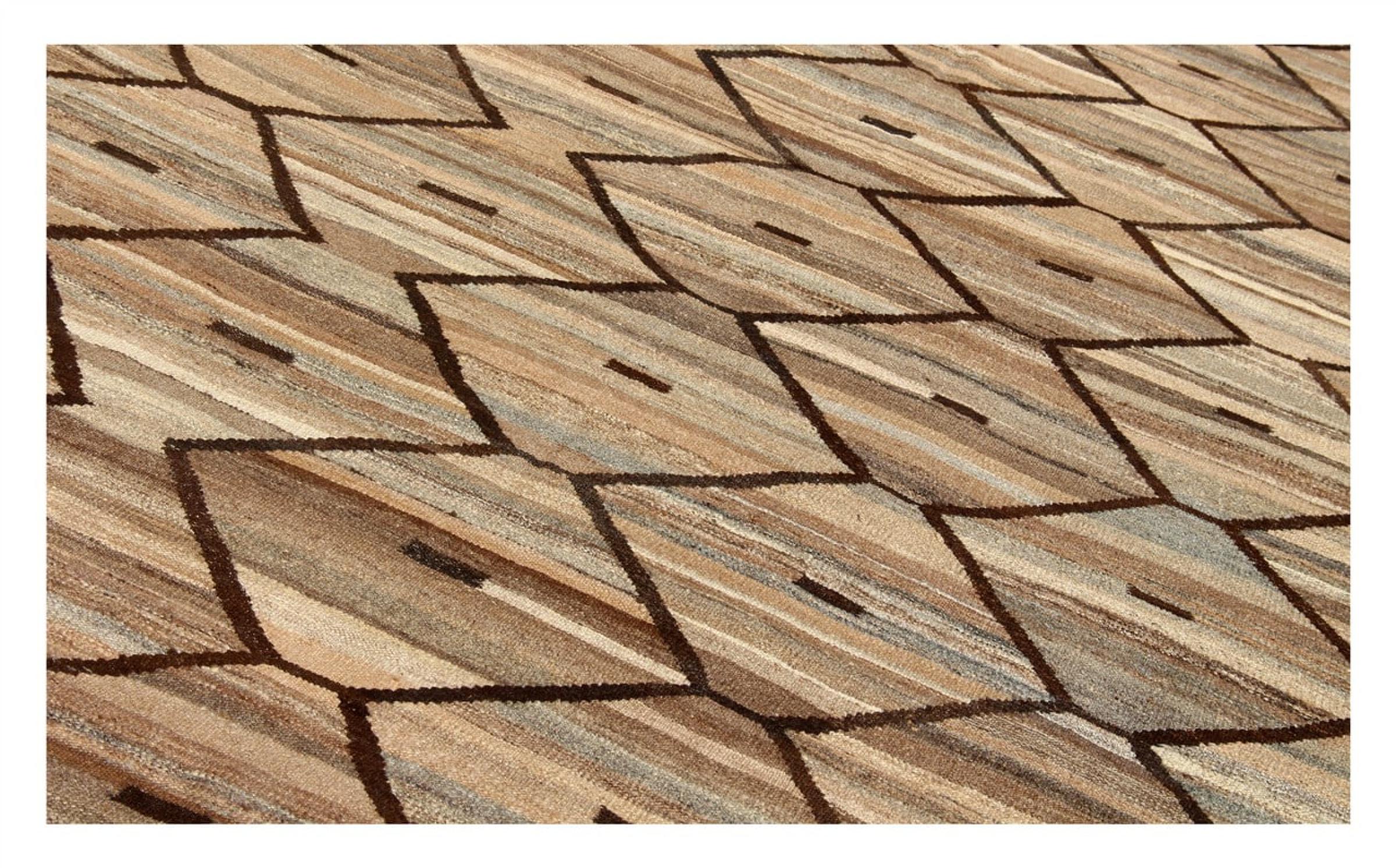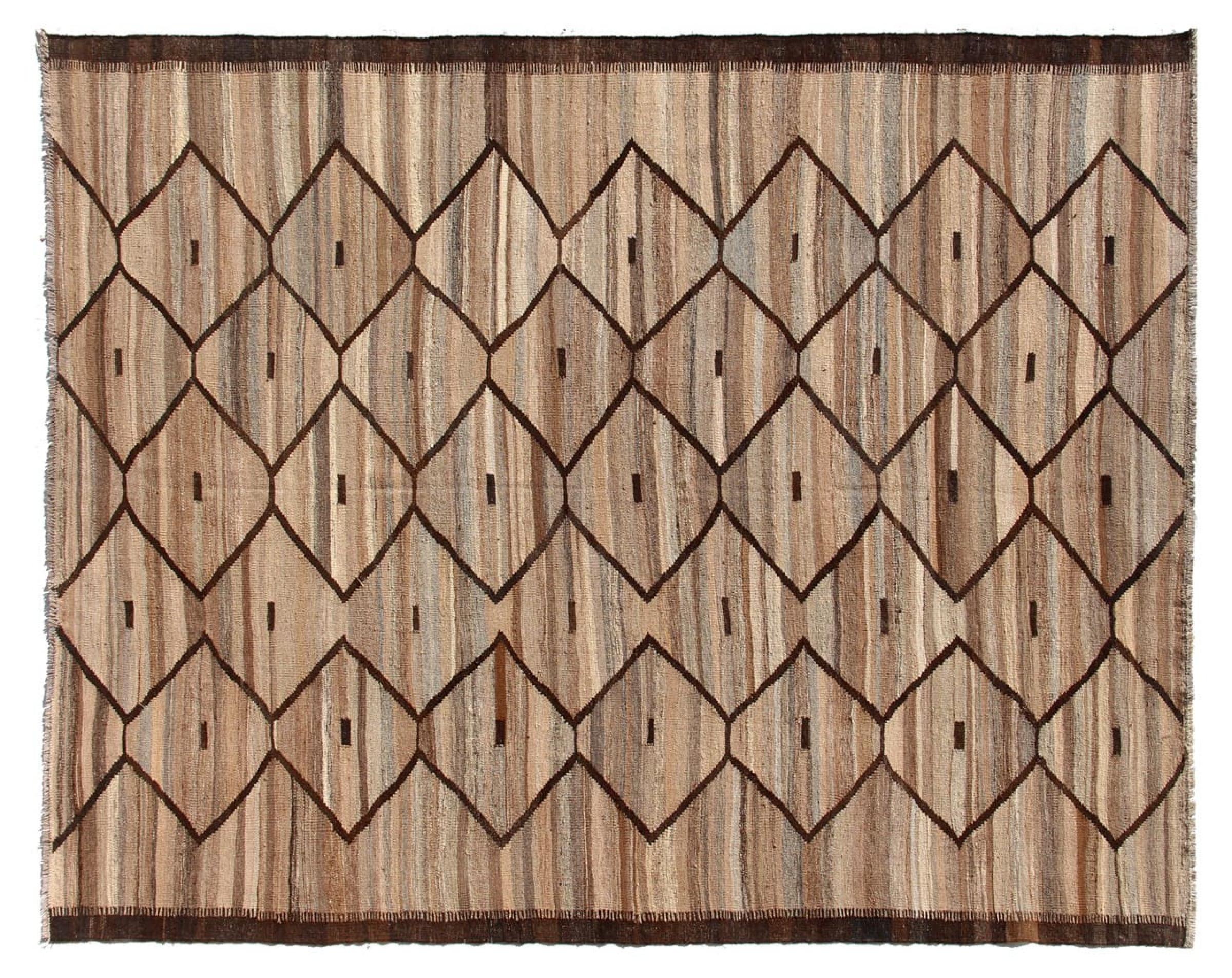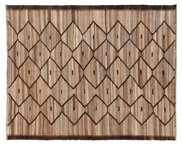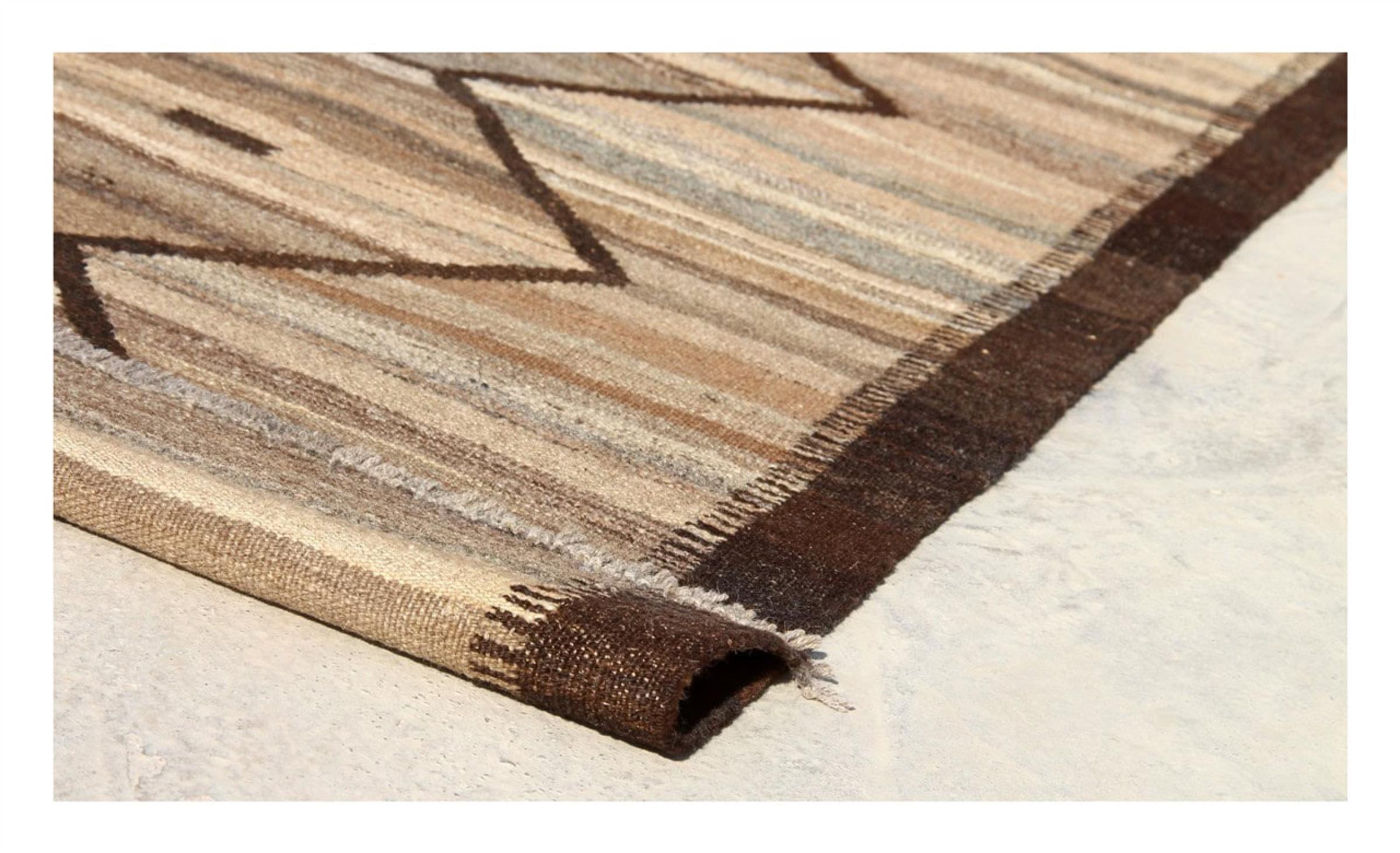 この絨毯は、平織りとして織機で手作業で作られたものです。フラットウィーブとは、パイルのないカーペットを指す言葉です。その名の通り、この絨毯は織られていて、結び目はありません。これにより、表面が構造化されたフラットカーペットが得られる。平織りは、結び目のあるカーペットよりも柔らかくなく、通常は薄くなります。同時に、彼らは製造するためにはるかに複雑ではなく、通常は両側(表と裏)からレイアウトすることができます。彼らのパターンは通常、生地によって決定される幾何学的なものです。