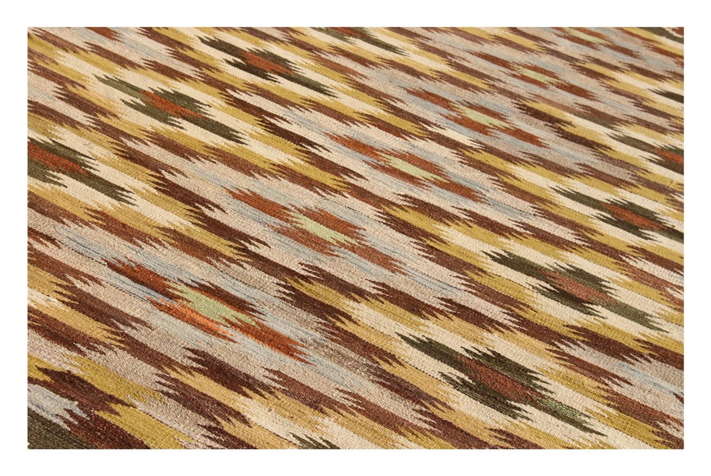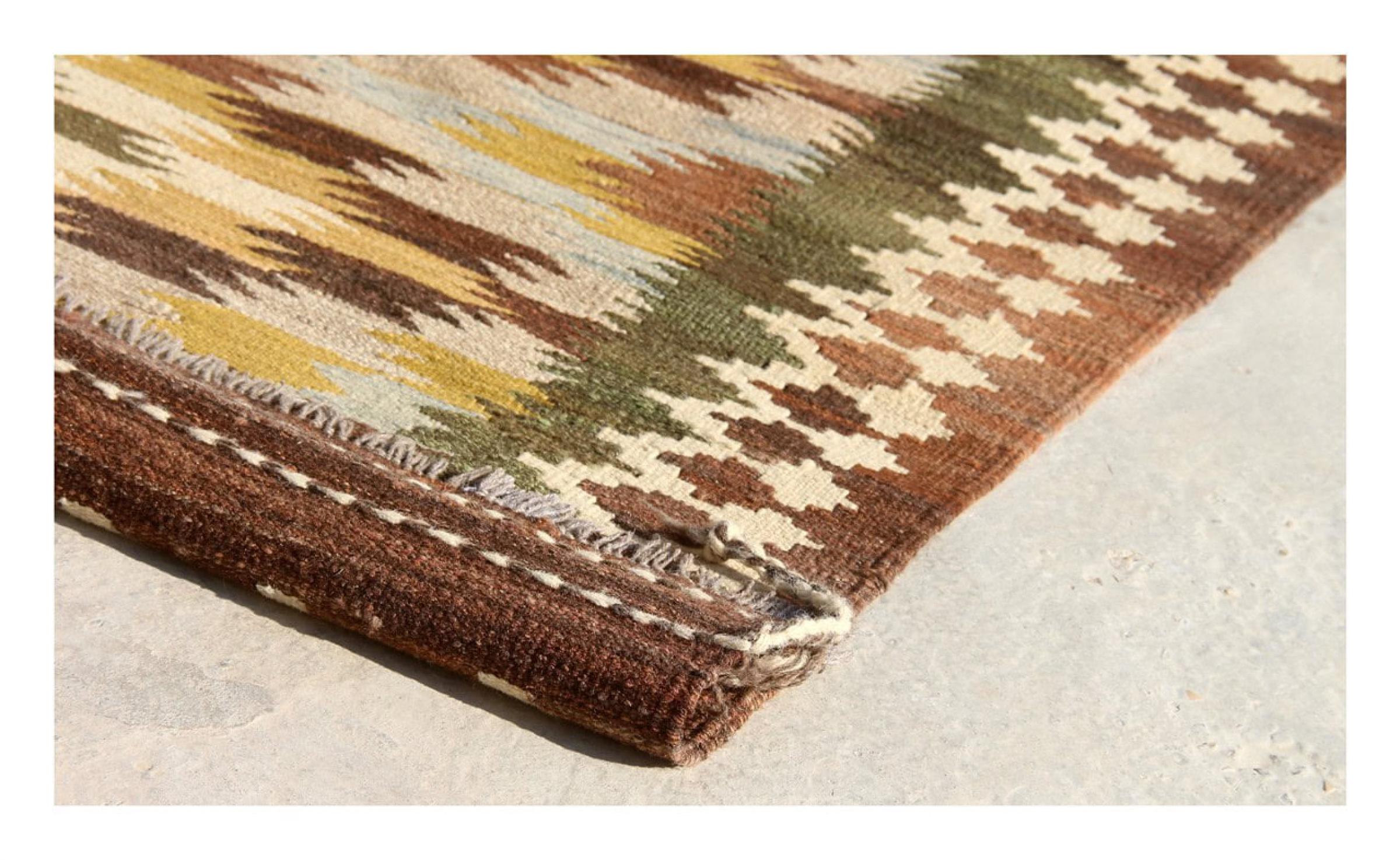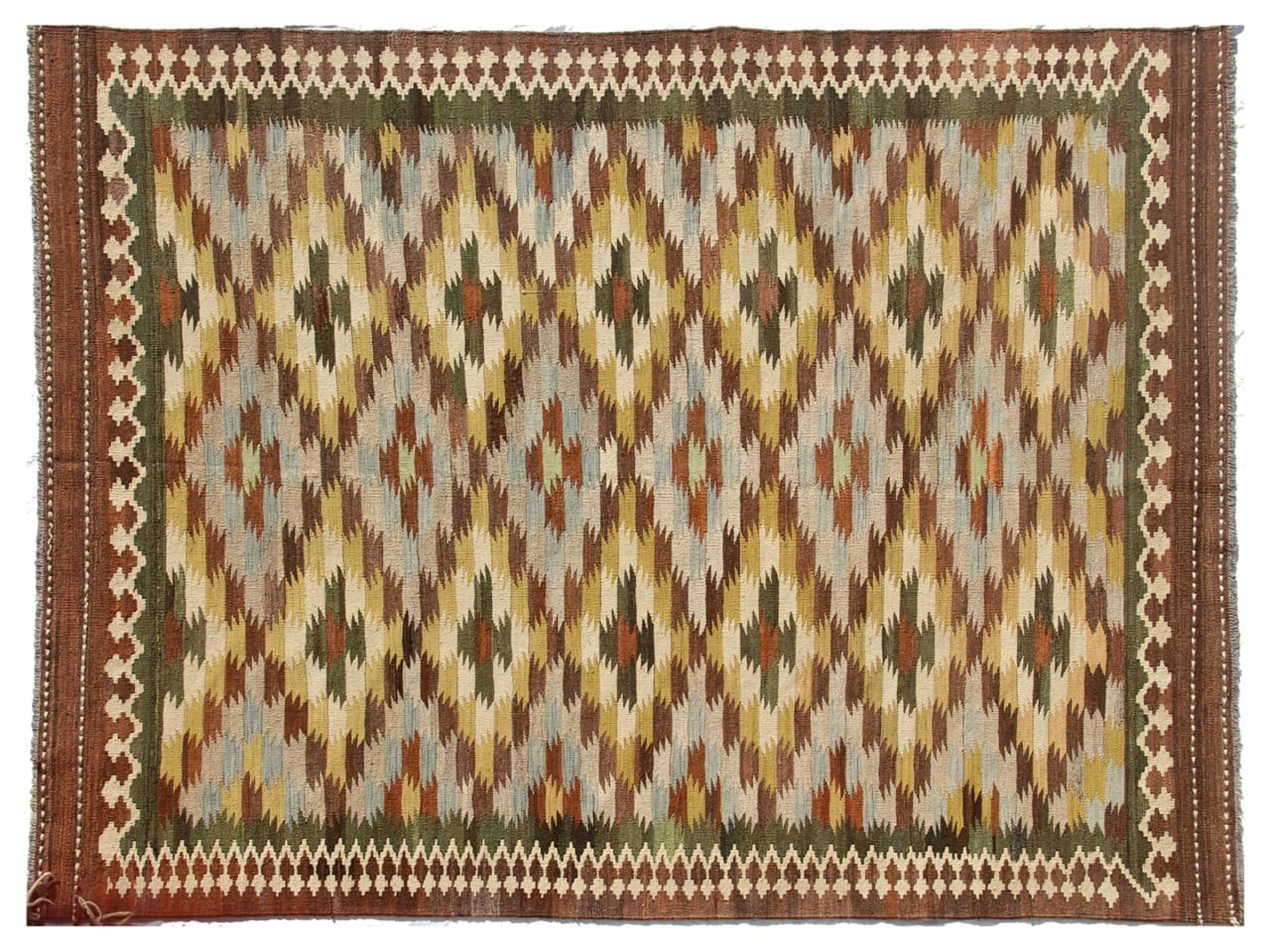 この絨毯は、平織りとして織機で手作業で作られたものです。フラットウィーブとは、パイルのないカーペットを指す言葉です。その名の通り、この絨毯は織られていて、結び目はありません。これにより、表面が構造化されたフラットカーペットが得られる。平織りは、結び目のあるカーペットよりも柔らかくなく、通常は薄くなります。同時に、彼らは製造するためにはるかに複雑ではなく、通常は両側(表と裏)からレイアウトすることができます。彼らのパターンは通常、生地によって決定される幾何学的なものです。