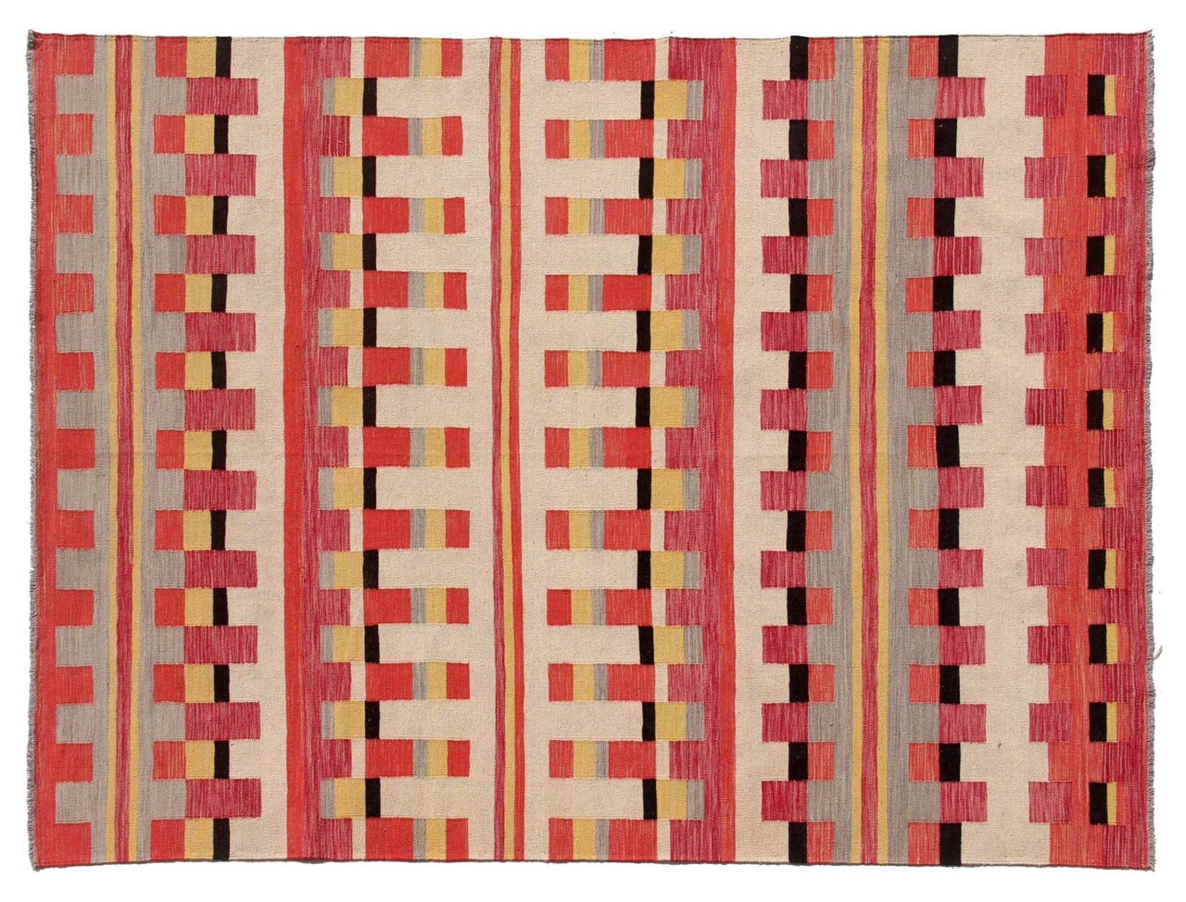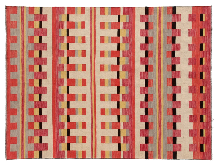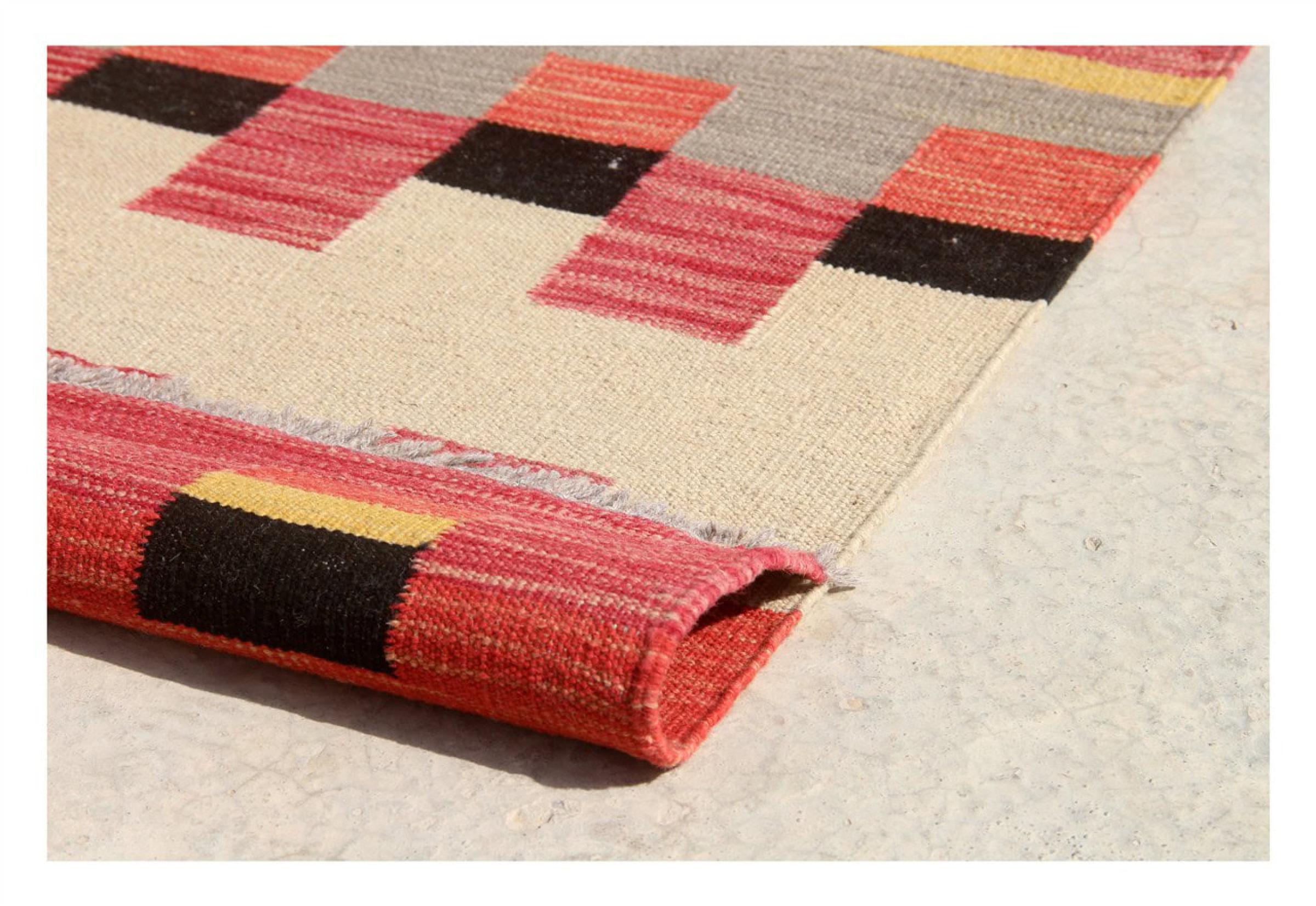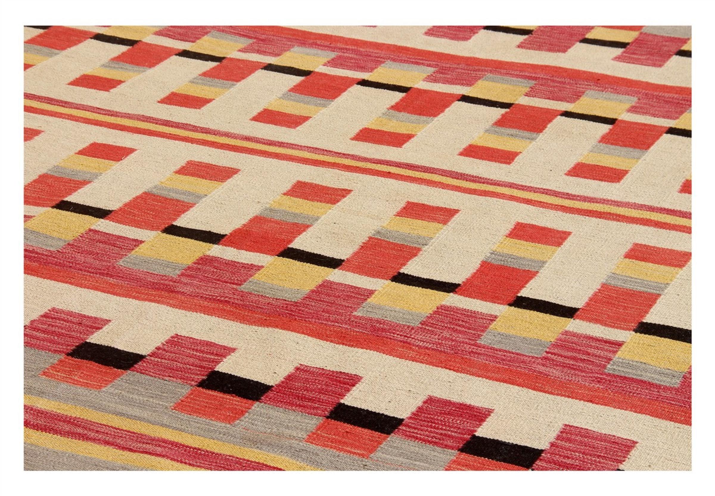 この絨毯は、平織りとして織機で手作業で作られたものです。フラットウィーブとは、パイルのないカーペットを指す言葉です。その名の通り、この絨毯は織られていて、結び目はありません。これにより、表面が構造化されたフラットカーペットが得られる。平織りは、結び目のあるカーペットよりも柔らかくなく、通常は薄くなります。同時に、彼らは製造するためにはるかに複雑ではなく、通常は両側(表と裏)からレイアウトすることができます。彼らのパターンは通常、生地によって決定される幾何学的なものです。