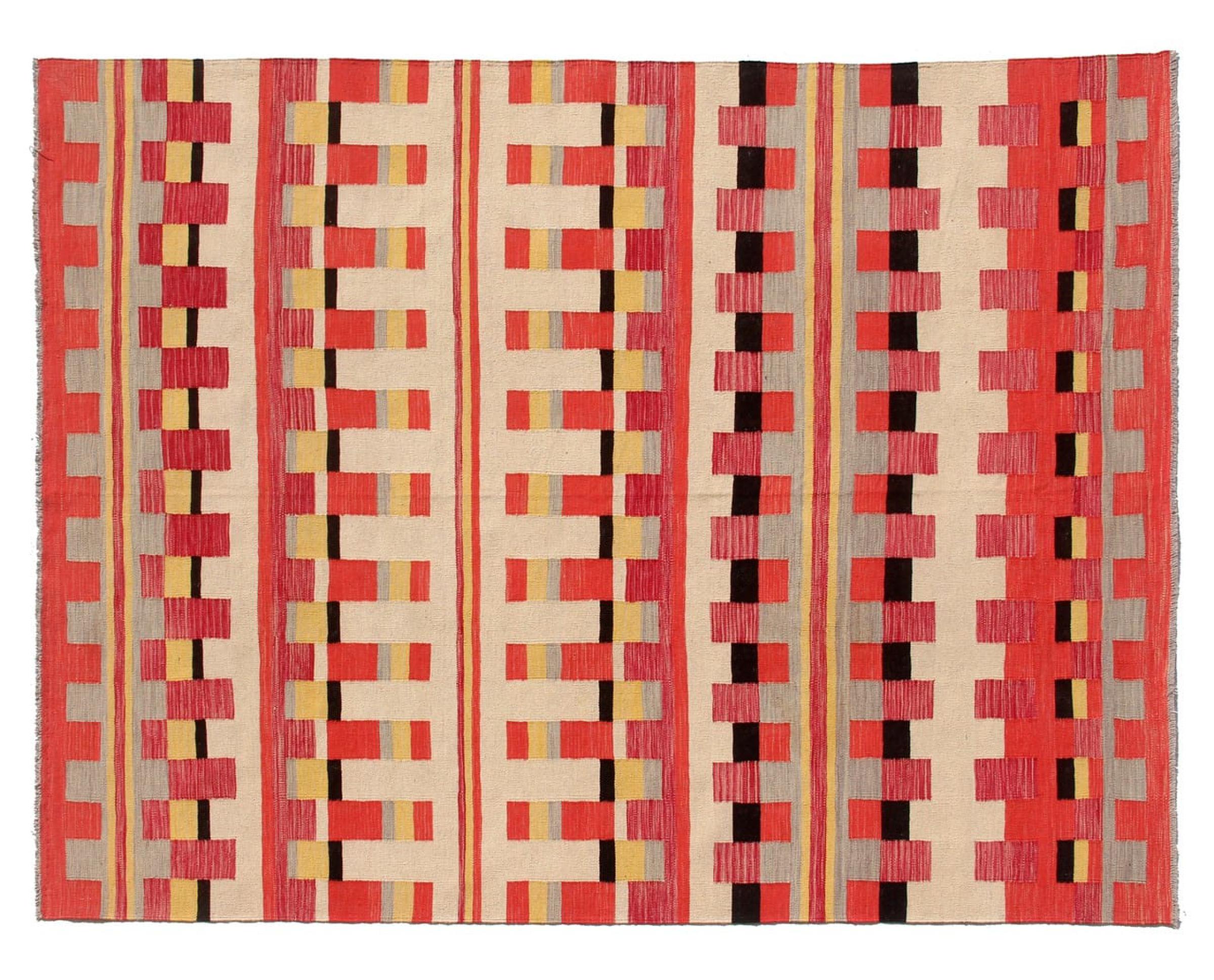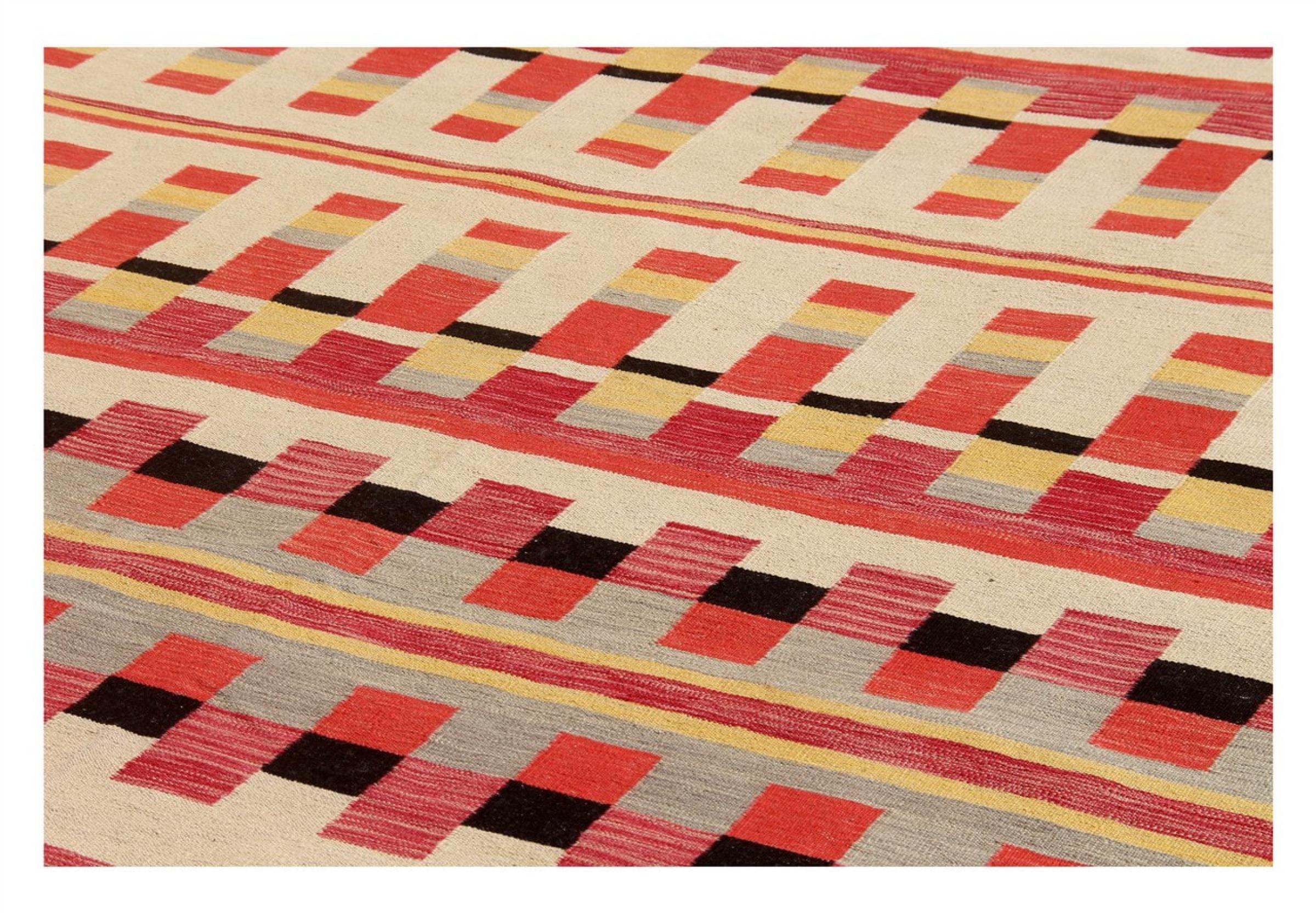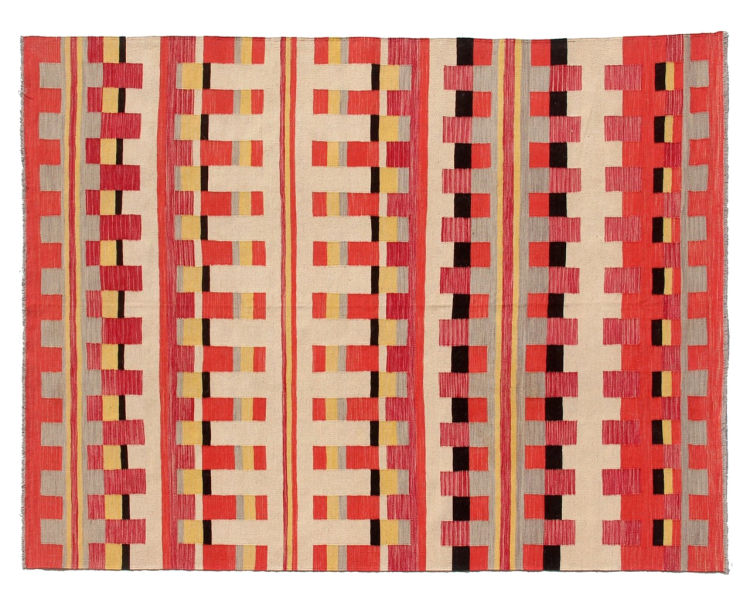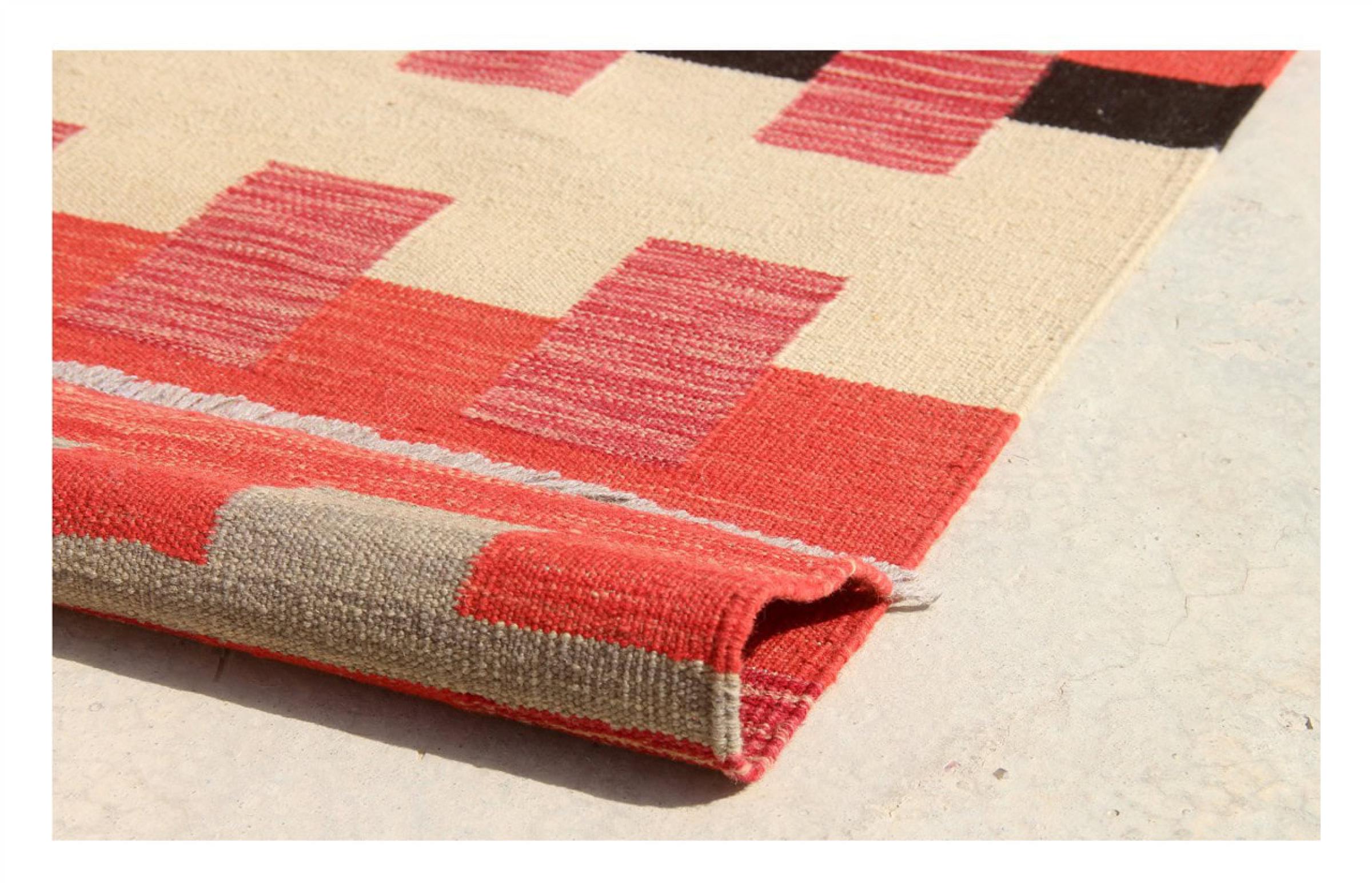 この絨毯は、平織りとして織機で手作業で作られたものです。フラットウィーブとは、パイルのないカーペットを指す言葉です。その名の通り、この絨毯は織られていて、結び目はありません。これにより、表面が構造化されたフラットカーペットが得られる。平織りは、結び目のあるカーペットよりも柔らかくなく、通常は薄くなります。同時に、彼らは製造するためにはるかに複雑ではなく、通常は両側(表と裏)からレイアウトすることができます。彼らのパターンは通常、生地によって決定される幾何学的なものです。