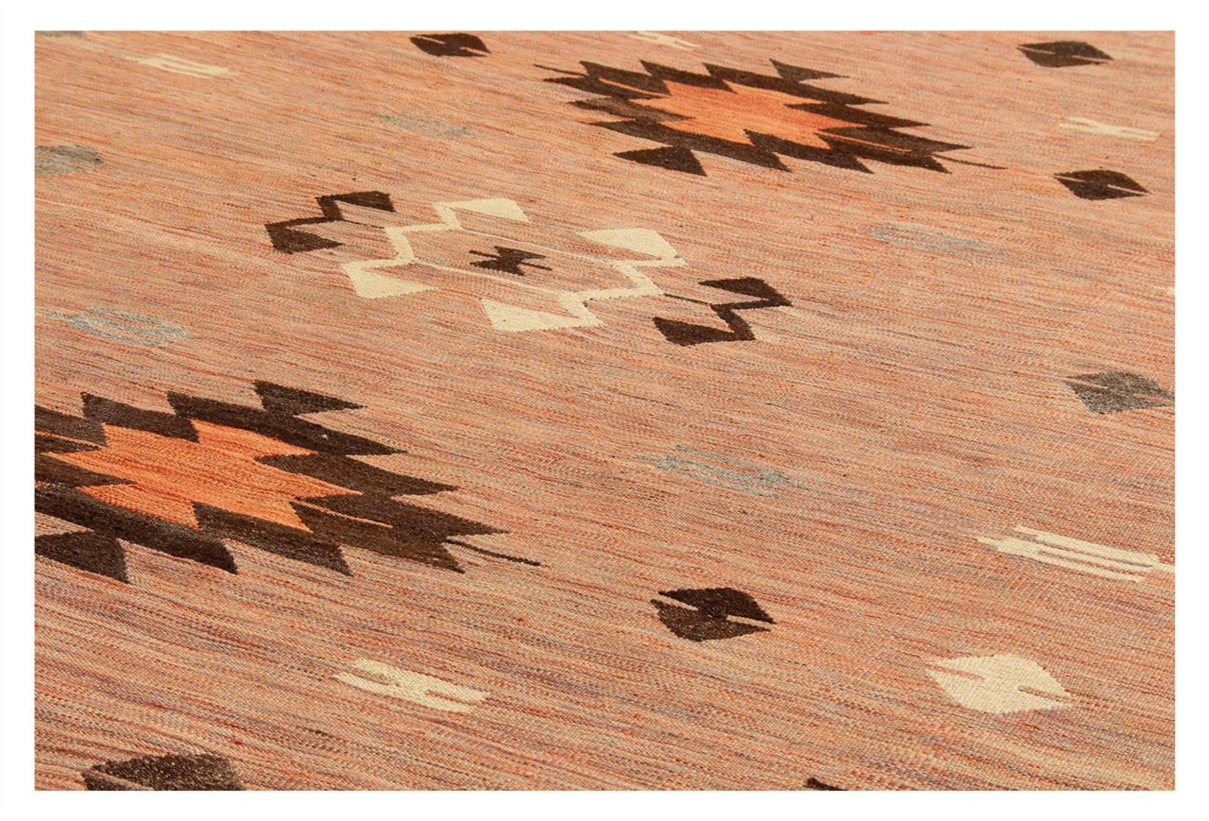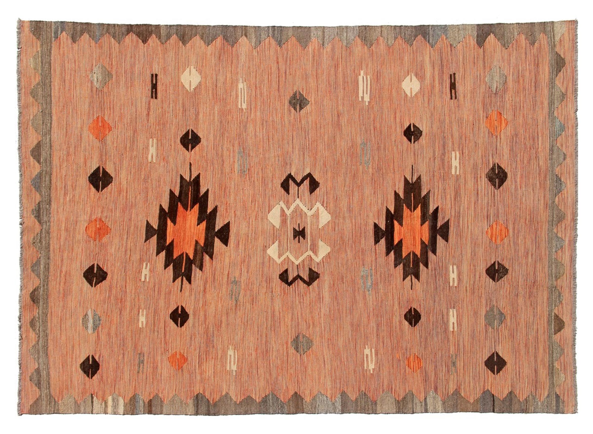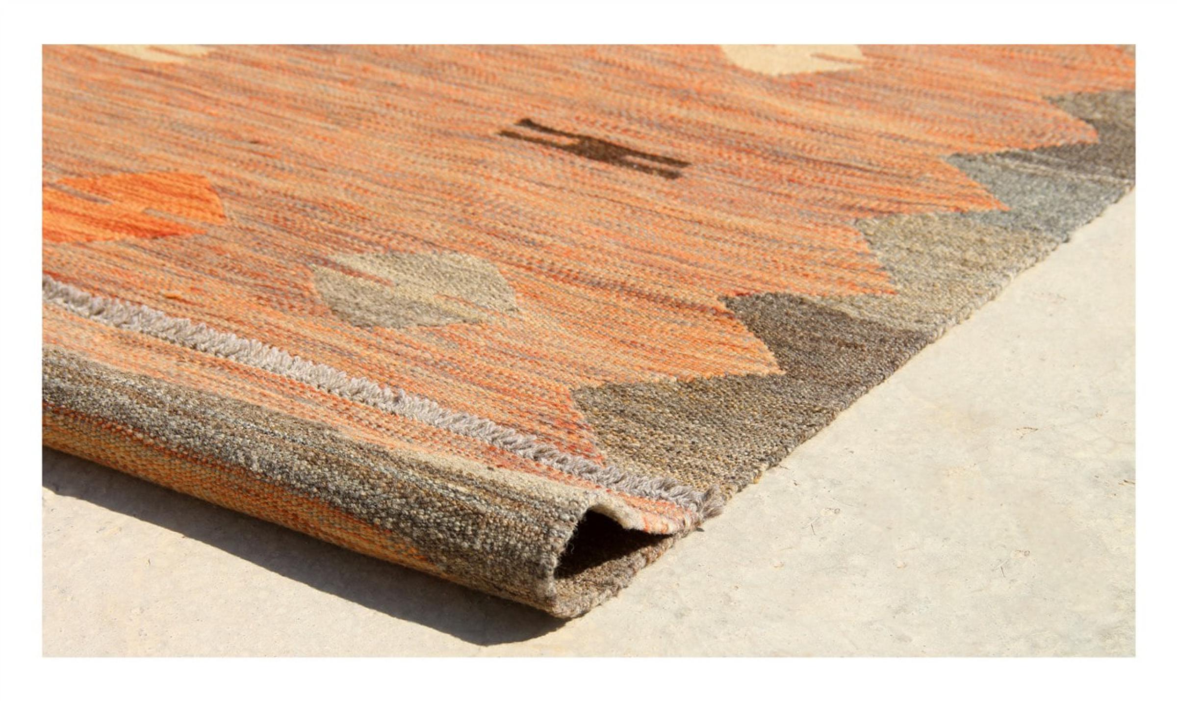 この絨毯は、平織りとして織機で手作業で作られたものです。フラットウィーブとは、パイルのないカーペットを指す言葉です。その名の通り、この絨毯は織られていて、結び目はありません。これにより、表面が構造化されたフラットカーペットが得られる。平織りは、結び目のあるカーペットよりも柔らかくなく、通常は薄くなります。同時に、彼らは製造するためにはるかに複雑ではなく、通常は両側(表と裏)からレイアウトすることができます。彼らのパターンは通常、生地によって決定される幾何学的なものです。