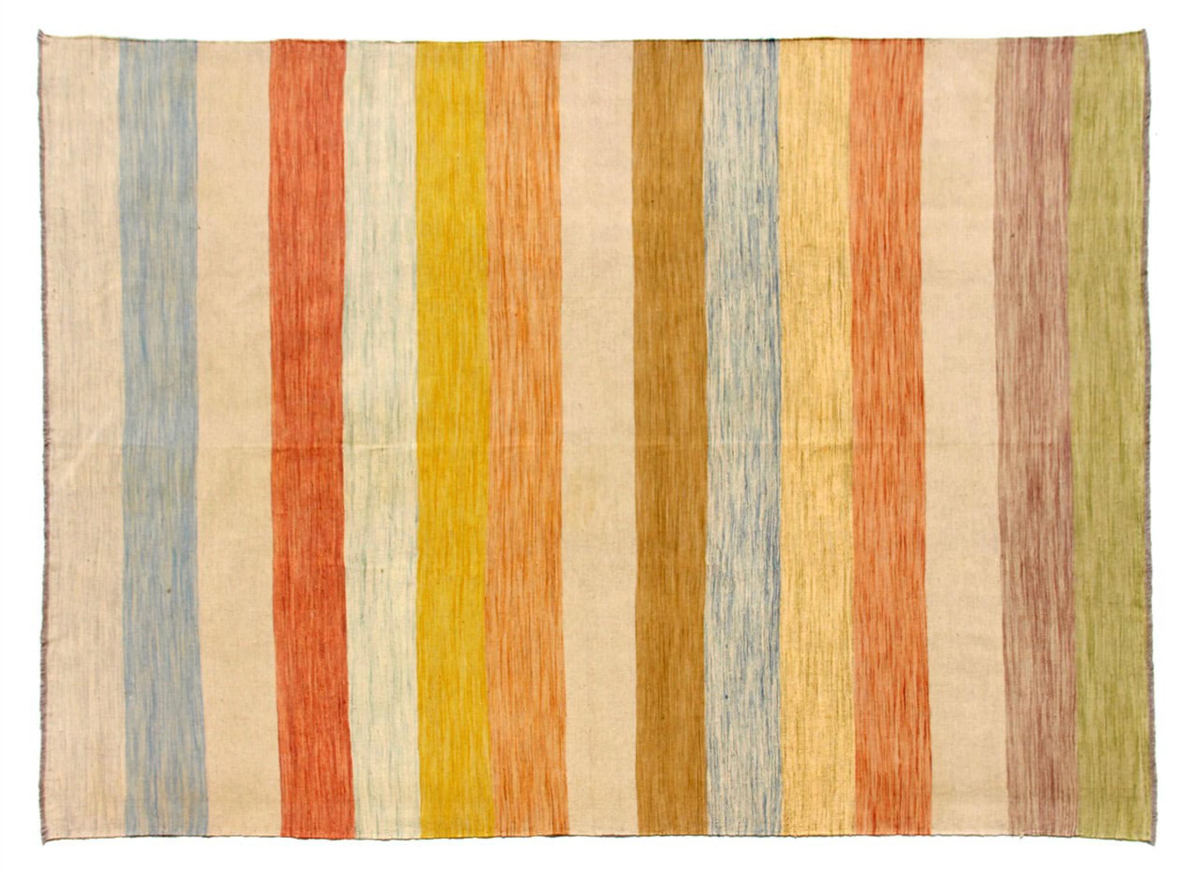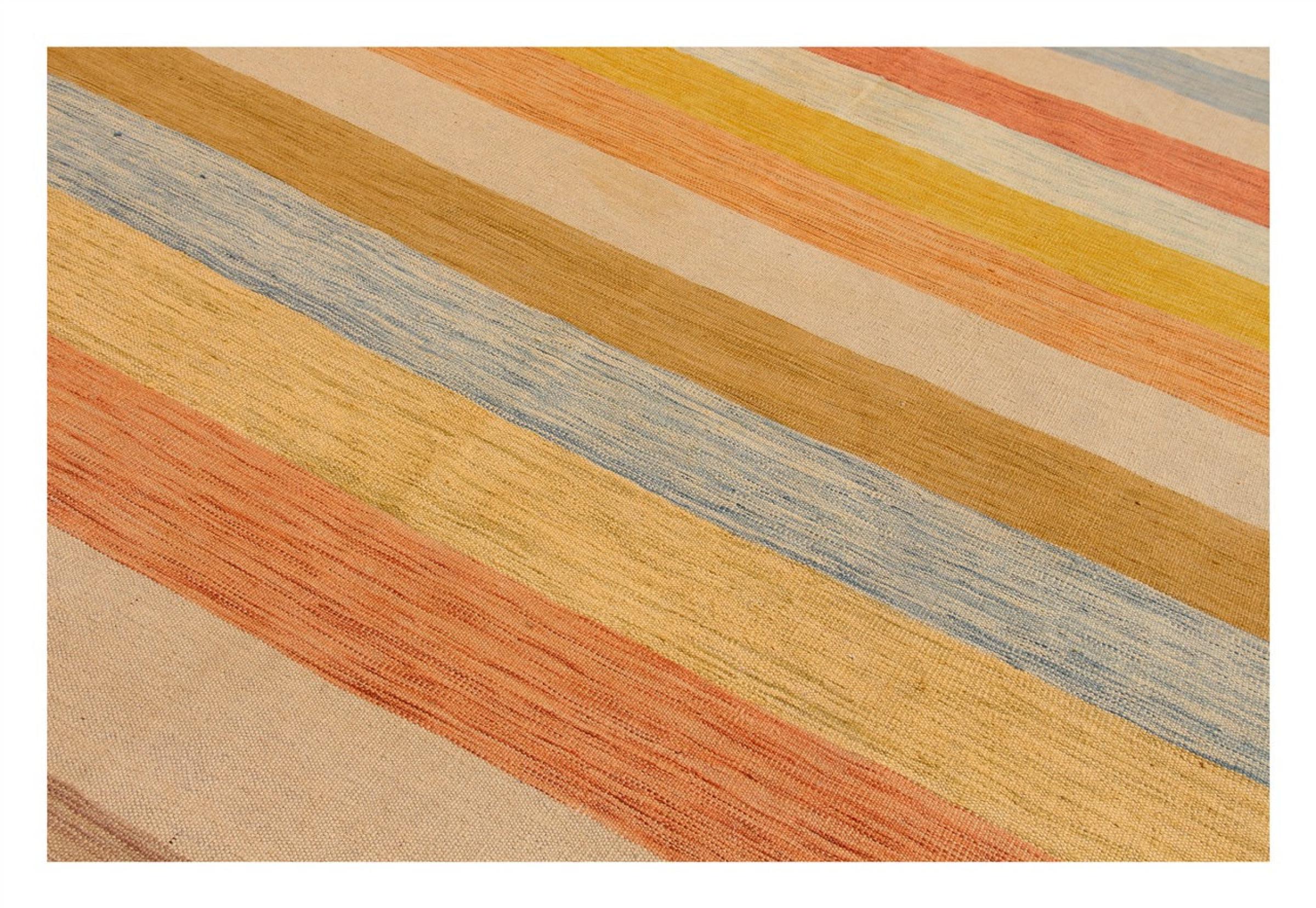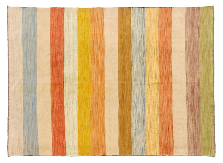 この絨毯は、平織りとして織機で手作業で作られたものです。フラットウィーブとは、パイルのないカーペットを指す言葉です。その名の通り、この絨毯は織られていて、結び目はありません。これにより、表面が構造化されたフラットカーペットが得られる。平織りは、結び目のあるカーペットよりも柔らかくなく、通常は薄くなります。同時に、彼らは製造するためにはるかに複雑ではなく、通常は両側(表と裏)からレイアウトすることができます。彼らのパターンは通常、生地によって決定される幾何学的なものです。