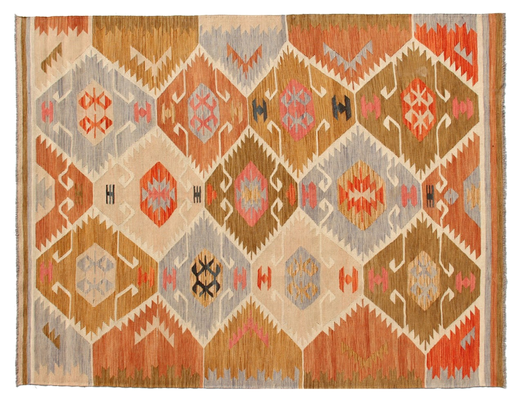 この絨毯は、平織りとして織機で手作業で作られたものです。フラットウィーブとは、パイルのないカーペットを指す言葉です。その名の通り、この絨毯は織られていて、結び目はありません。これにより、表面が構造化されたフラットカーペットが得られる。平織りは、結び目のあるカーペットよりも柔らかくなく、通常は薄くなります。同時に、彼らは製造するためにはるかに複雑ではなく、通常は両側(表と裏)からレイアウトすることができます。彼らのパターンは通常、生地によって決定される幾何学的なものです。