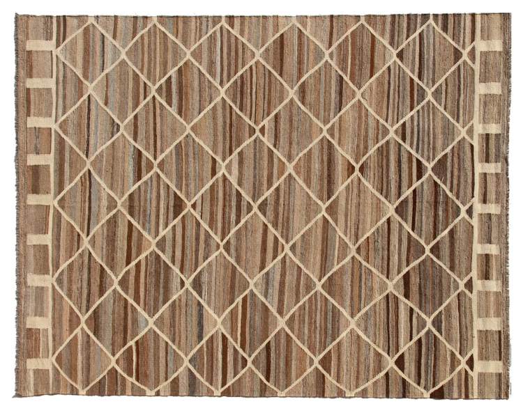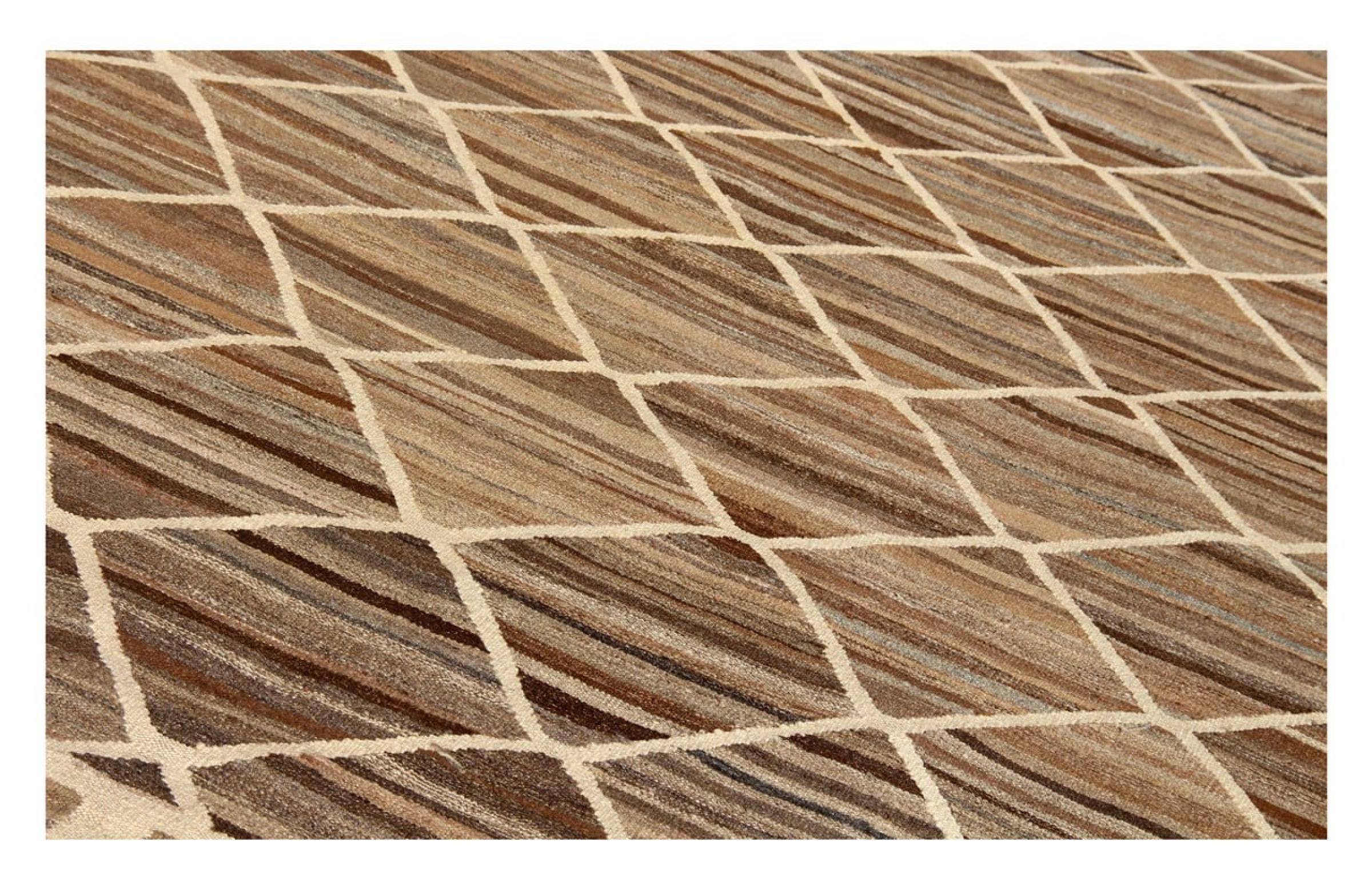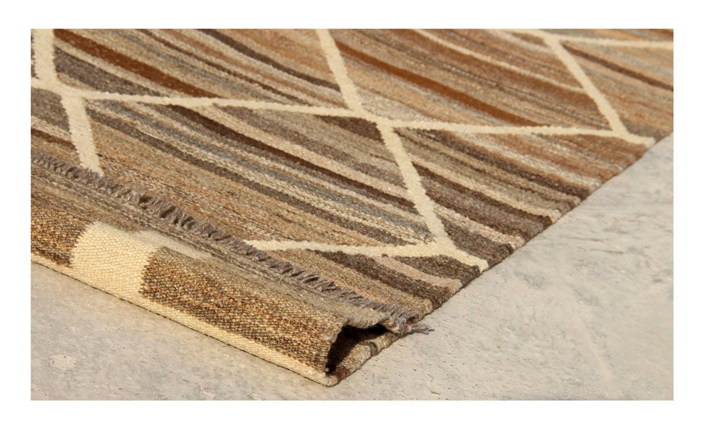 この絨毯は、平織りとして織機で手作業で作られたものです。フラットウィーブとは、パイルのないカーペットを指す言葉です。その名の通り、この絨毯は織られていて、結び目はありません。これにより、表面が構造化されたフラットカーペットが得られる。平織りは、結び目のあるカーペットよりも柔らかくなく、通常は薄くなります。同時に、彼らは製造するためにはるかに複雑ではなく、通常は両側(表と裏)からレイアウトすることができます。彼らのパターンは通常、生地によって決定される幾何学的なものです。