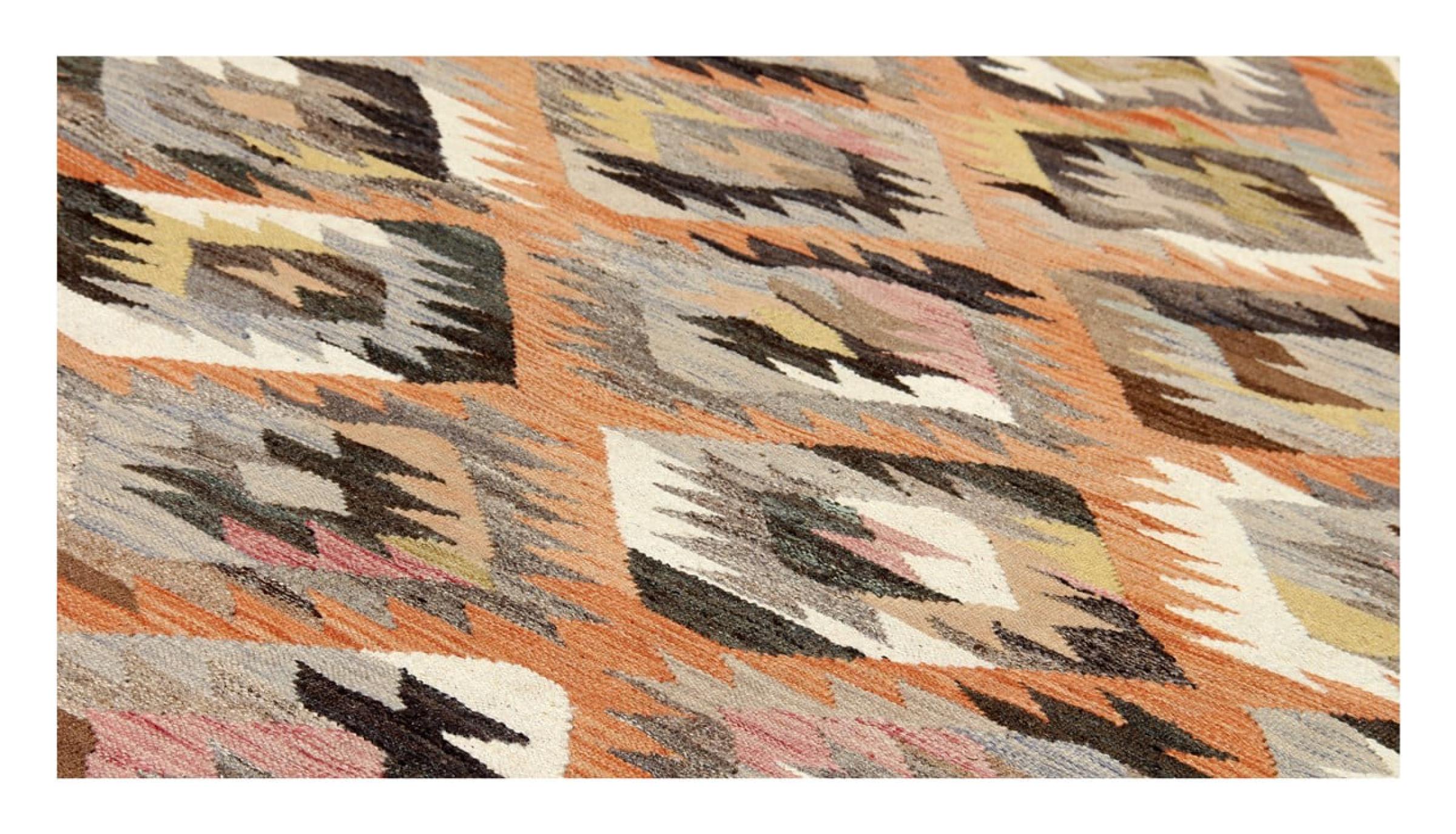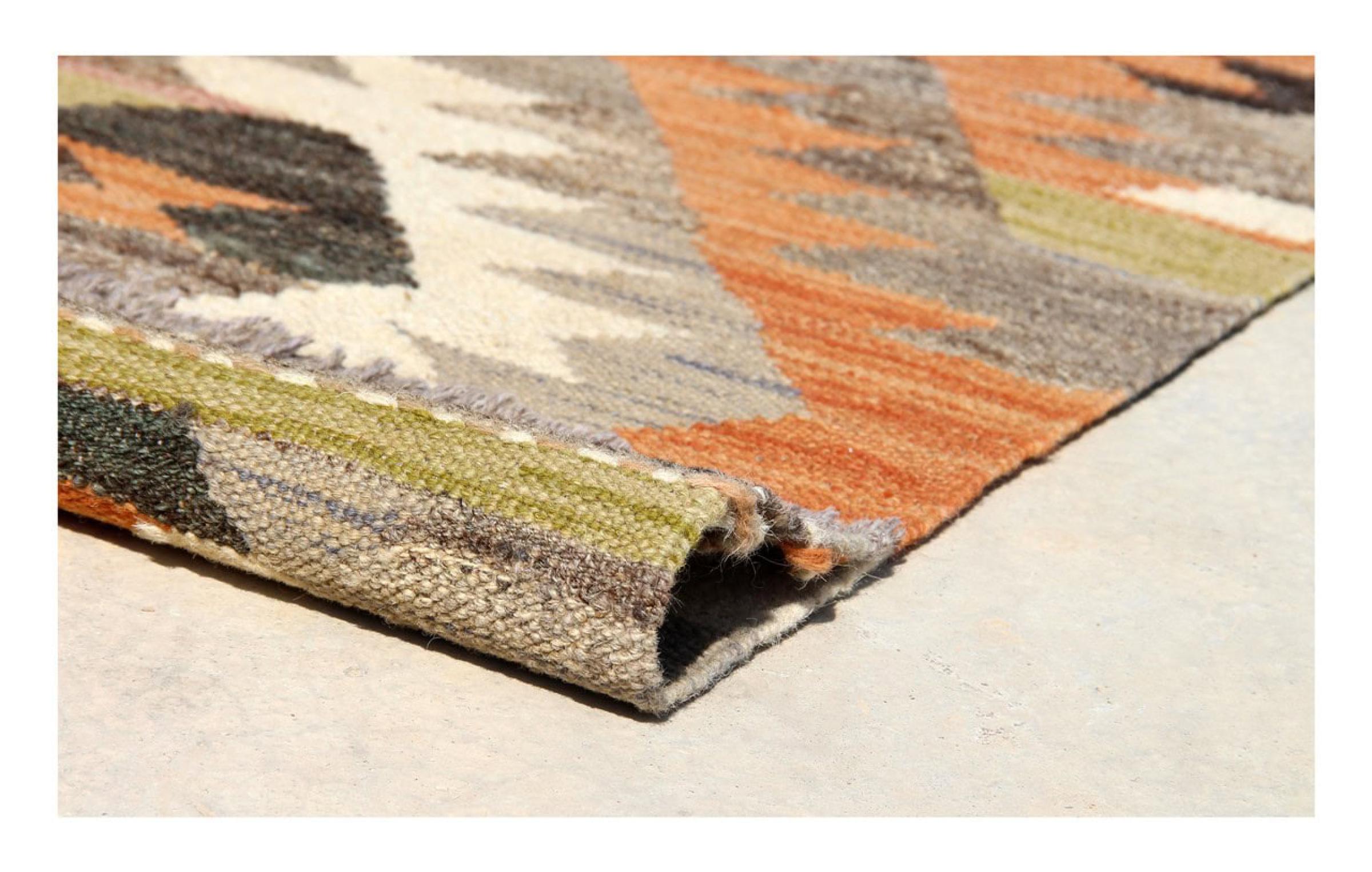 この絨毯は、平織りとして織機で手作業で作られたものです。フラットウィーブとは、パイルのないカーペットを指す言葉です。その名の通り、この絨毯は織られていて、結び目はありません。これにより、表面が構造化されたフラットカーペットが得られる。平織りは、結び目のあるカーペットよりも柔らかくなく、通常は薄くなります。同時に、彼らは製造するためにはるかに複雑ではなく、通常は両側(表と裏)からレイアウトすることができます。彼らのパターンは通常、生地によって決定される幾何学的なものです。