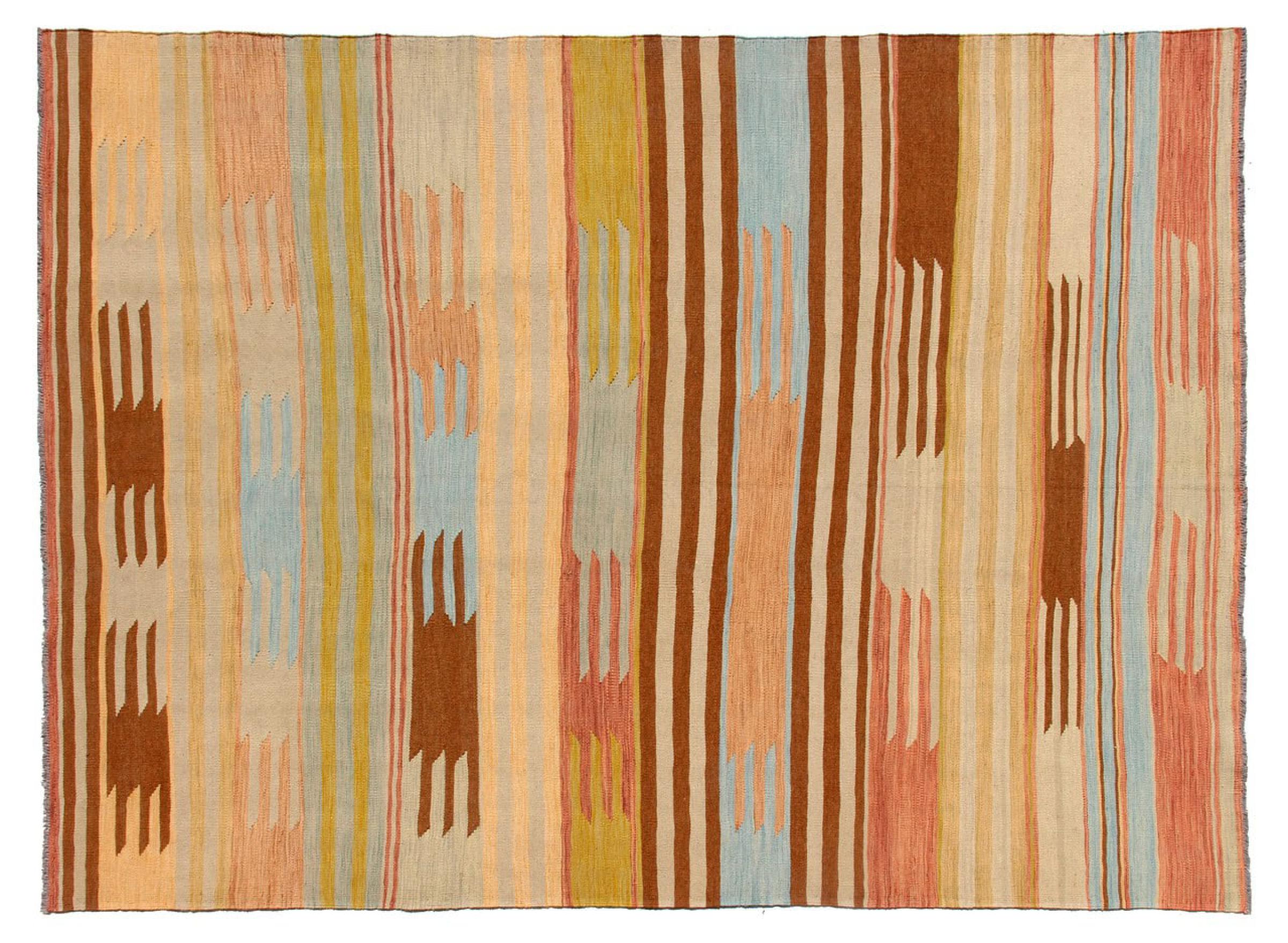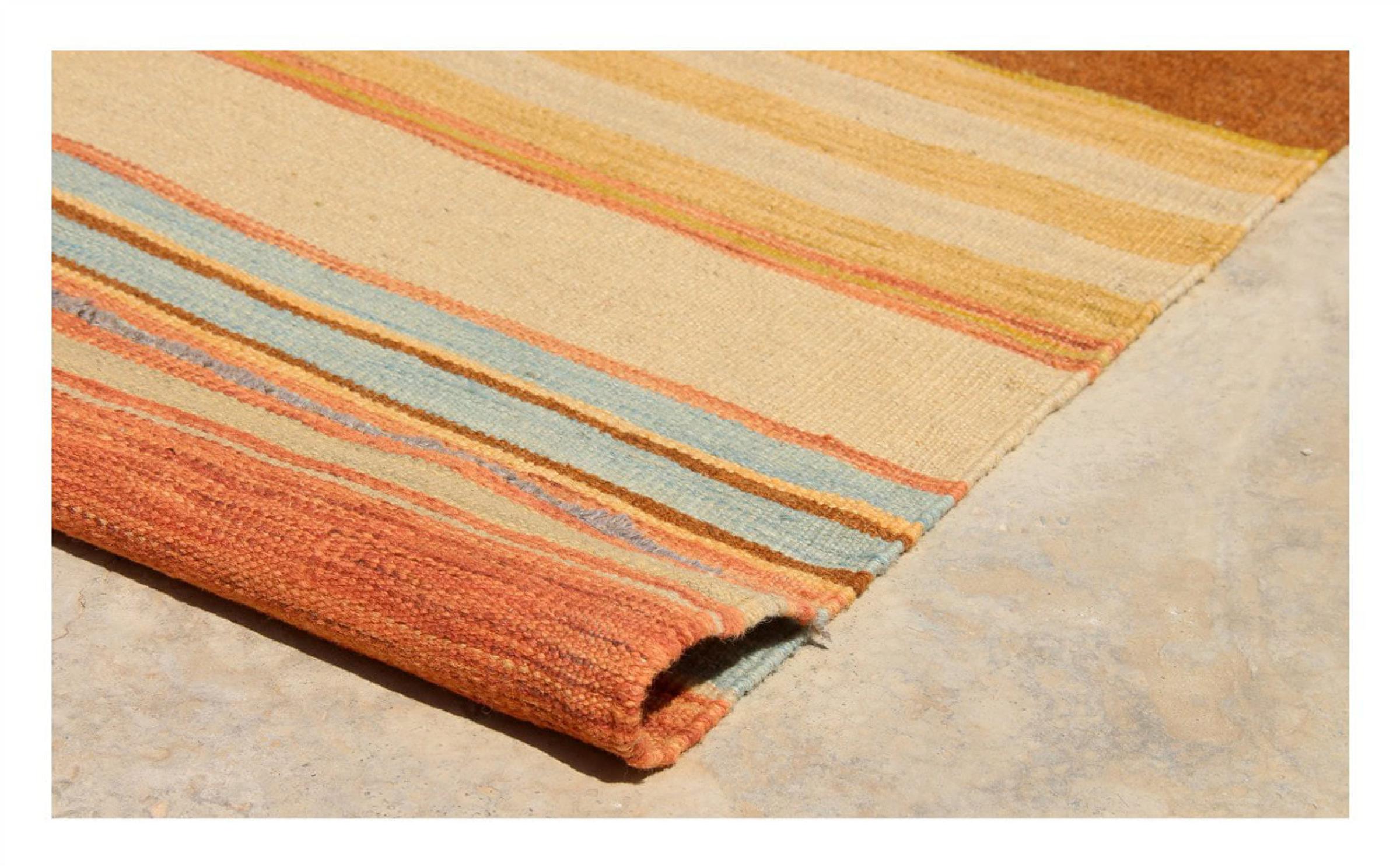 この絨毯は、平織りとして織機で手作業で作られたものです。フラットウィーブとは、パイルのないカーペットを指す言葉です。その名の通り、この絨毯は織られていて、結び目はありません。これにより、表面が構造化されたフラットカーペットが得られる。平織りは、結び目のあるカーペットよりも柔らかくなく、通常は薄くなります。同時に、彼らは製造するためにはるかに複雑ではなく、通常は両側(表と裏)からレイアウトすることができます。彼らのパターンは通常、生地によって決定される幾何学的なものです。