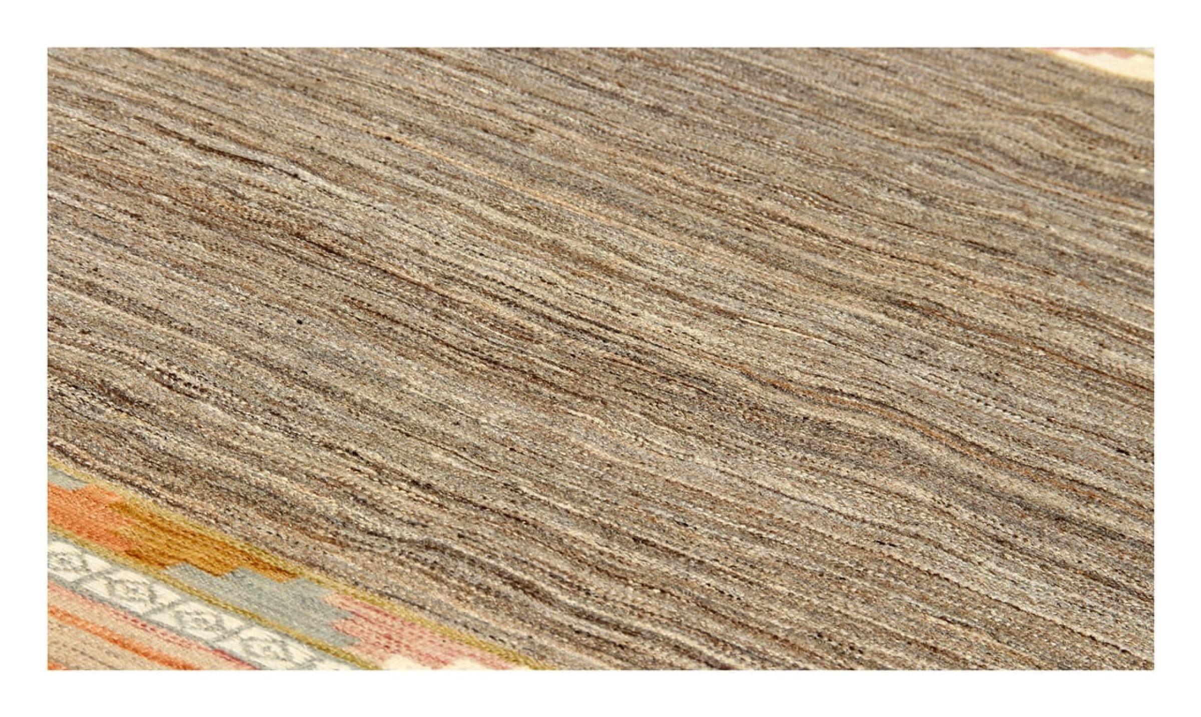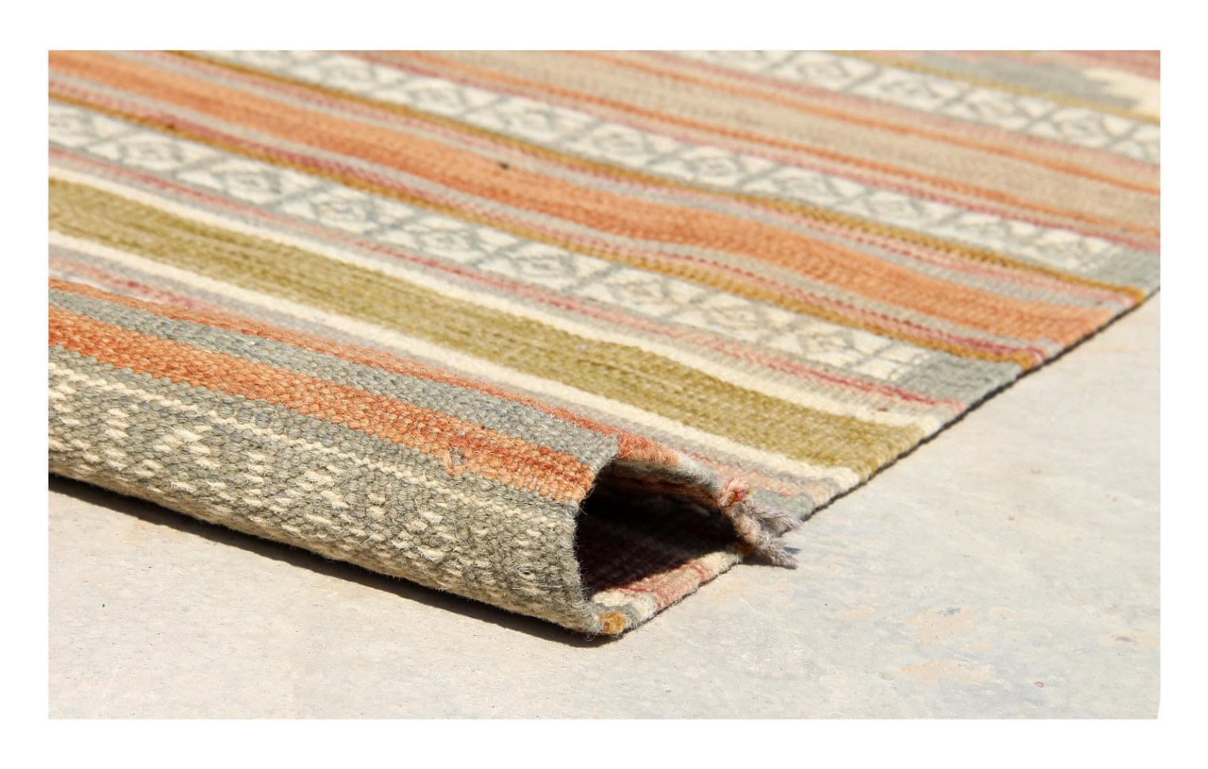 この絨毯は、平織りとして織機で手作業で作られたものです。フラットウィーブとは、パイルのないカーペットを指す言葉です。その名の通り、この絨毯は織られていて、結び目はありません。これにより、表面が構造化されたフラットカーペットが得られる。平織りは、結び目のあるカーペットよりも柔らかくなく、通常は薄くなります。同時に、彼らは製造するためにはるかに複雑ではなく、通常は両側(表と裏)からレイアウトすることができます。彼らのパターンは通常、生地によって決定される幾何学的なものです。