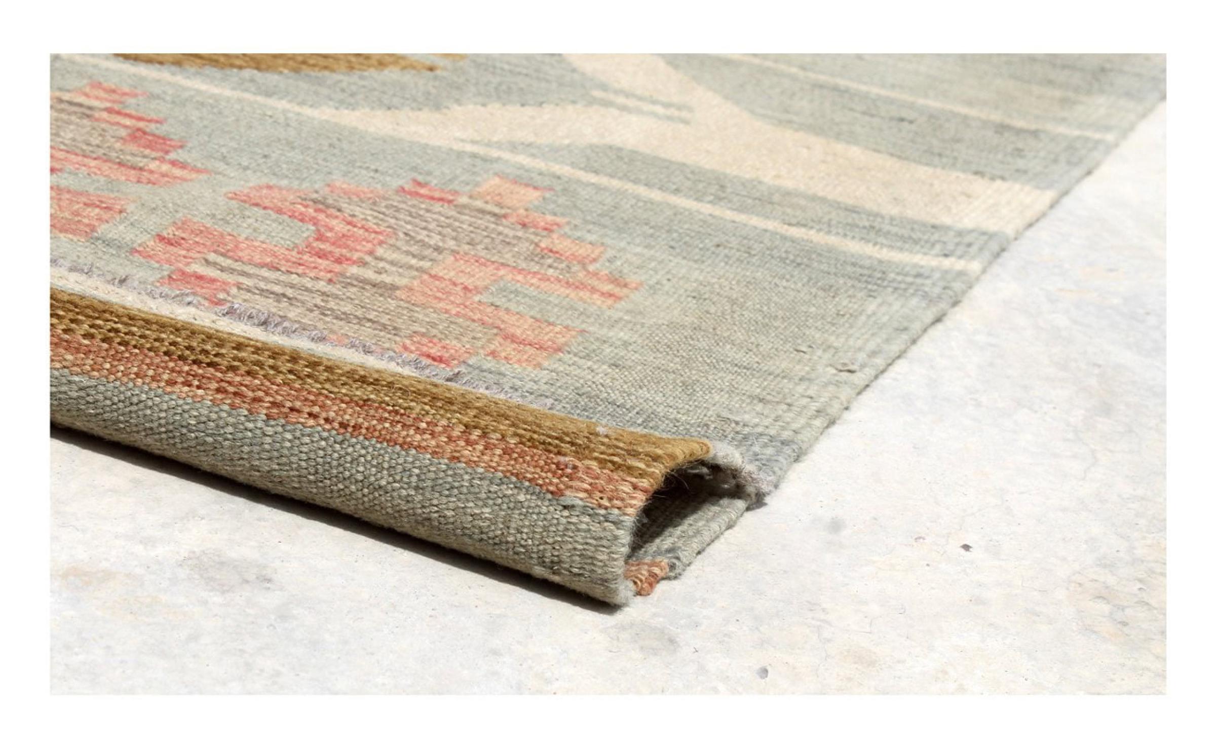 この絨毯は、平織りとして織機で手作業で作られたものです。フラットウィーブとは、パイルのないカーペットを指す言葉です。その名の通り、この絨毯は織られていて、結び目はありません。これにより、表面が構造化されたフラットカーペットが得られる。平織りは、結び目のあるカーペットよりも柔らかくなく、通常は薄くなります。同時に、彼らは製造するためにはるかに複雑ではなく、通常は両側(表と裏)からレイアウトすることができます。彼らのパターンは通常、生地によって決定される幾何学的なものです。