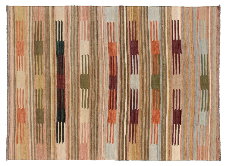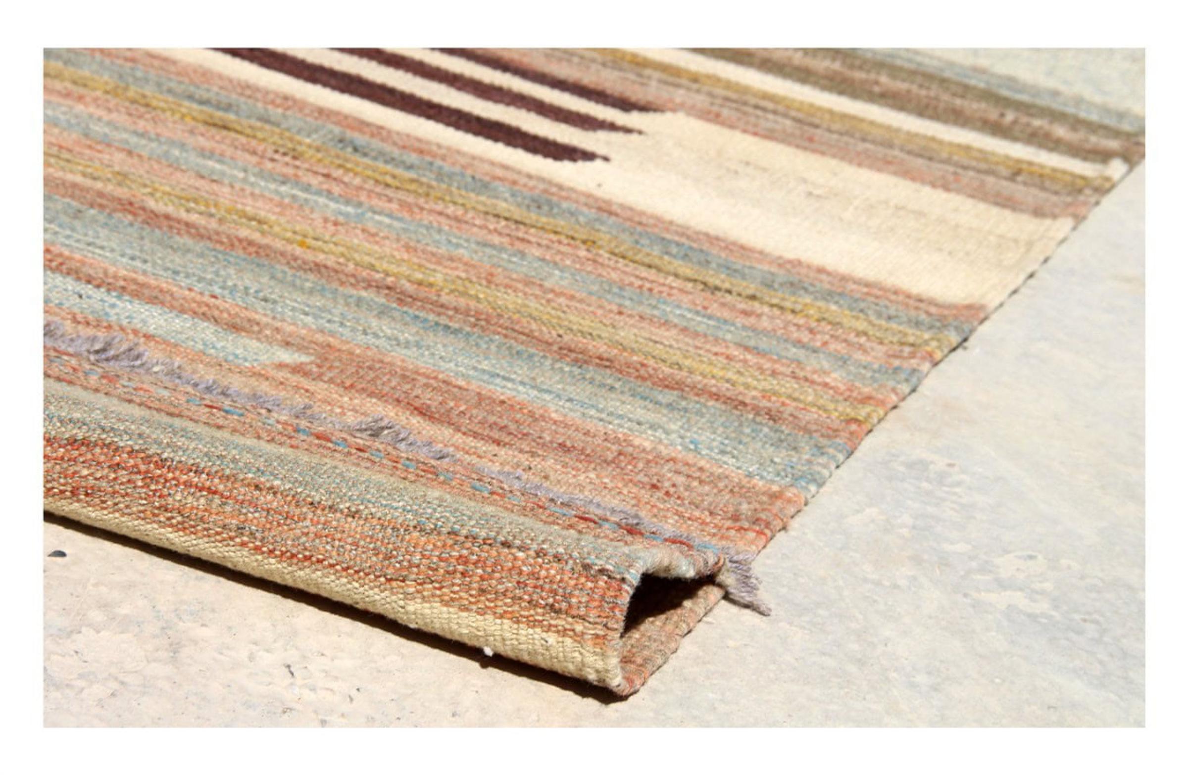 この絨毯は、平織りとして織機で手作業で作られたものです。フラットウィーブとは、パイルのないカーペットを指す言葉です。その名の通り、この絨毯は織られていて、結び目はありません。これにより、表面が構造化されたフラットカーペットが得られる。平織りは、結び目のあるカーペットよりも柔らかくなく、通常は薄くなります。同時に、彼らは製造するためにはるかに複雑ではなく、通常は両側(表と裏)からレイアウトすることができます。彼らのパターンは通常、生地によって決定される幾何学的なものです。