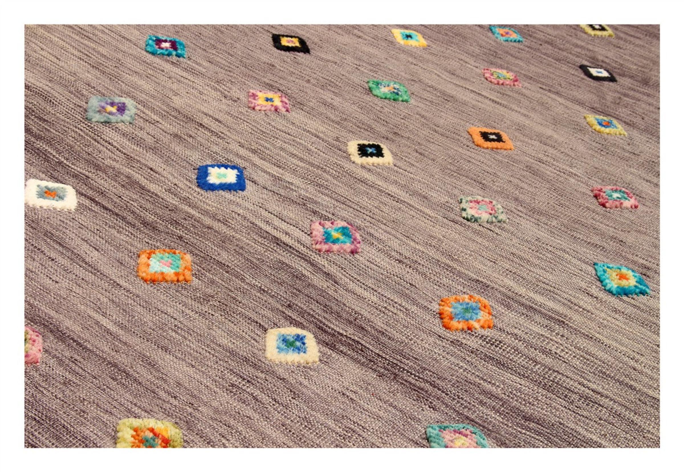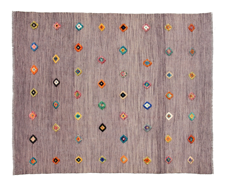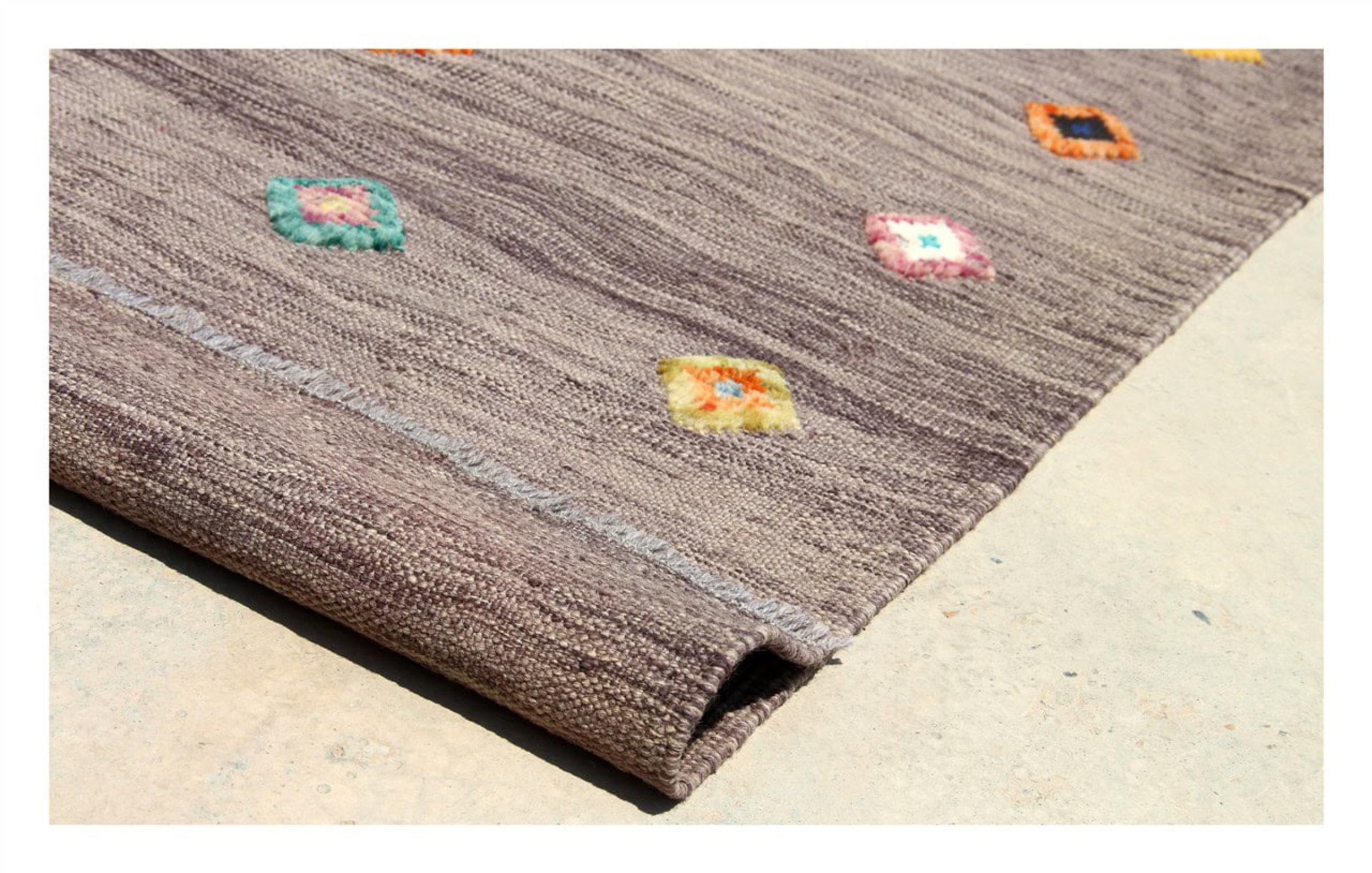 この絨毯は、平織りとして織機で手作業で作られたものです。フラットウィーブとは、パイルのないカーペットを指す言葉です。その名の通り、この絨毯は織られていて、結び目はありません。これにより、表面が構造化されたフラットカーペットが得られる。平織りは、結び目のあるカーペットよりも柔らかくなく、通常は薄くなります。同時に、彼らは製造するためにはるかに複雑ではなく、通常は両側(表と裏)からレイアウトすることができます。彼らのパターンは通常、生地によって決定される幾何学的なものです。