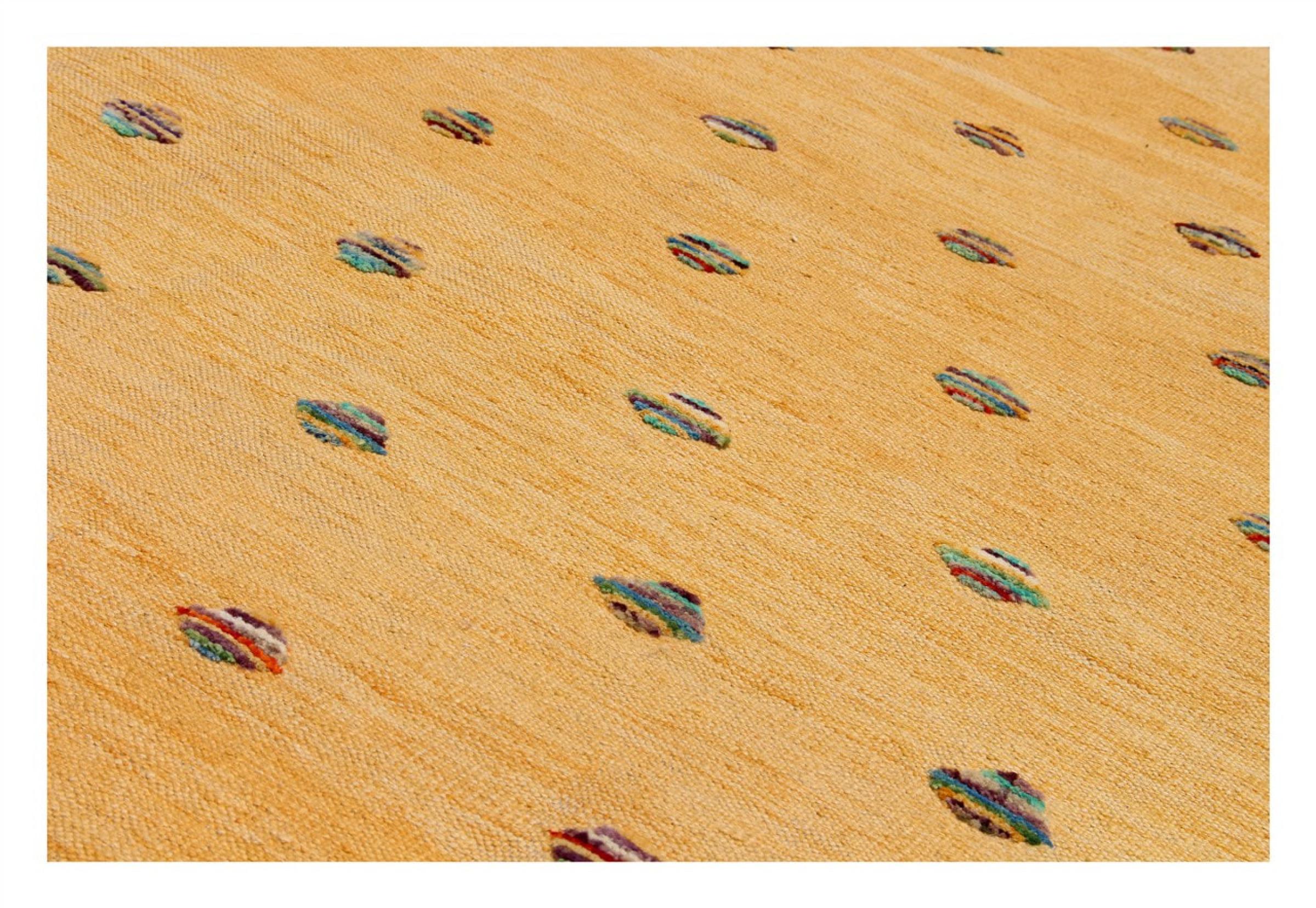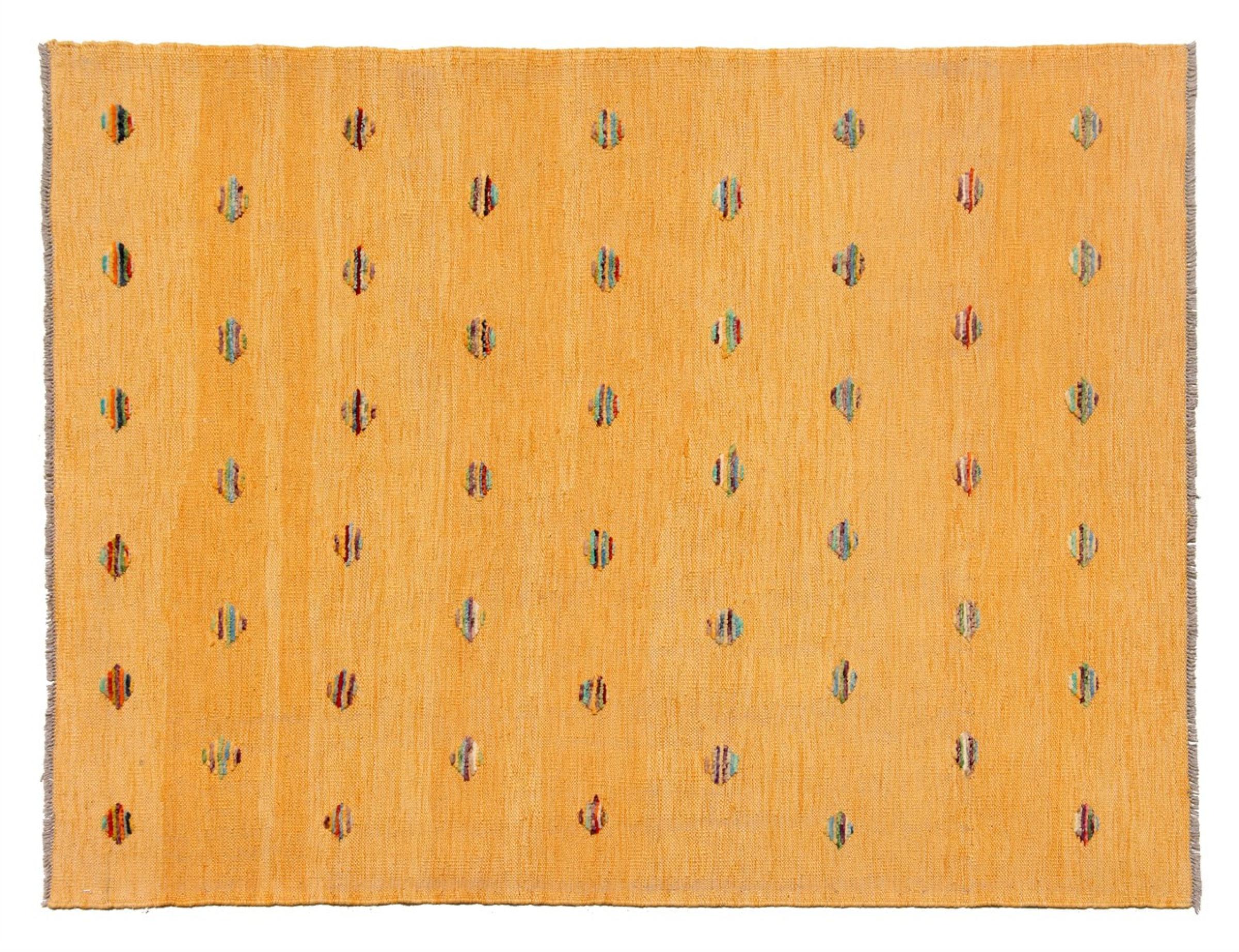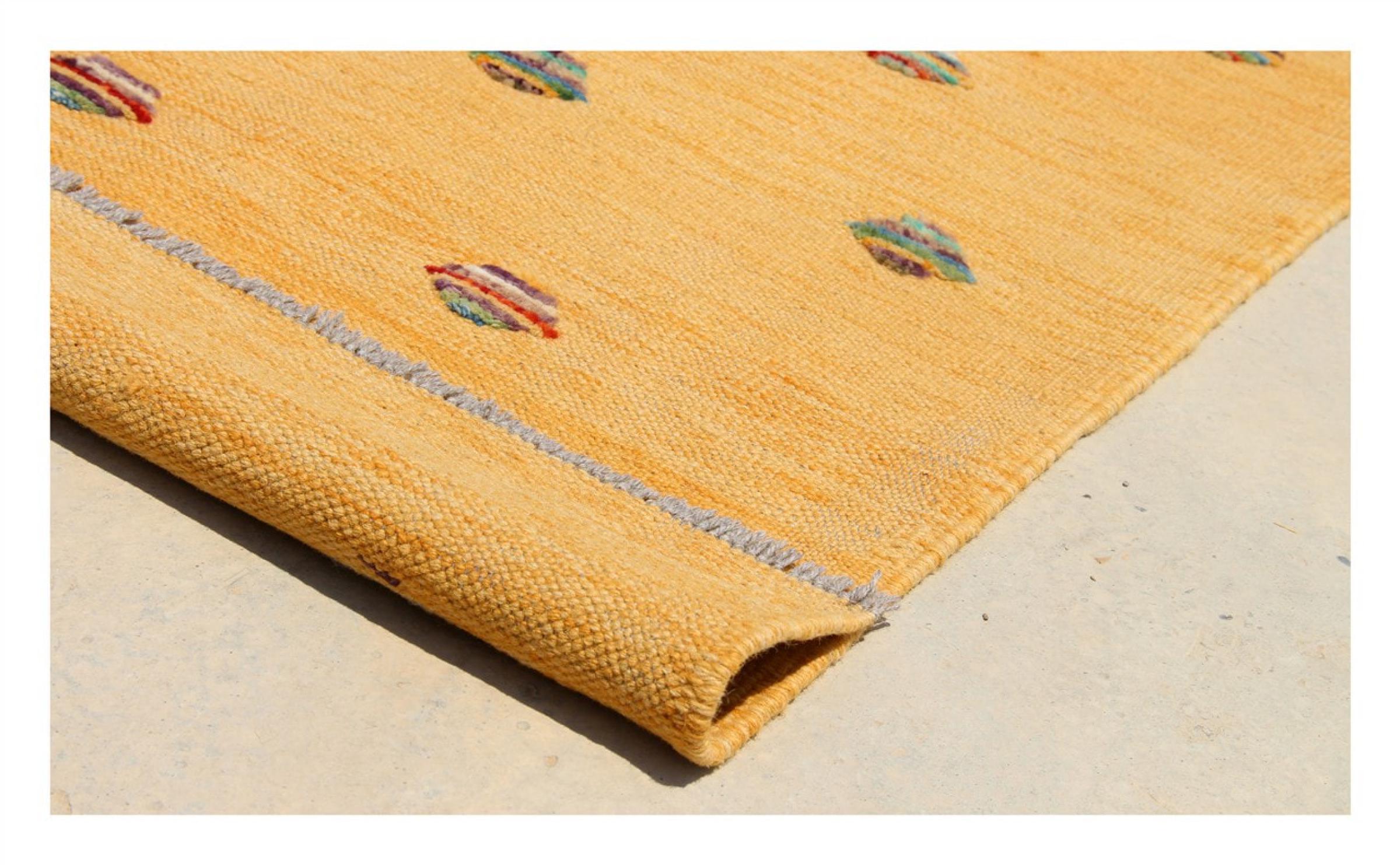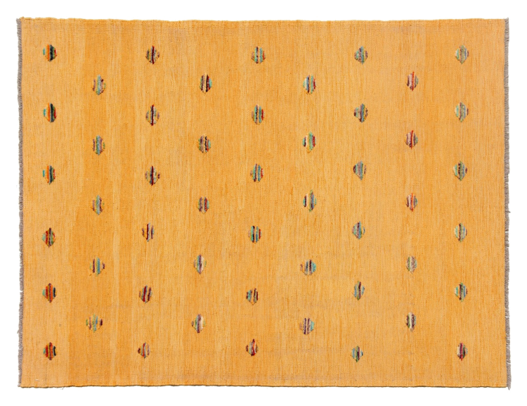 この絨毯は、平織りとして織機で手作業で作られたものです。フラットウィーブとは、パイルのないカーペットを指す言葉です。その名の通り、この絨毯は織られていて、結び目はありません。これにより、表面が構造化されたフラットカーペットが得られる。平織りは、結び目のあるカーペットよりも柔らかくなく、通常は薄くなります。同時に、彼らは製造するためにはるかに複雑ではなく、通常は両側(表と裏)からレイアウトすることができます。彼らのパターンは通常、生地によって決定される幾何学的なものです。