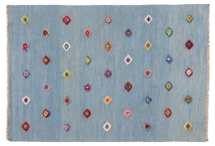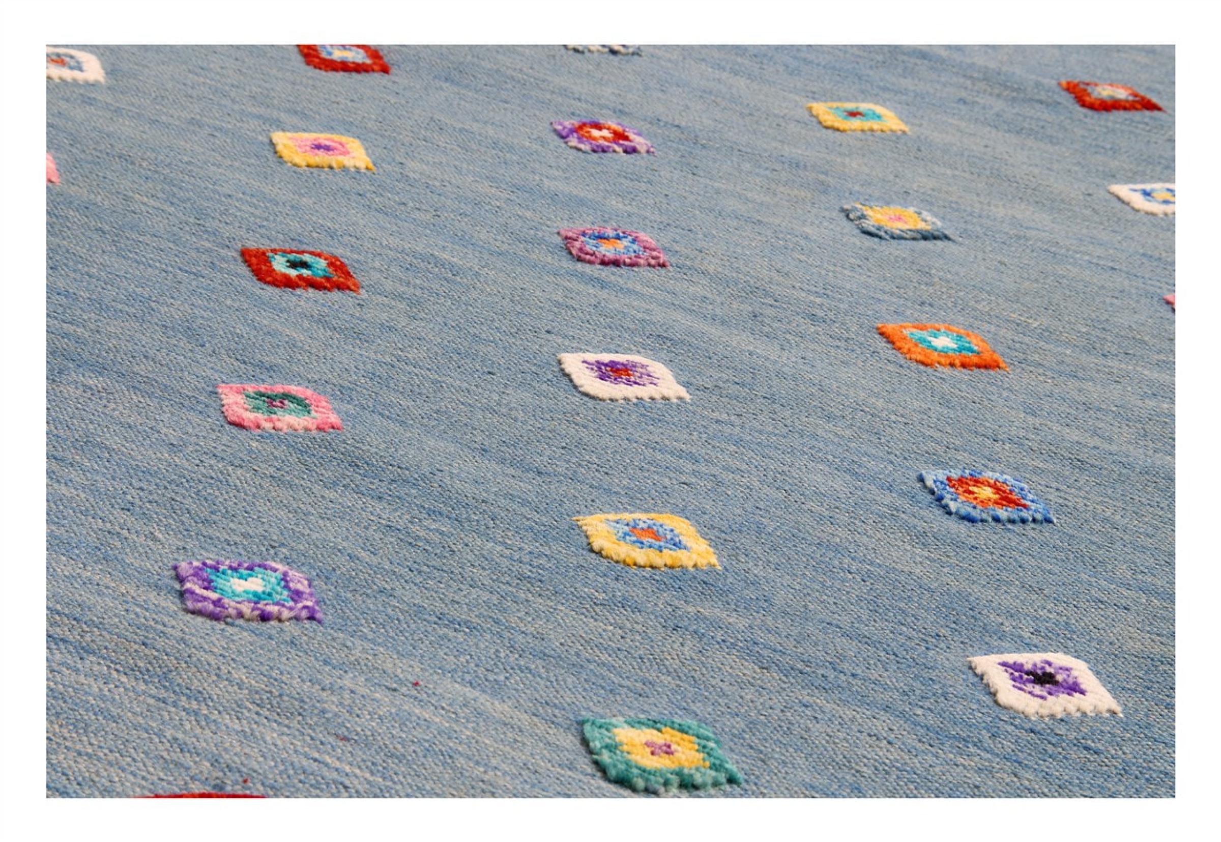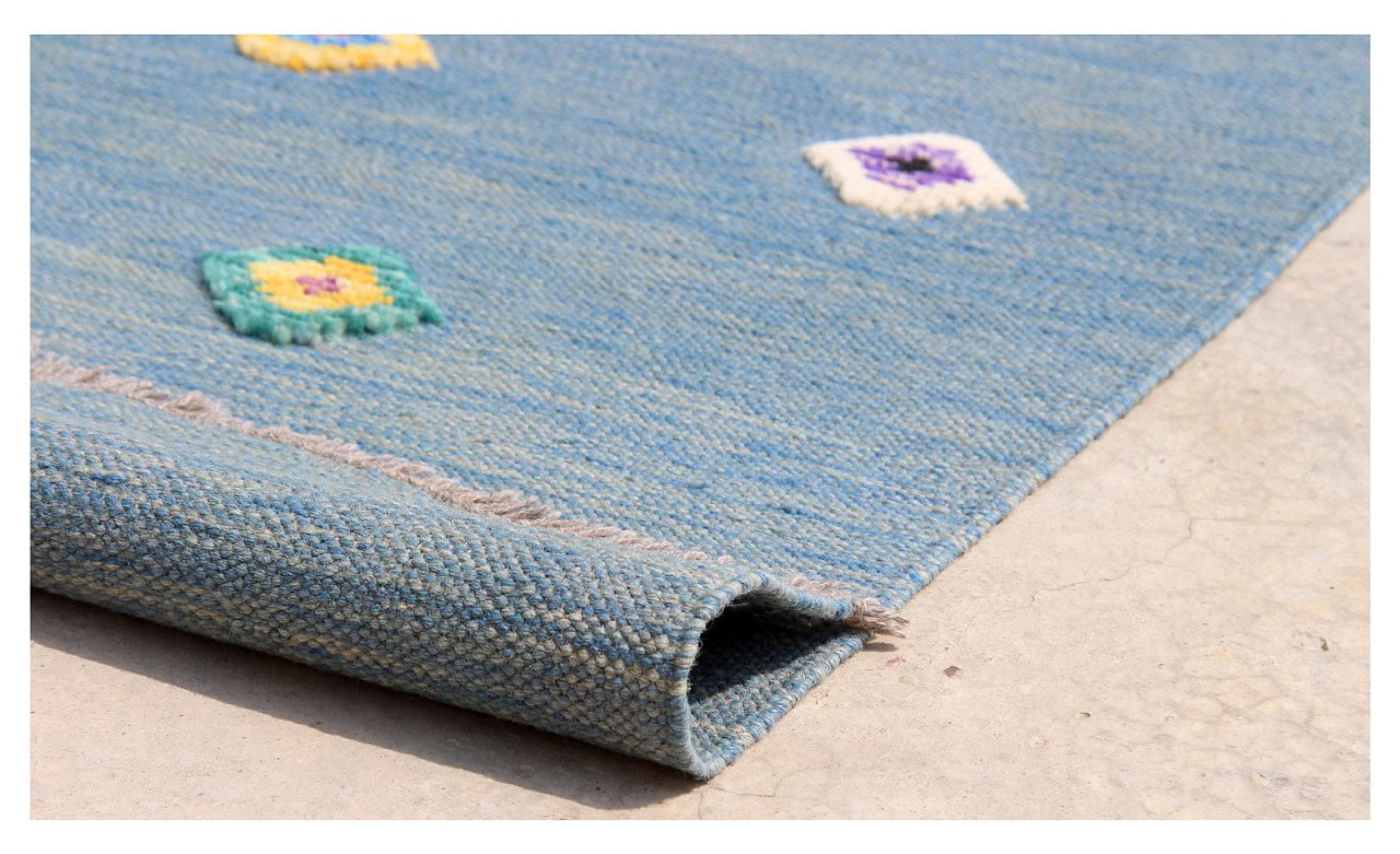 この絨毯は、平織りとして織機で手作業で作られたものです。フラットウィーブとは、パイルのないカーペットを指す言葉です。その名の通り、この絨毯は織られていて、結び目はありません。これにより、表面が構造化されたフラットカーペットが得られる。平織りは、結び目のあるカーペットよりも柔らかくなく、通常は薄くなります。同時に、彼らは製造するためにはるかに複雑ではなく、通常は両側(表と裏)からレイアウトすることができます。彼らのパターンは通常、生地によって決定される幾何学的なものです。