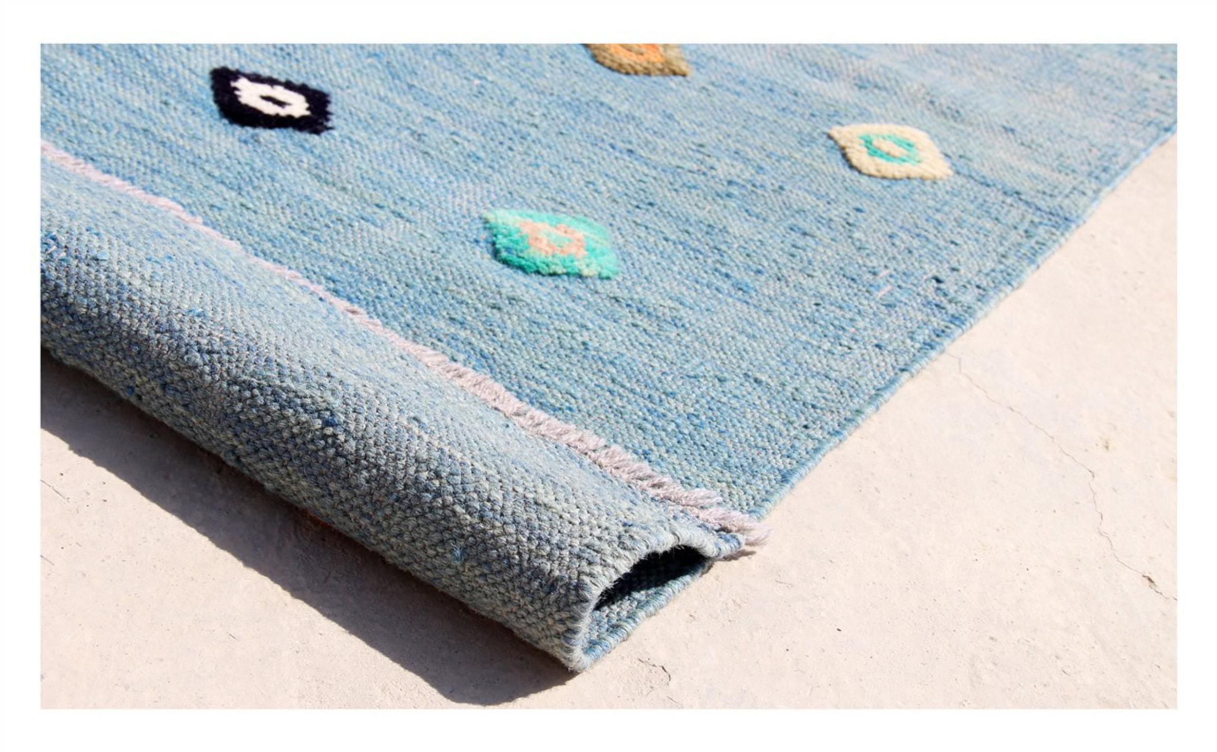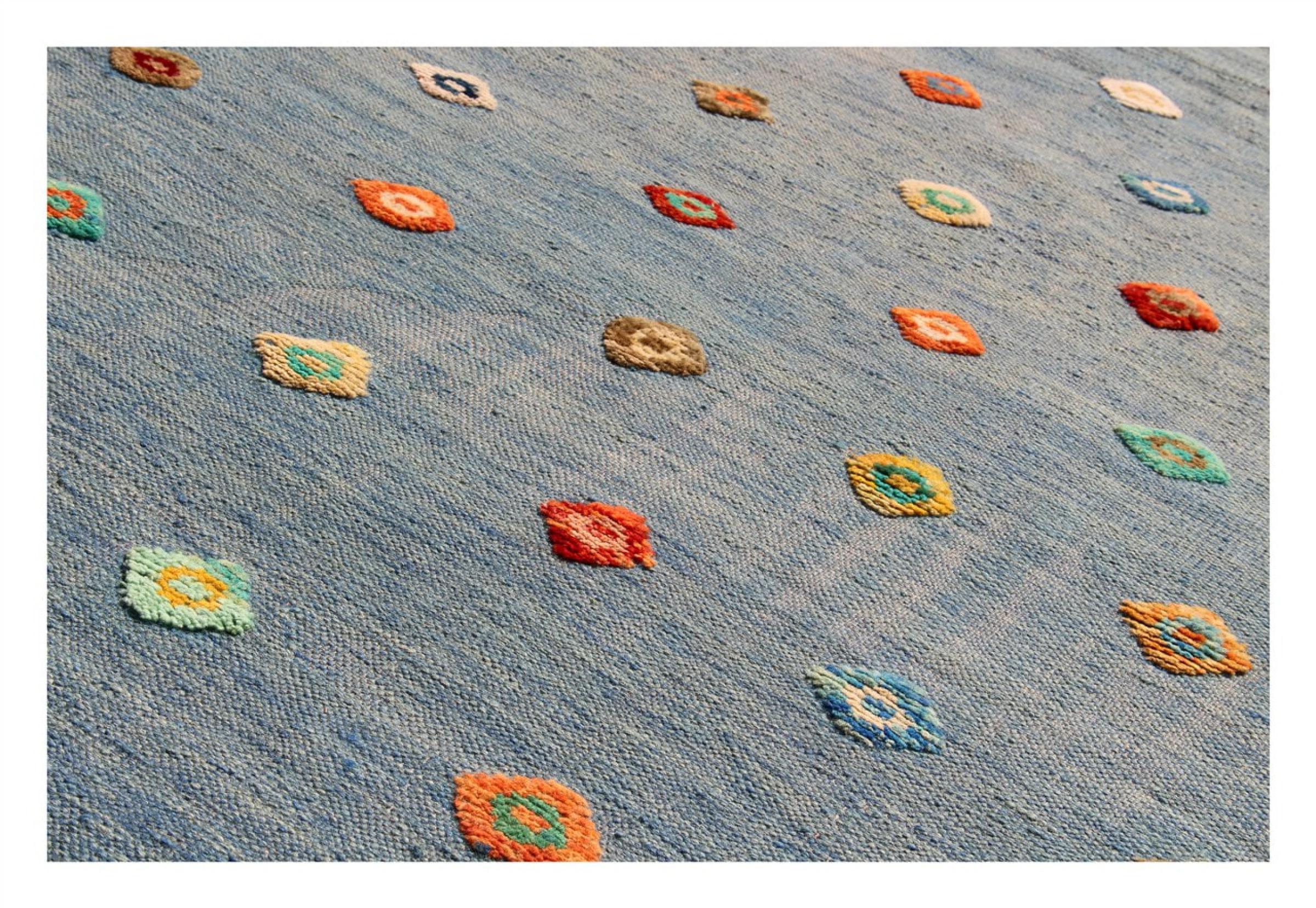 この絨毯は、平織りとして織機で手作業で作られたものです。フラットウィーブとは、パイルのないカーペットを指す言葉です。その名の通り、この絨毯は織られていて、結び目はありません。これにより、表面が構造化されたフラットカーペットが得られる。平織りは、結び目のあるカーペットよりも柔らかくなく、通常は薄くなります。同時に、彼らは製造するためにはるかに複雑ではなく、通常は両側(表と裏)からレイアウトすることができます。彼らのパターンは通常、生地によって決定される幾何学的なものです。