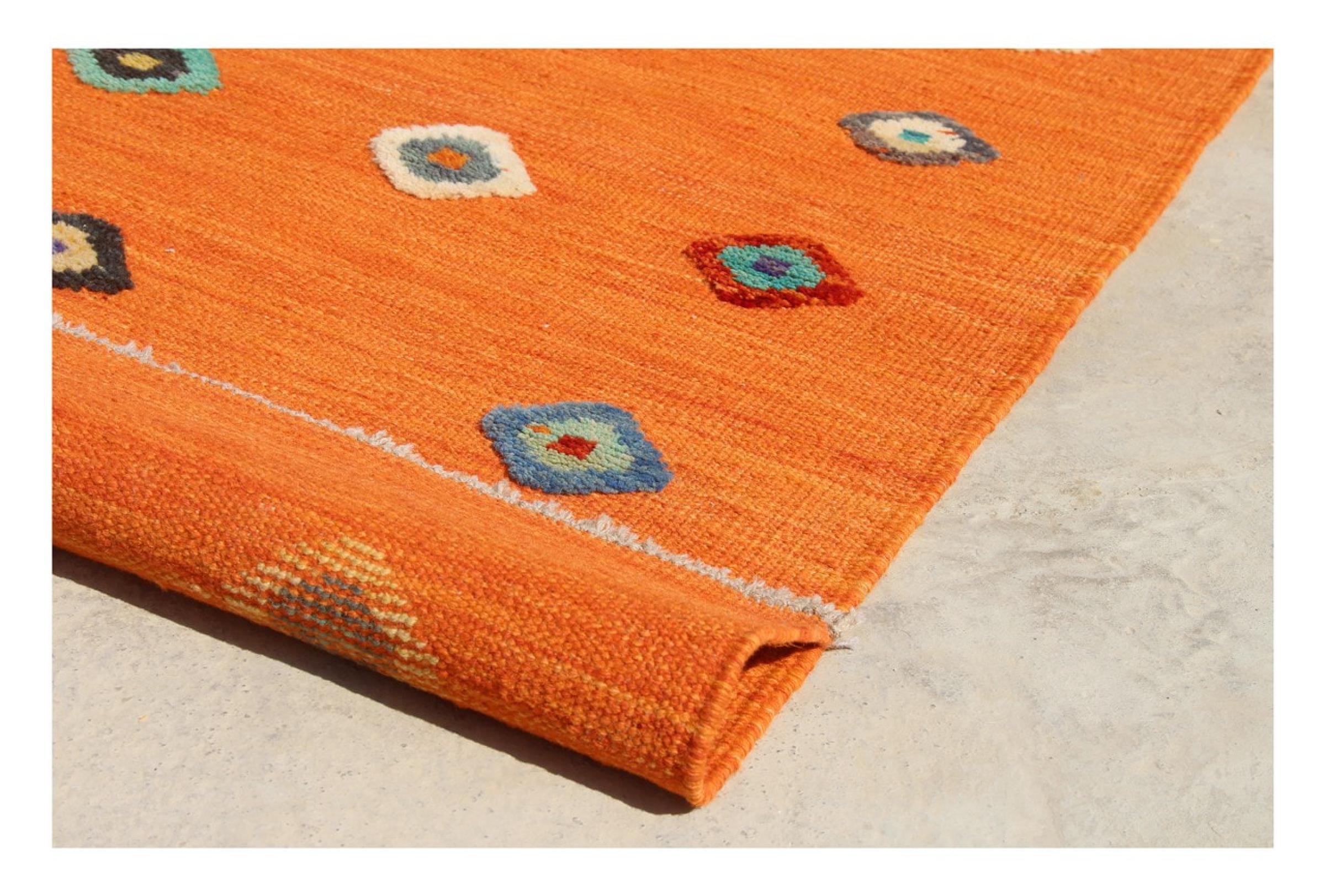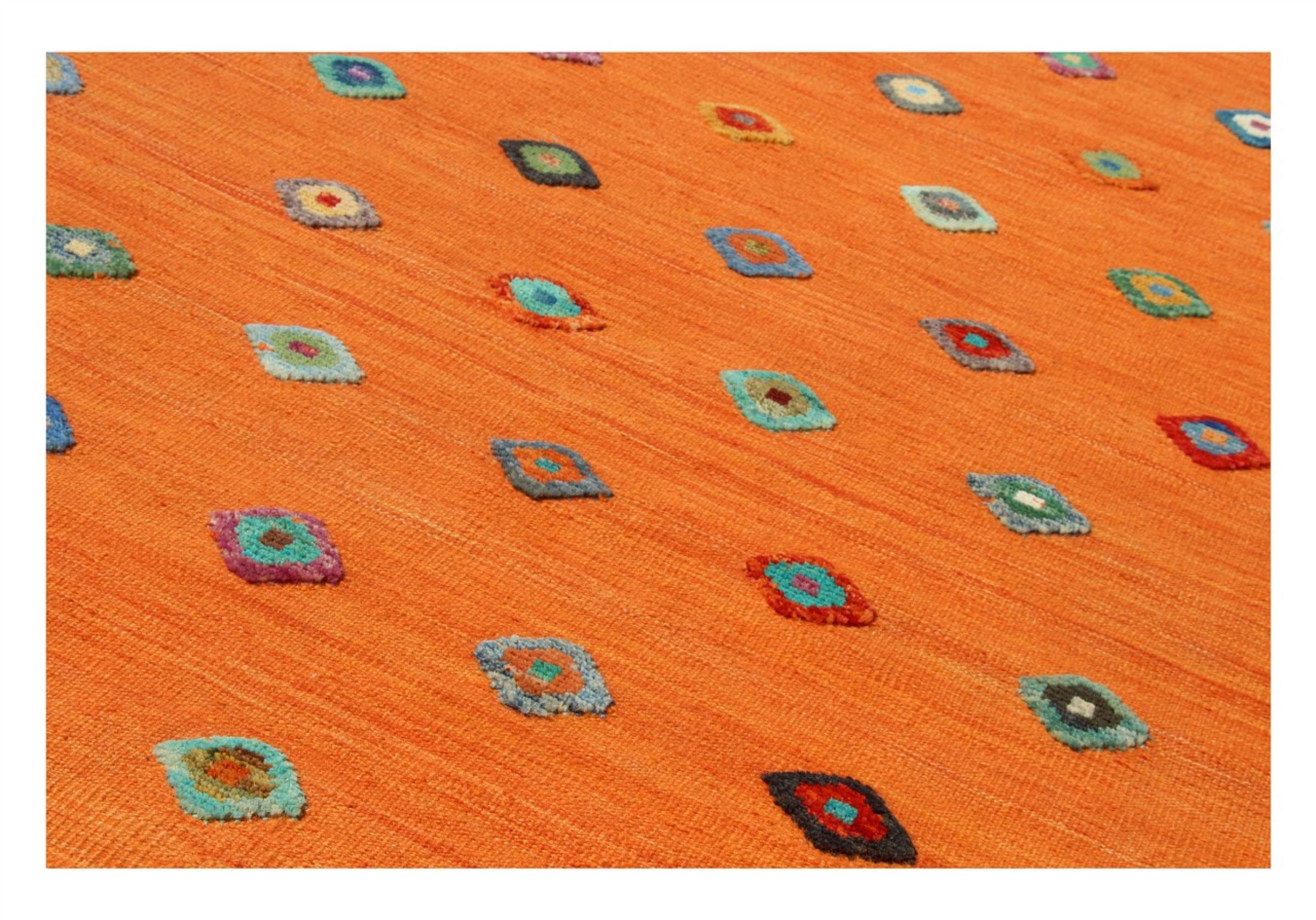 この絨毯は、平織りとして織機で手作業で作られたものです。フラットウィーブとは、パイルのないカーペットを指す言葉です。その名の通り、この絨毯は織られていて、結び目はありません。これにより、表面が構造化されたフラットカーペットが得られる。平織りは、結び目のあるカーペットよりも柔らかくなく、通常は薄くなります。同時に、彼らは製造するためにはるかに複雑ではなく、通常は両側(表と裏)からレイアウトすることができます。彼らのパターンは通常、生地によって決定される幾何学的なものです。