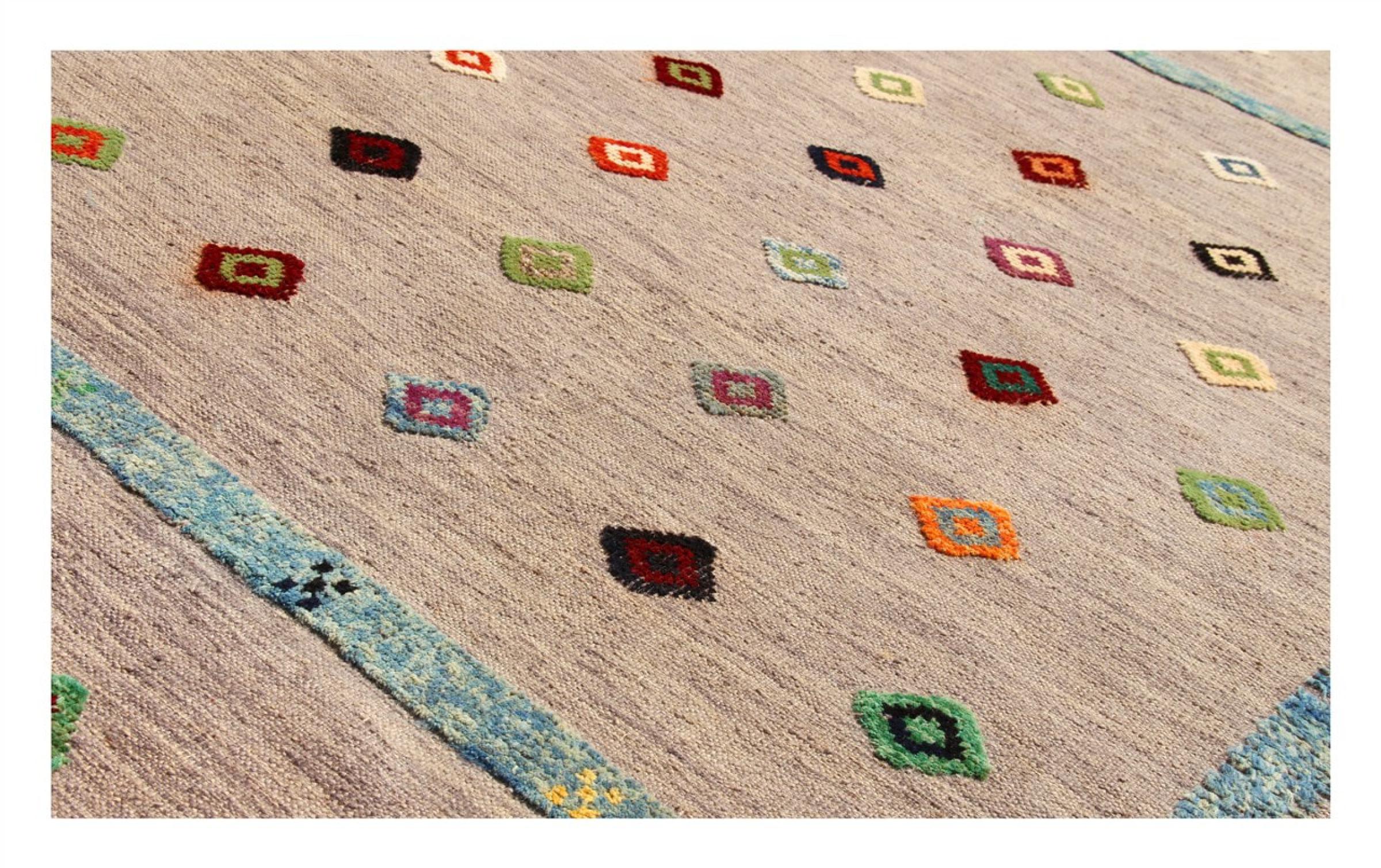 この絨毯は、平織りとして織機で手作業で作られたものです。フラットウィーブとは、パイルのないカーペットを指す言葉です。その名の通り、この絨毯は織られていて、結び目はありません。これにより、表面が構造化されたフラットカーペットが得られる。平織りは、結び目のあるカーペットよりも柔らかくなく、通常は薄くなります。同時に、彼らは製造するためにはるかに複雑ではなく、通常は両側(表と裏)からレイアウトすることができます。彼らのパターンは通常、生地によって決定される幾何学的なものです。