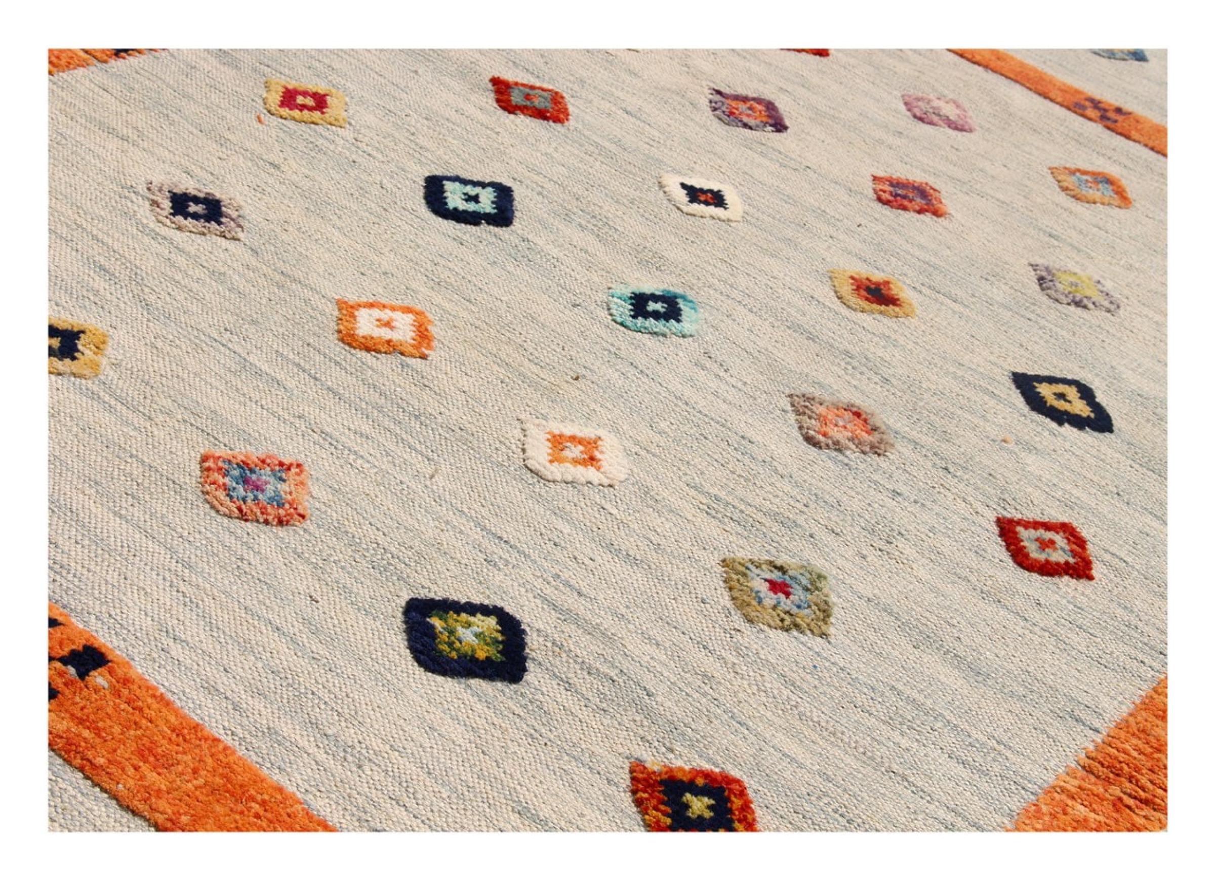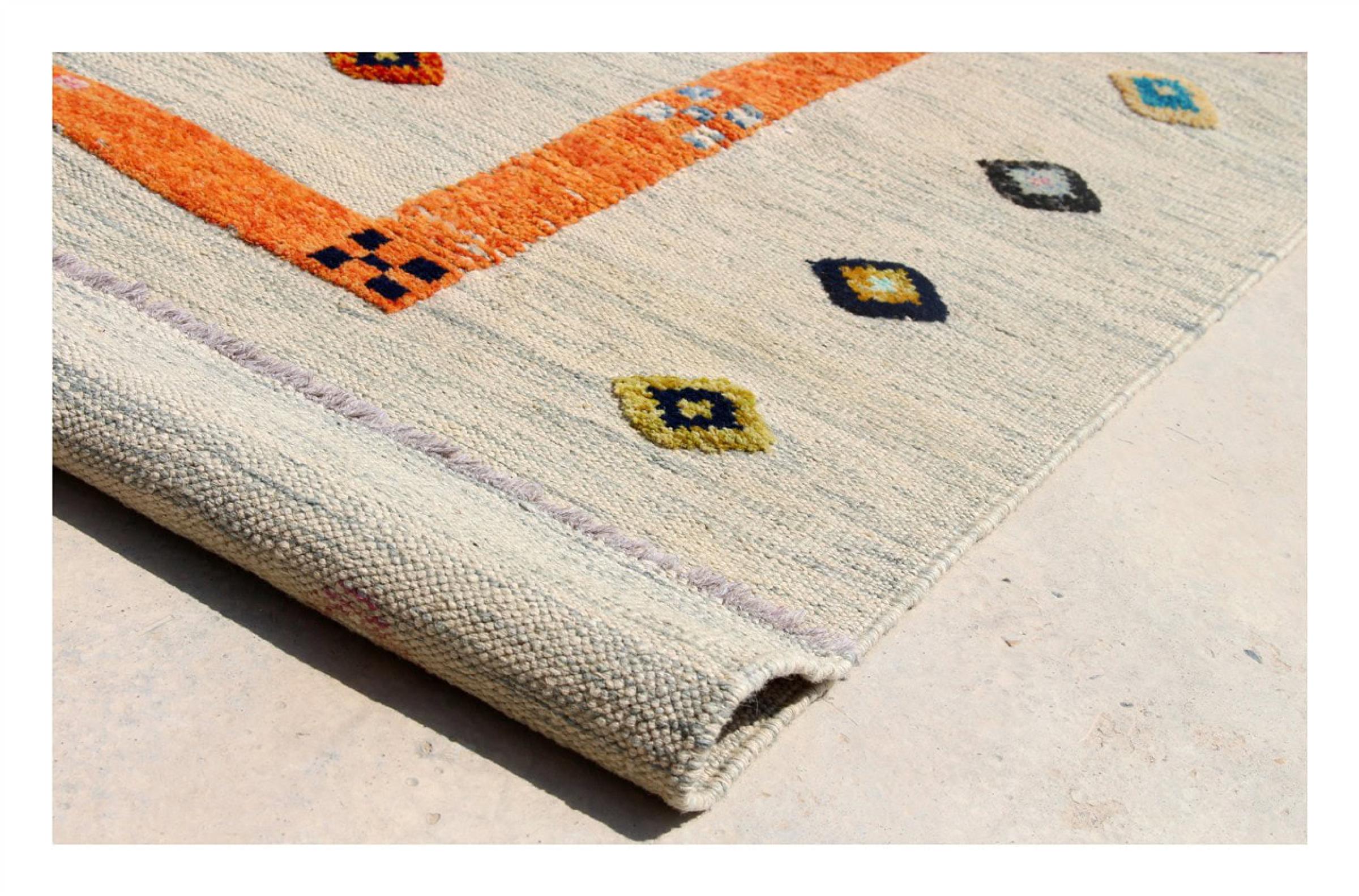 この絨毯は、平織りとして織機で手作業で作られたものです。フラットウィーブとは、パイルのないカーペットを指す言葉です。その名の通り、この絨毯は織られていて、結び目はありません。これにより、表面が構造化されたフラットカーペットが得られる。平織りは、結び目のあるカーペットよりも柔らかくなく、通常は薄くなります。同時に、彼らは製造するためにはるかに複雑ではなく、通常は両側(表と裏)からレイアウトすることができます。彼らのパターンは通常、生地によって決定される幾何学的なものです。