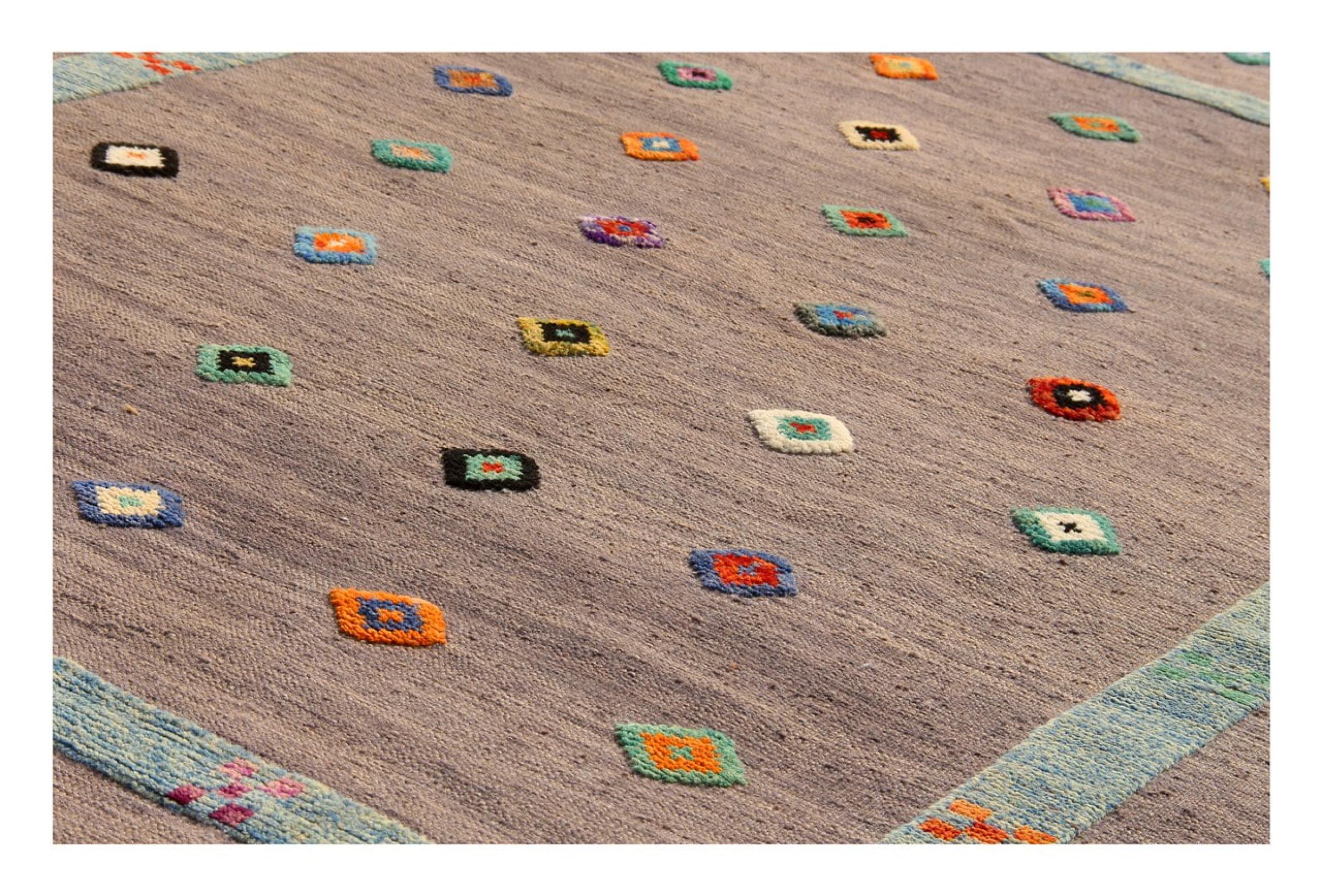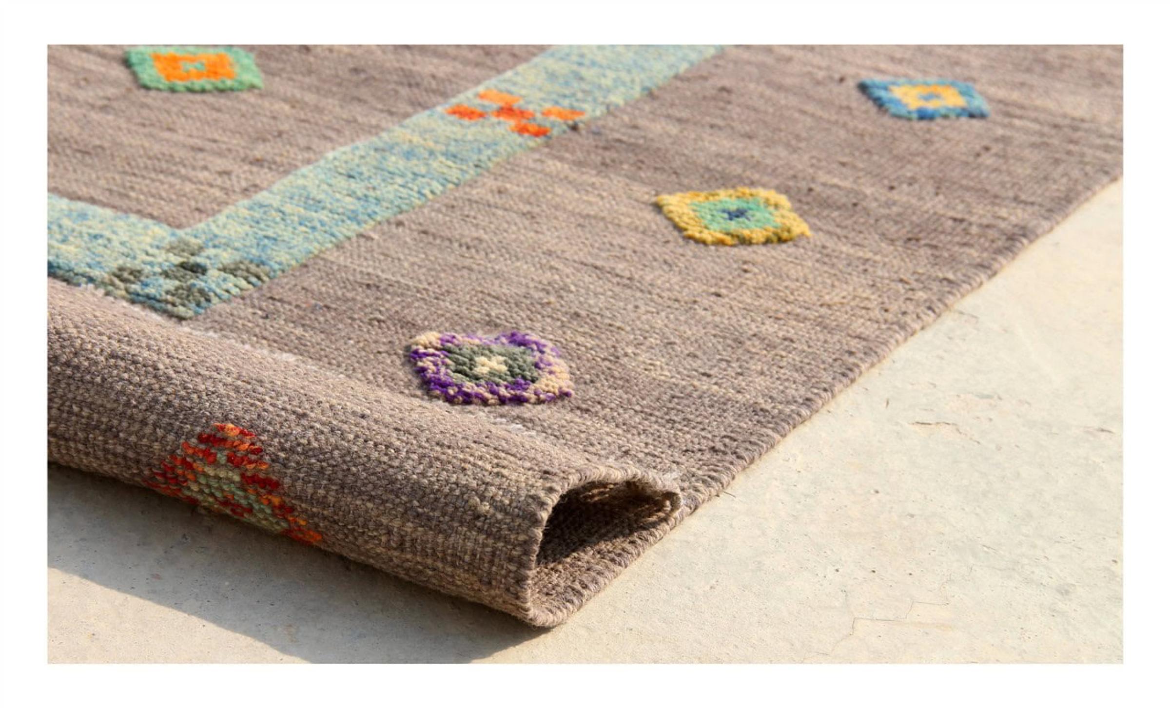 この絨毯は、平織りとして織機で手作業で作られたものです。フラットウィーブとは、パイルのないカーペットを指す言葉です。その名の通り、この絨毯は織られていて、結び目はありません。これにより、表面が構造化されたフラットカーペットが得られる。平織りは、結び目のあるカーペットよりも柔らかくなく、通常は薄くなります。同時に、彼らは製造するためにはるかに複雑ではなく、通常は両側(表と裏)からレイアウトすることができます。彼らのパターンは通常、生地によって決定される幾何学的なものです。
