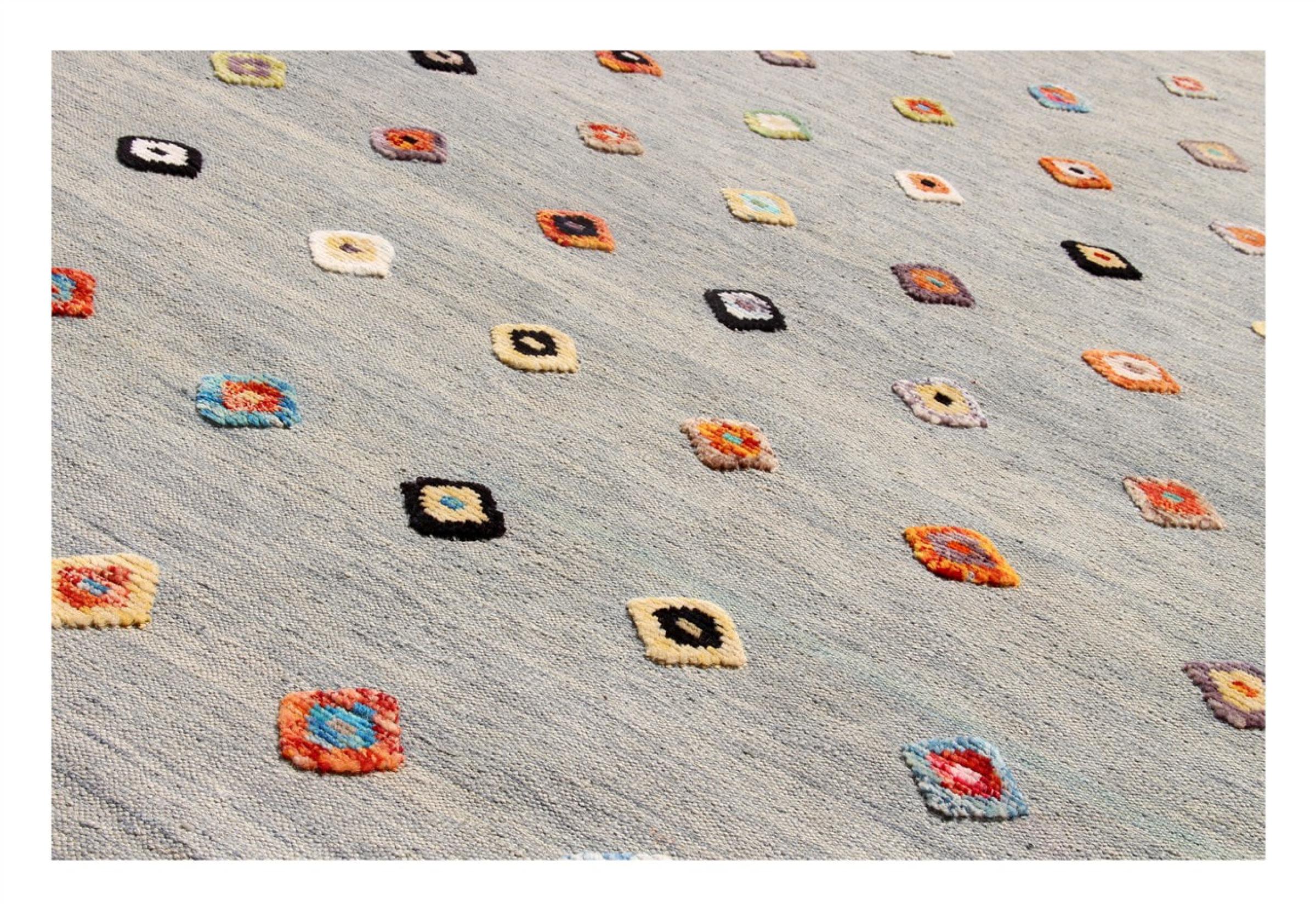 この絨毯は、平織りとして織機で手作業で作られたものです。フラットウィーブとは、パイルのないカーペットを指す言葉です。その名の通り、この絨毯は織られていて、結び目はありません。これにより、表面が構造化されたフラットカーペットが得られる。平織りは、結び目のあるカーペットよりも柔らかくなく、通常は薄くなります。同時に、彼らは製造するためにはるかに複雑ではなく、通常は両側(表と裏)からレイアウトすることができます。彼らのパターンは通常、生地によって決定される幾何学的なものです。