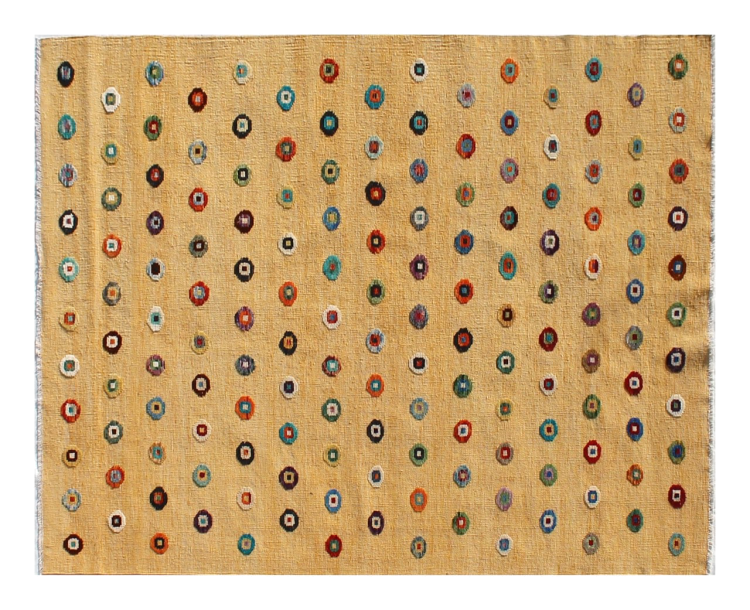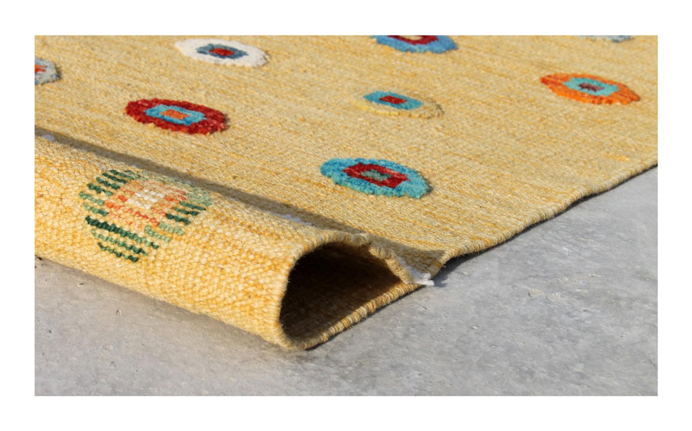 この絨毯は、平織りとして織機で手作業で作られたものです。フラットウィーブとは、パイルのないカーペットを指す言葉です。その名の通り、この絨毯は織られていて、結び目はありません。これにより、表面が構造化されたフラットカーペットが得られる。平織りは、結び目のあるカーペットよりも柔らかくなく、通常は薄くなります。同時に、彼らは製造するためにはるかに複雑ではなく、通常は両側(表と裏)からレイアウトすることができます。彼らのパターンは通常、生地によって決定される幾何学的なものです。