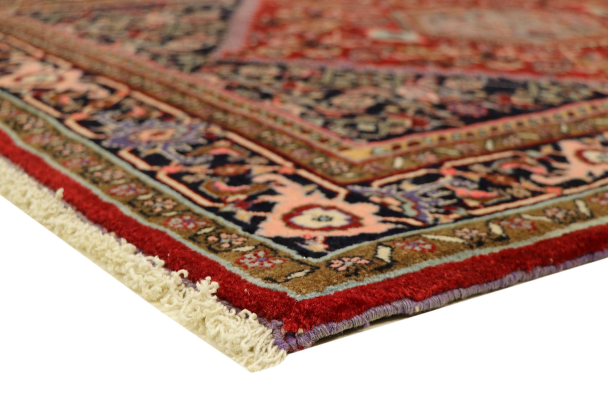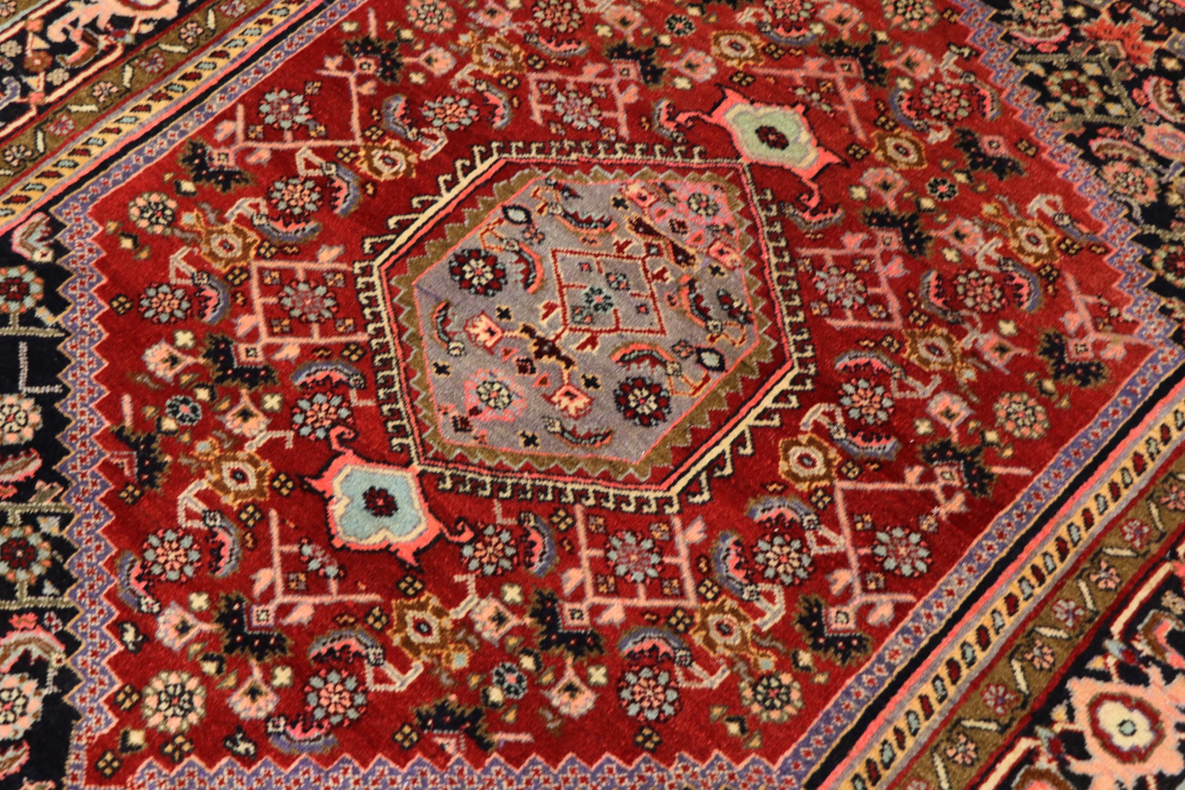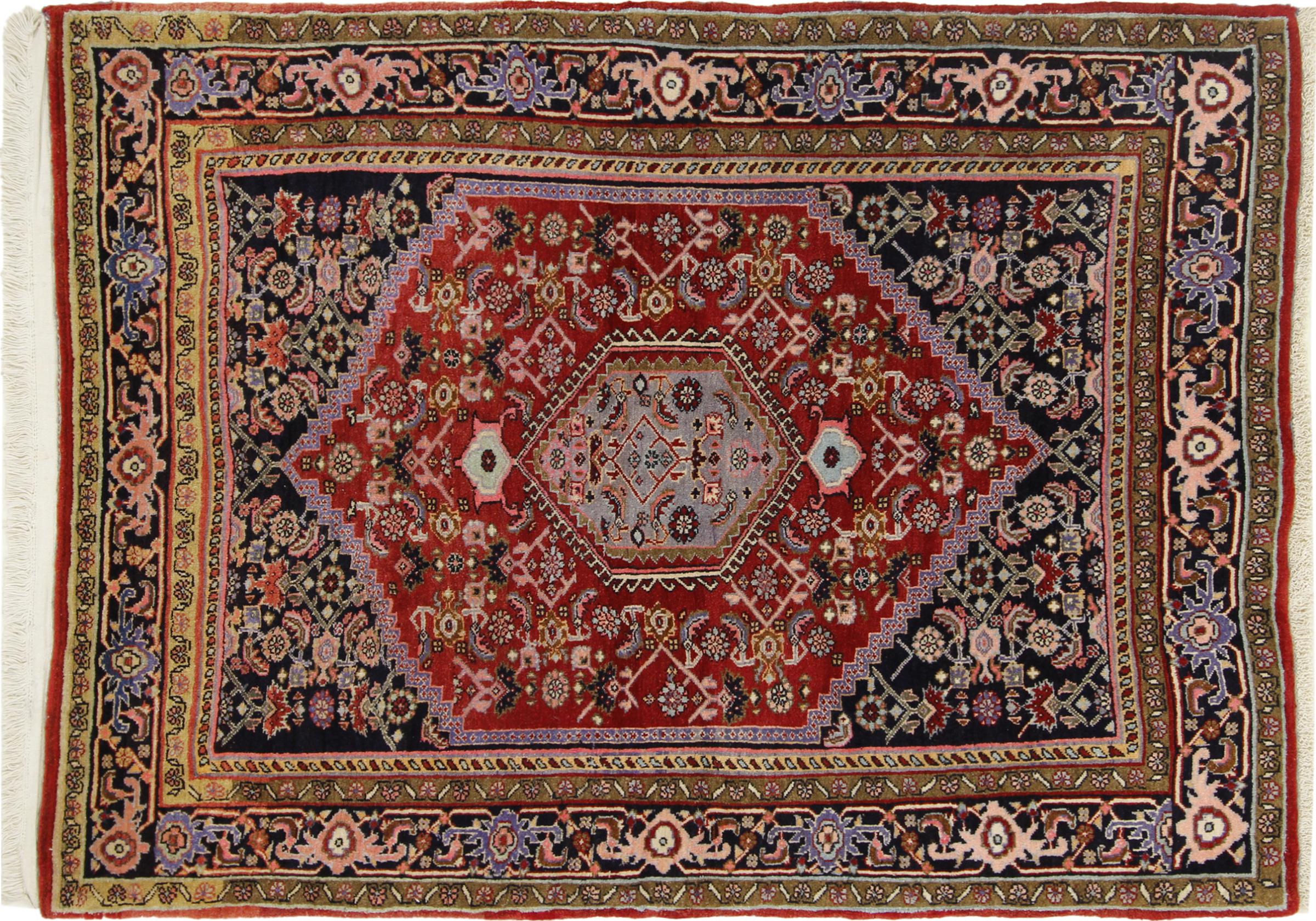 このペルシャ絨毯は、イラン西部のクルド人の小さな町で手織りされたものです。ビジャールカーペットは優れた品質を表しています。しっかりとしたパイルはそのコンパクトさ、したがって耐摩耗性に優れています。ウールは櫛でしっかりと圧縮されているため、パイルはほぼ垂直に上向きに立っています。これは、大きな汚れ粒子が浸透する可能性がほとんどないことを意味します。