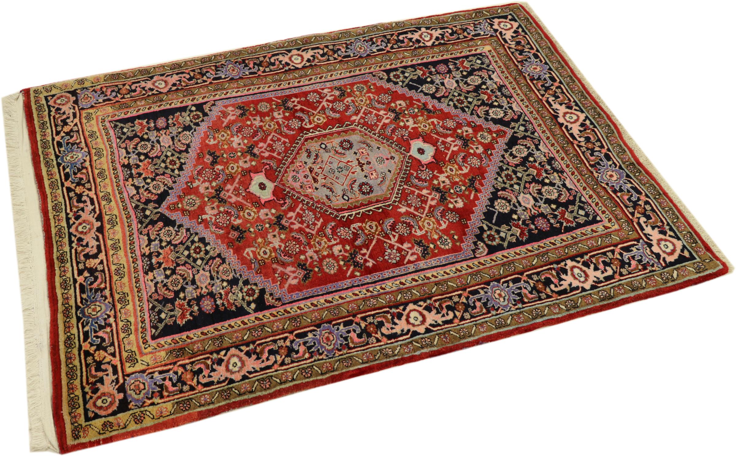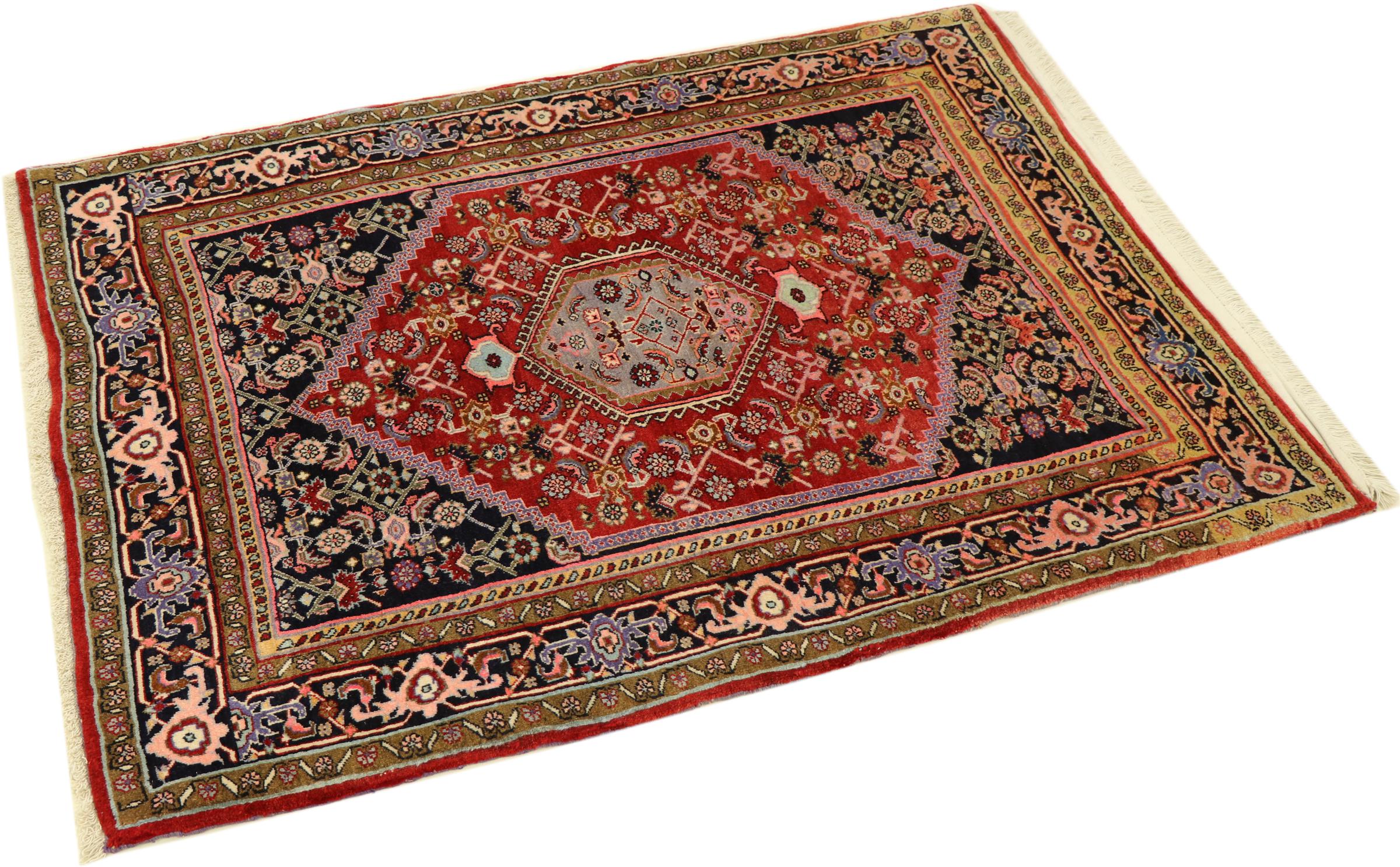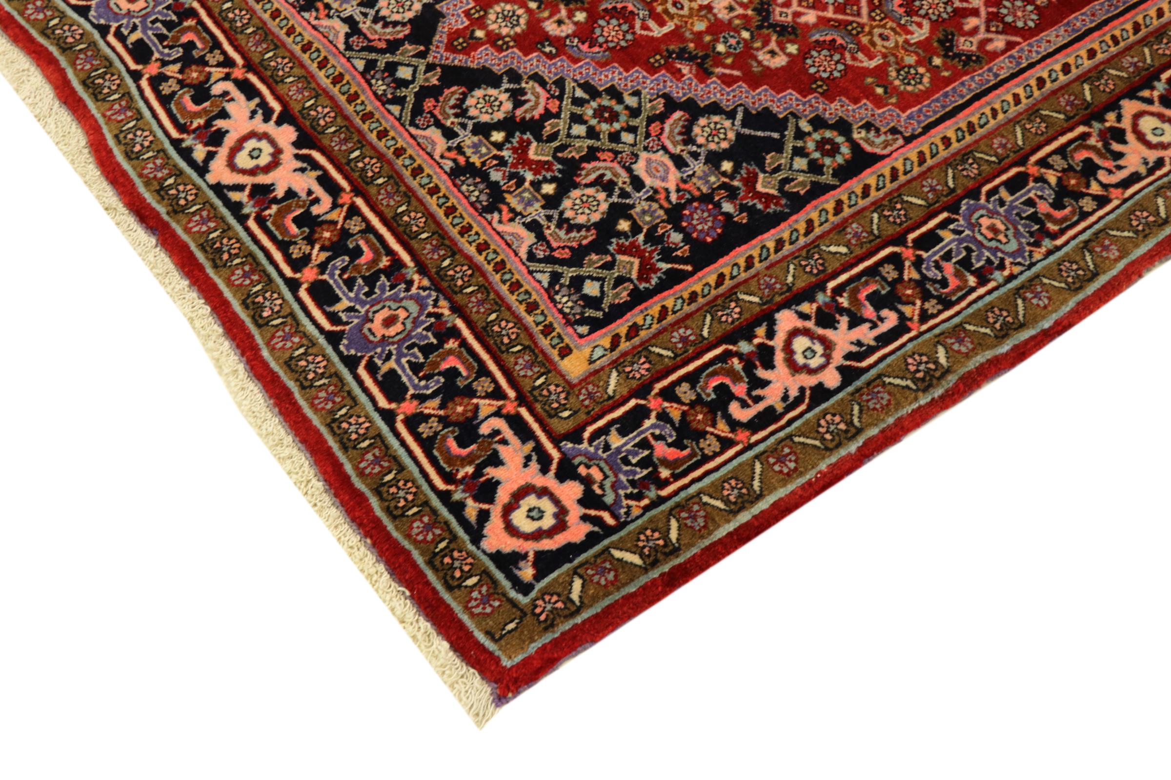 このペルシャ絨毯は、イラン西部のクルド人の小さな町で手織りされたものです。ビジャールカーペットは優れた品質を表しています。しっかりとしたパイルはそのコンパクトさ、したがって耐摩耗性に優れています。ウールは櫛でしっかりと圧縮されているため、パイルはほぼ垂直に上向きに立っています。これは、大きな汚れ粒子が浸透する可能性がほとんどないことを意味します。