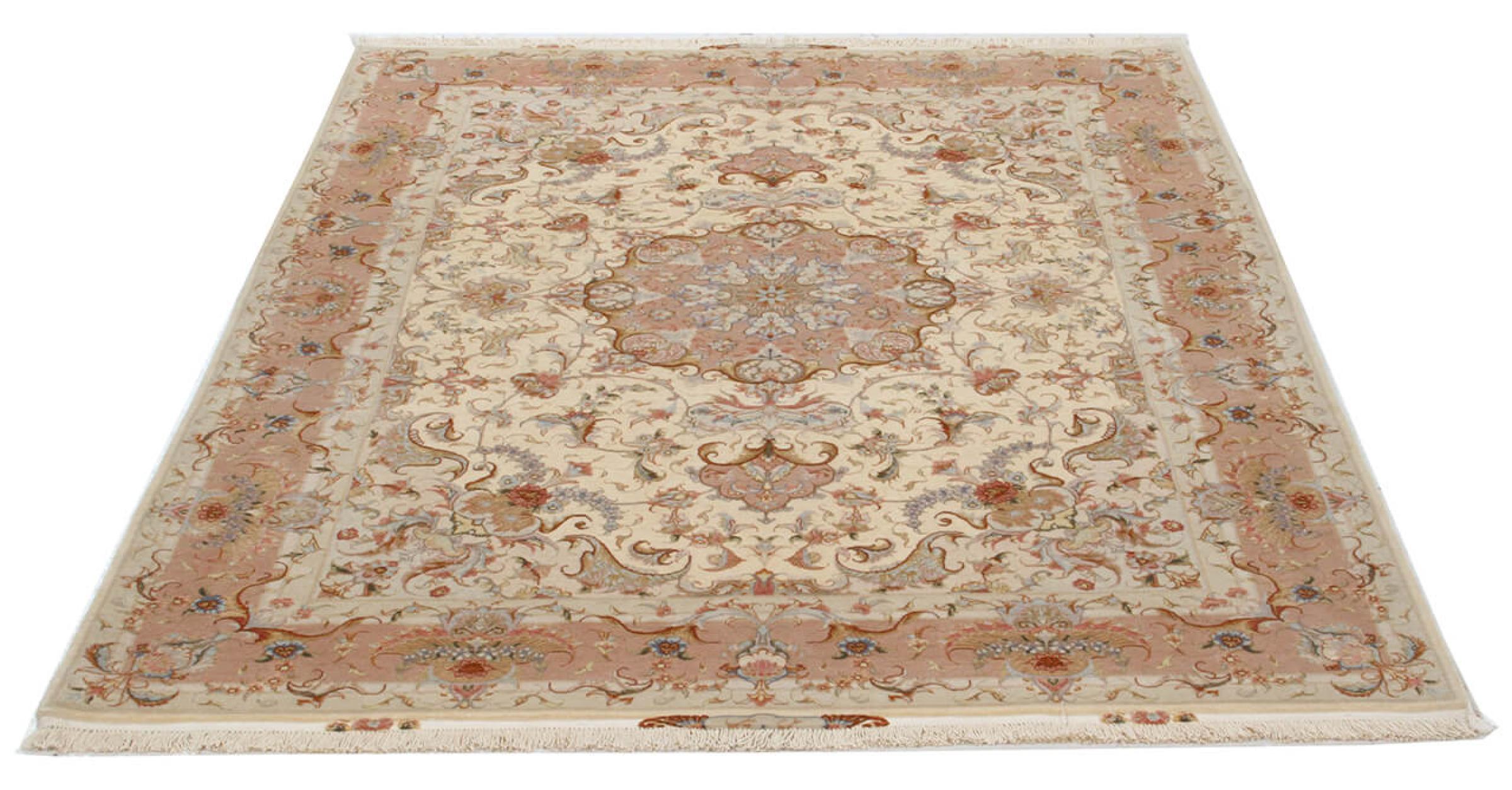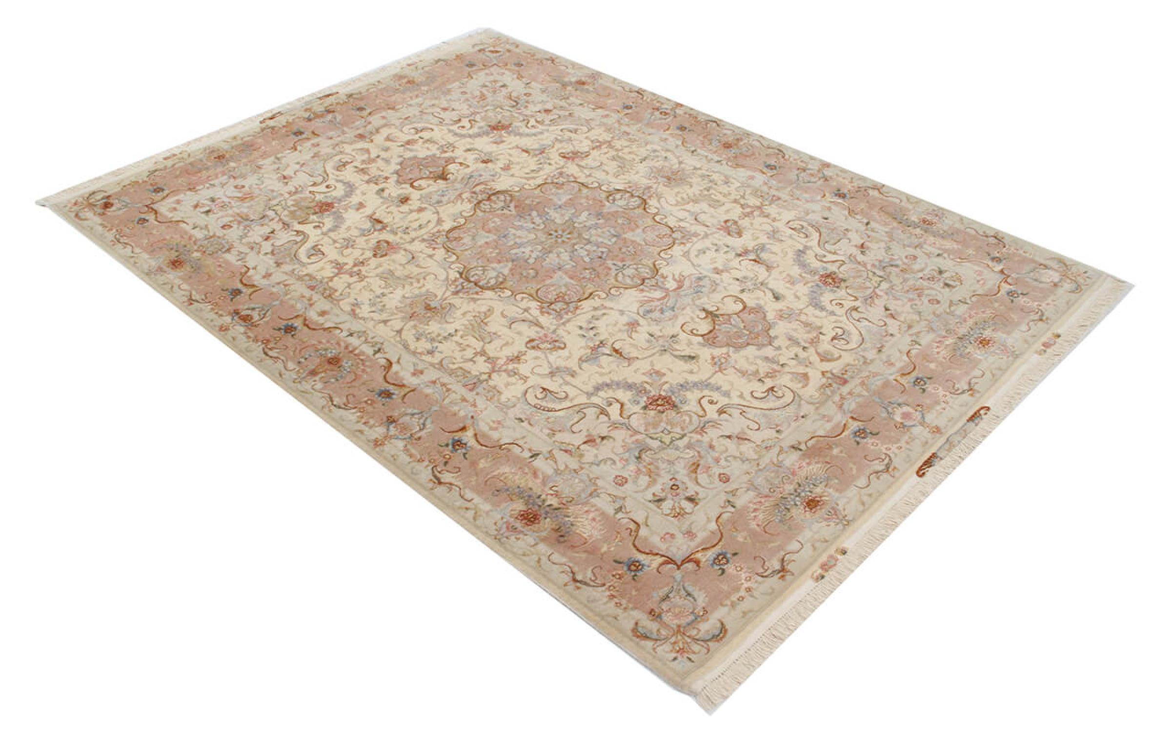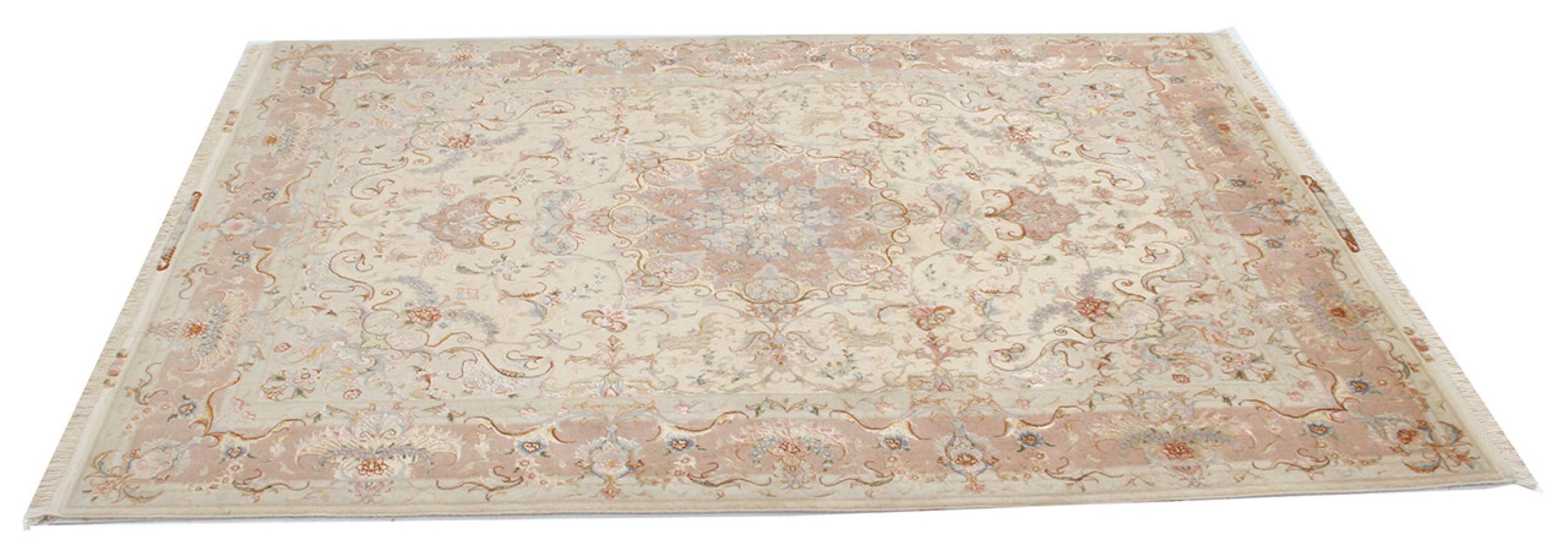 このタブリーズは、イラン北西部、同じ名前の職人都市タブリーズで手編みされました。 高品質のウールと天然シルクのみを使用しました。 そのパターンと装飾要素により、東洋を最も美しく反映しています。 タブリーズ絨毯は非常によく知られており、人気があります。 これらのカーペットの Raj 数は、長さ 7 cm にわたるノットの数を反映しています。 たとえば、タブリーズ 60Raj のノットは 1 平方メートルあたり約 700,000 です。